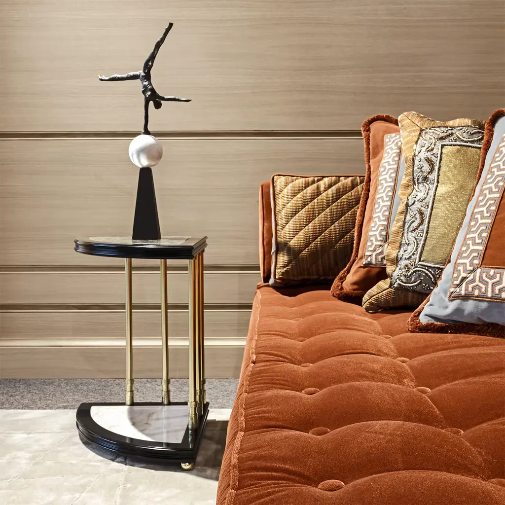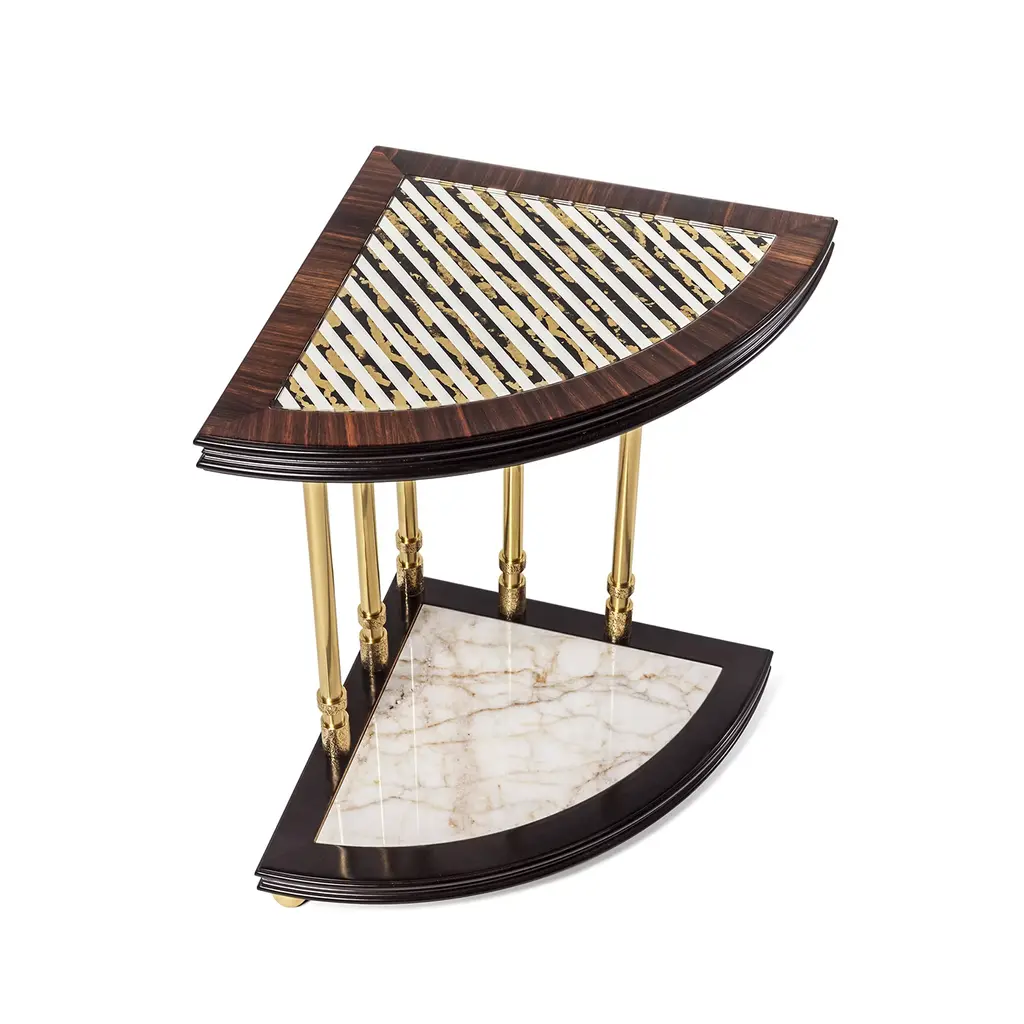 Lightness and versatility define this table with its characteristic fan shape, designed to complement any seat in the living area, whether alone or paired. The top, featuring a horn inlay, is connected to its ebony and marble base by five brass columns with chiseled details. Upon request it is also available in painted mirror top and a marble base.