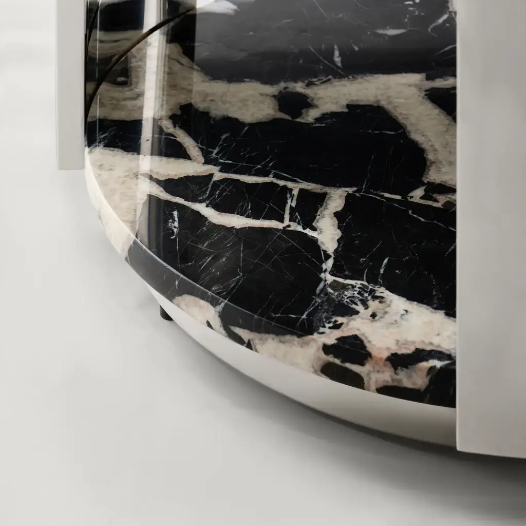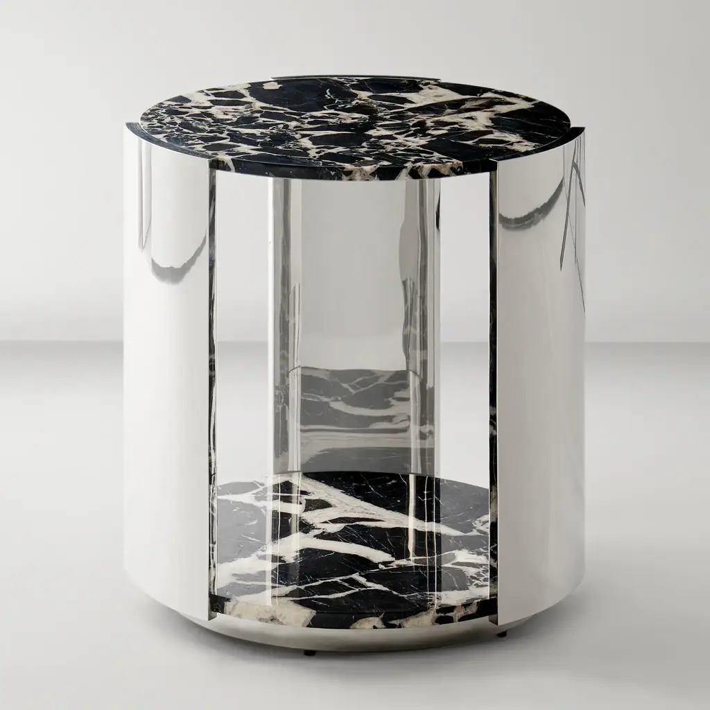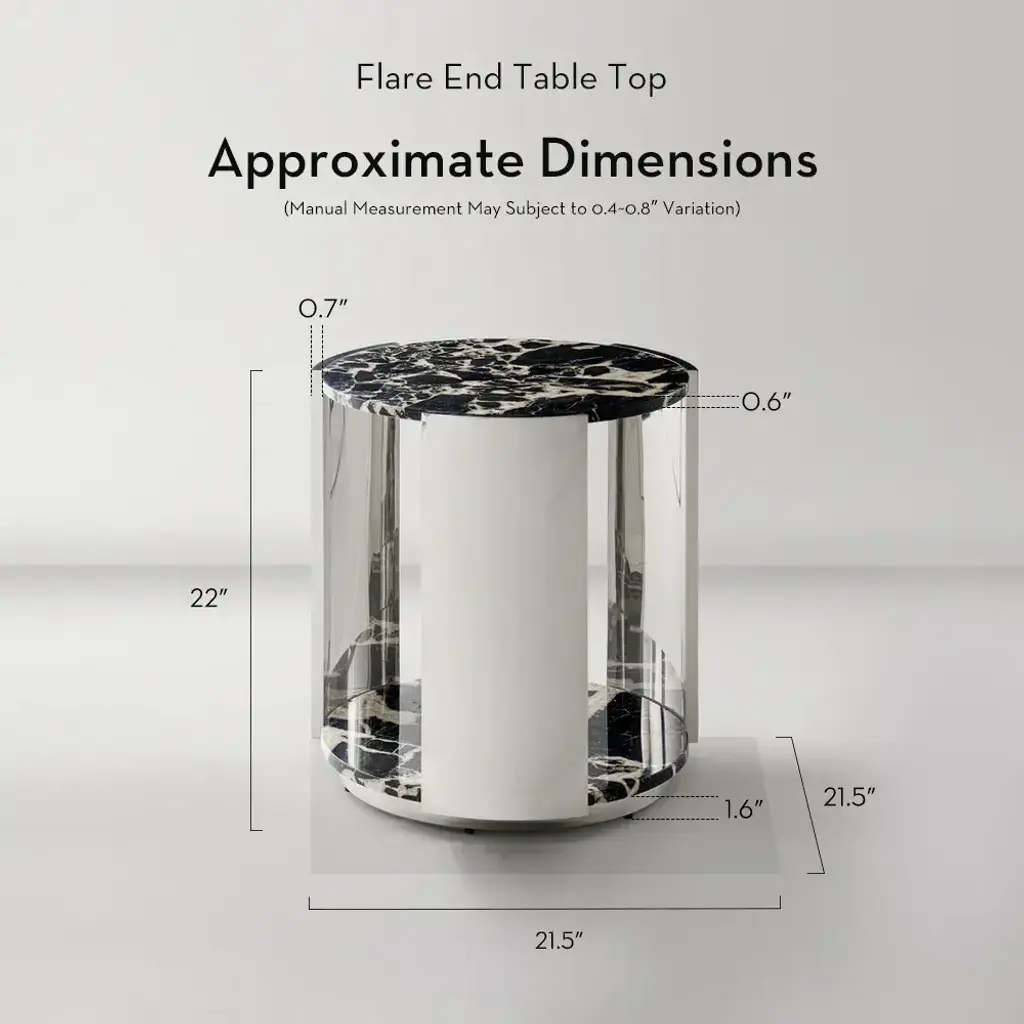 Elevate your space with the Flare End Table Top in Black. Featuring a natural Bvlgari black marble top and a polished stainless steel base, this piece creates a captivating interplay of dark, dramatic tones and gleaming metallics. Perfect for adding a touch of luxury and intrigue to any room. ZG Exclusive