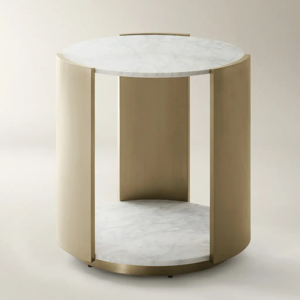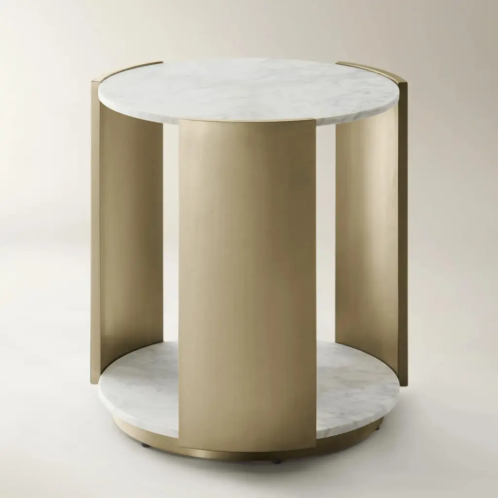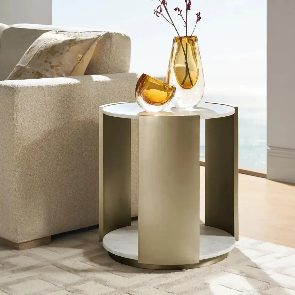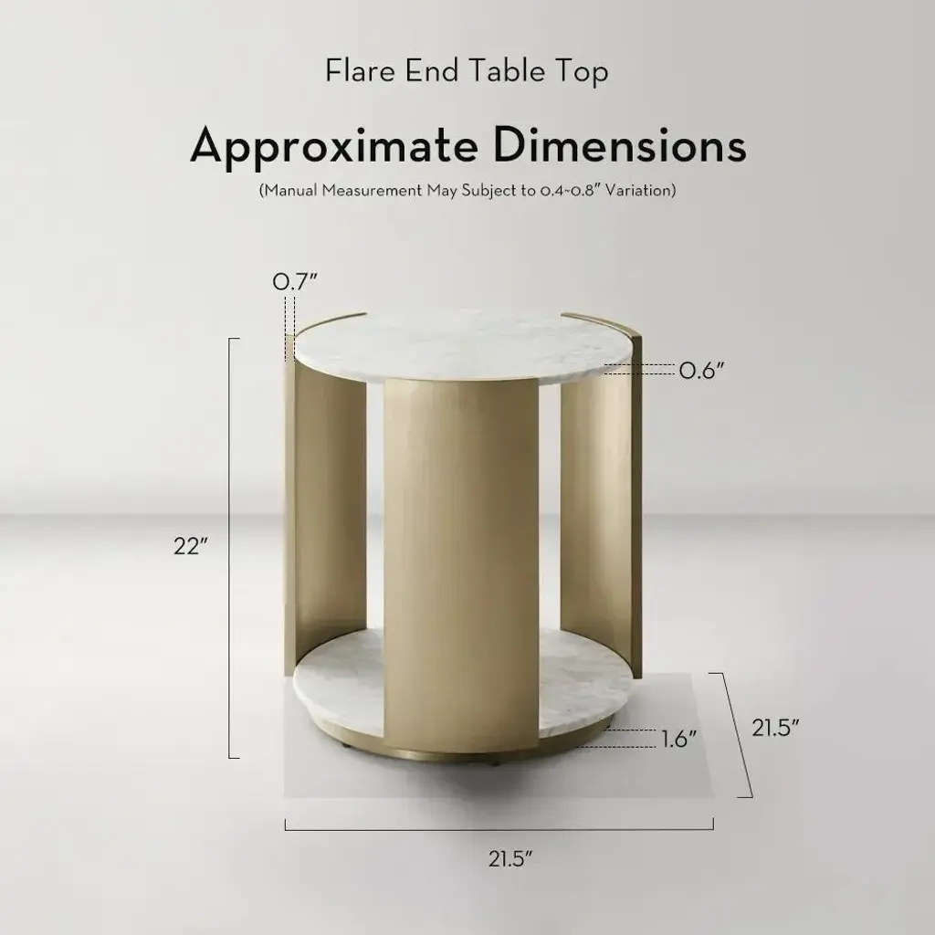 The Flare End Table Top in White is a refined addition to any space. Crafted with a natural white marble top and polished stainless steel base, this table blends sleek lines with timeless materials, creating an understated yet striking visual appeal.ZG Exclusive