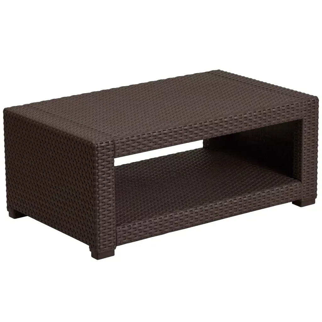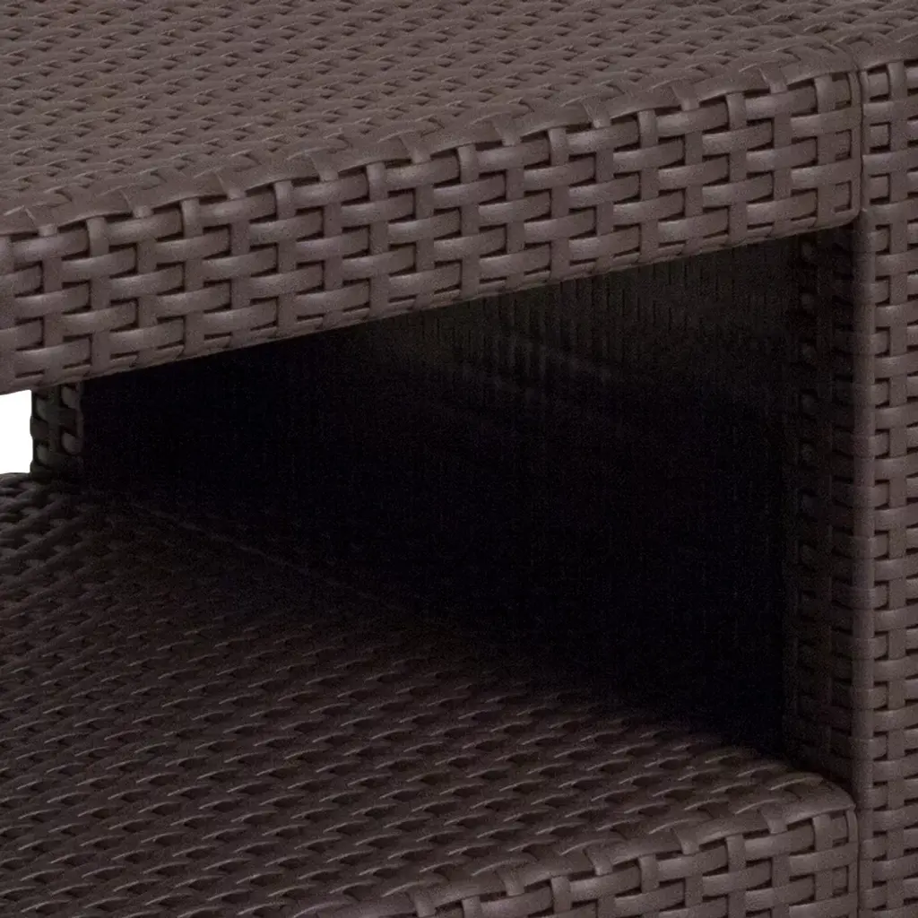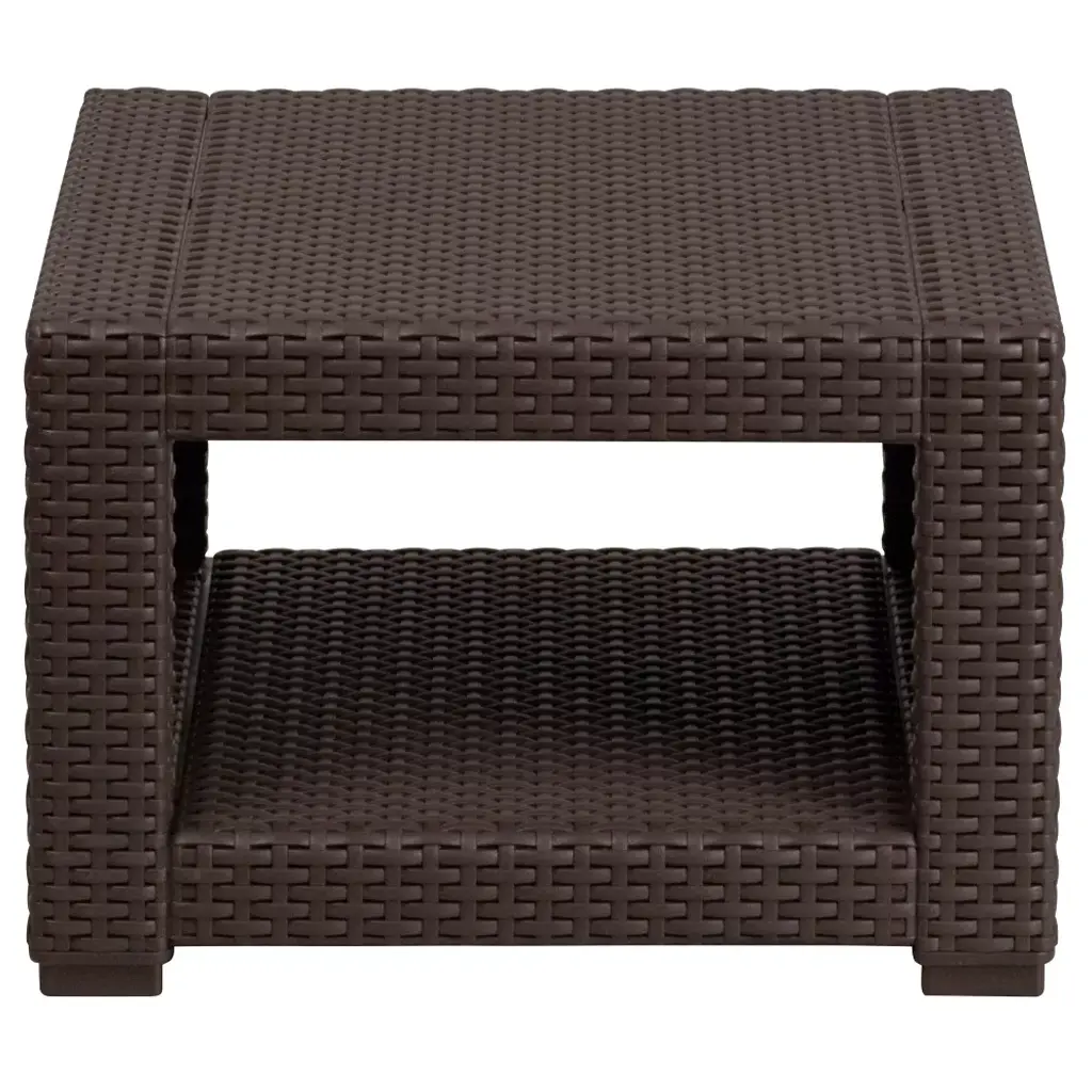 Complete your outdoor arrangement with this chocolate brown accent end table and add depth and texture to your outdoor look with a vase of summer flowers, some nautical decor or colorful glass sculptures. The durable resin frame offers a stylish appearance which replicates rattan giving you the perfect place to rest your wine glass or your tired feet. This richly colored table features a lower shelf for storing plates and glasses or your pool towels and sunscreen. No matter how you use it this table is a must have. Additional Features: Plastic Block Feet