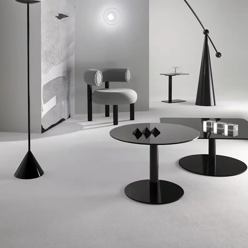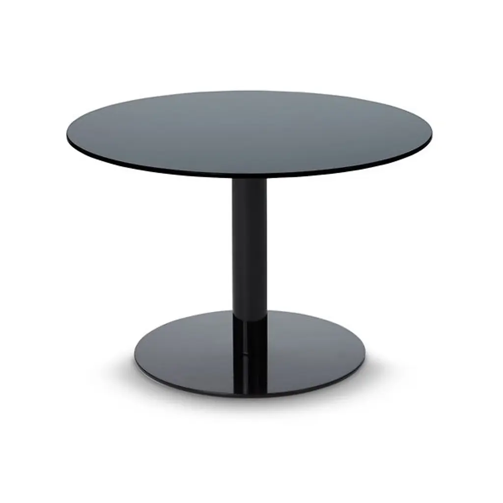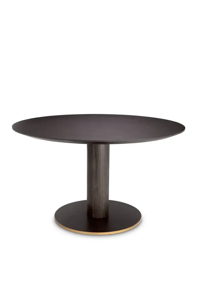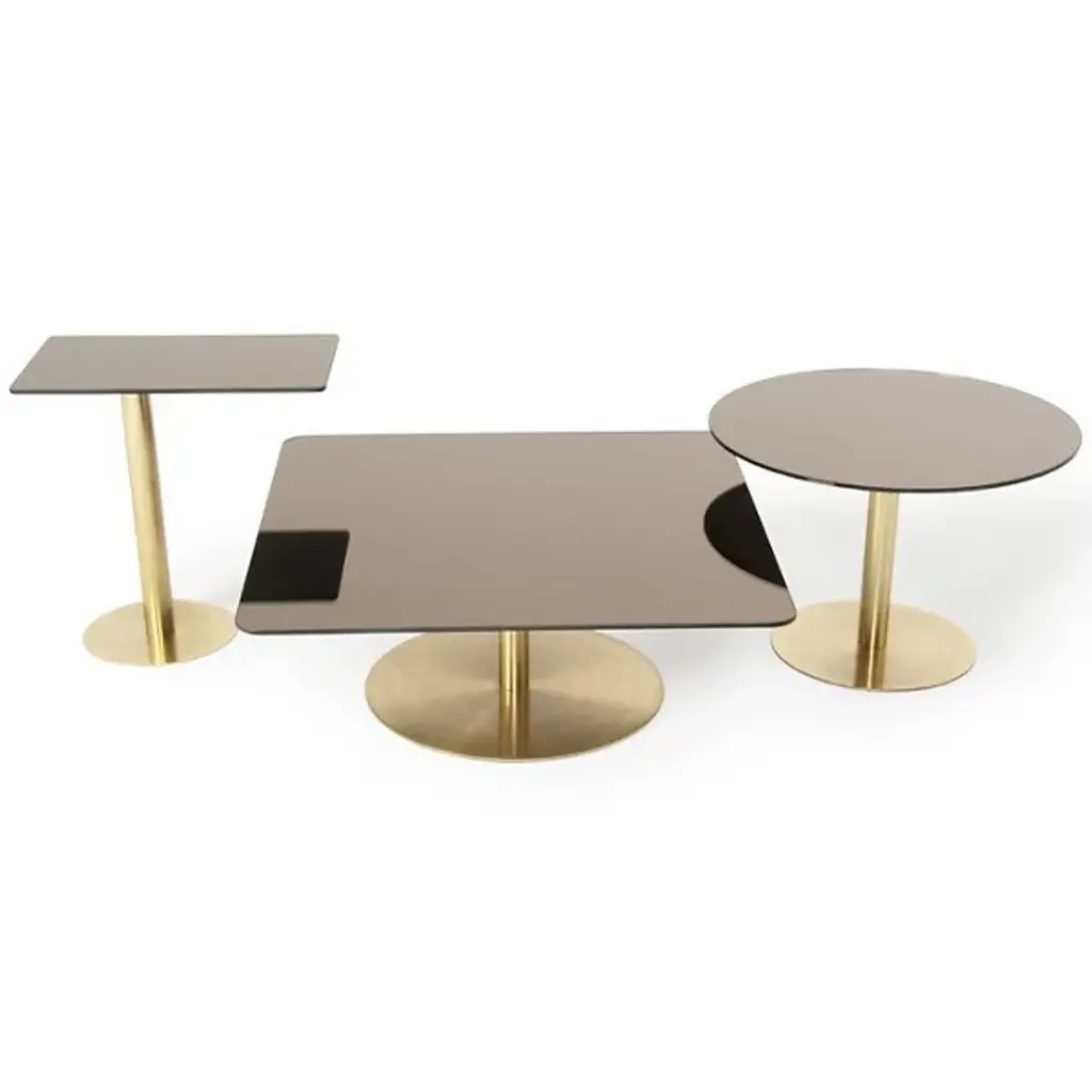 A highly reflective coffee or side table. The Flash Round Table from Tom Dixon features a minimalist look that makes sure its gleaming, golden surface is at the center of attention. A round, mirrored bronze top sits atop a similarly shaped base that is made out of a durable brass-plated steel, resulting in an uncompromising metallic surface. It has a high-end and luxurious appearance that makes it ideal for placing in an ultra-modern living room.