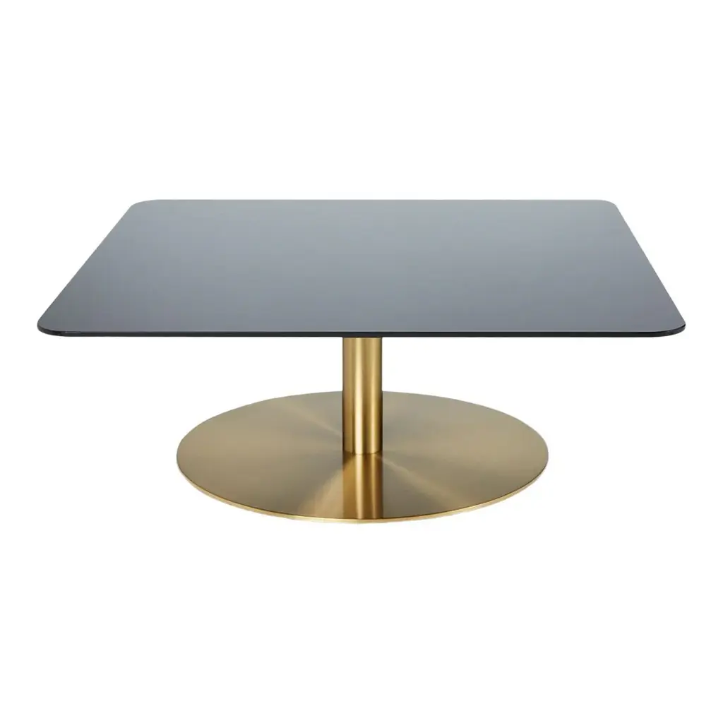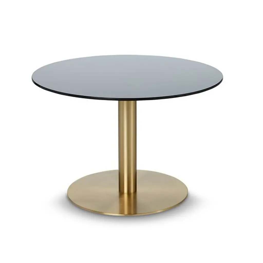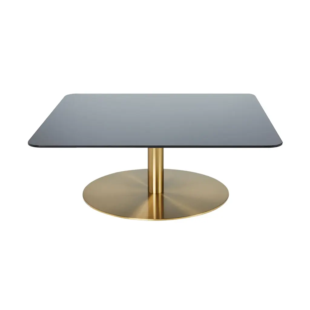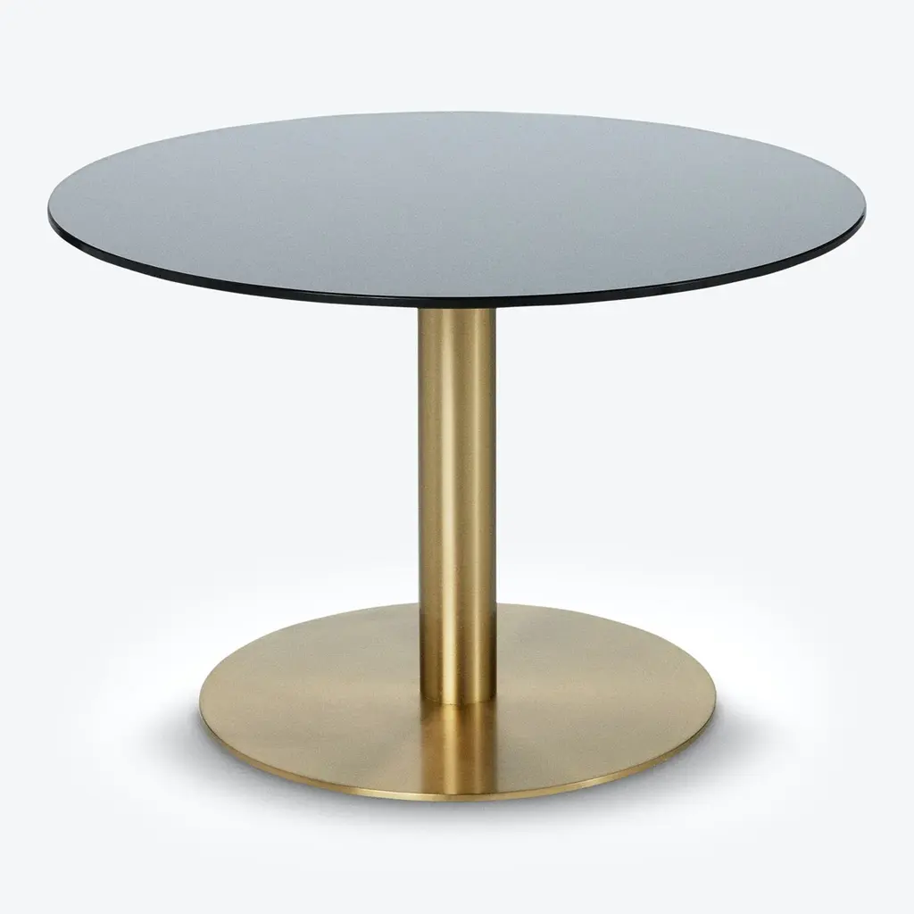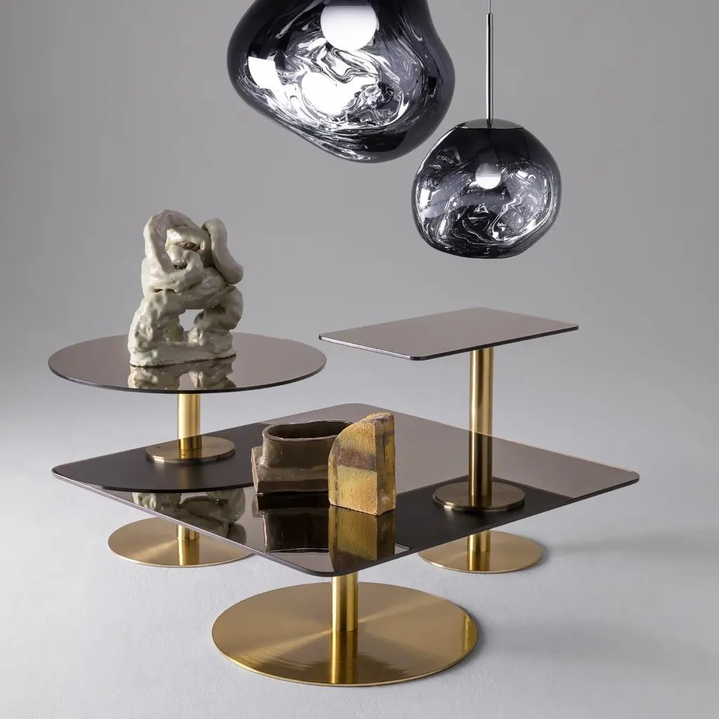 Translating a fondness for disco glam to the home front, designer Tom Dixon's Flash range of tables brings a lively gleam in any setting. As a cocktail or side table, the round model combines a metallic mirror surface in dark bronze with an antique-brass spool base. Dramatic as a singular addition or pump up the volume by clustering with the other multilevel tables in the series.