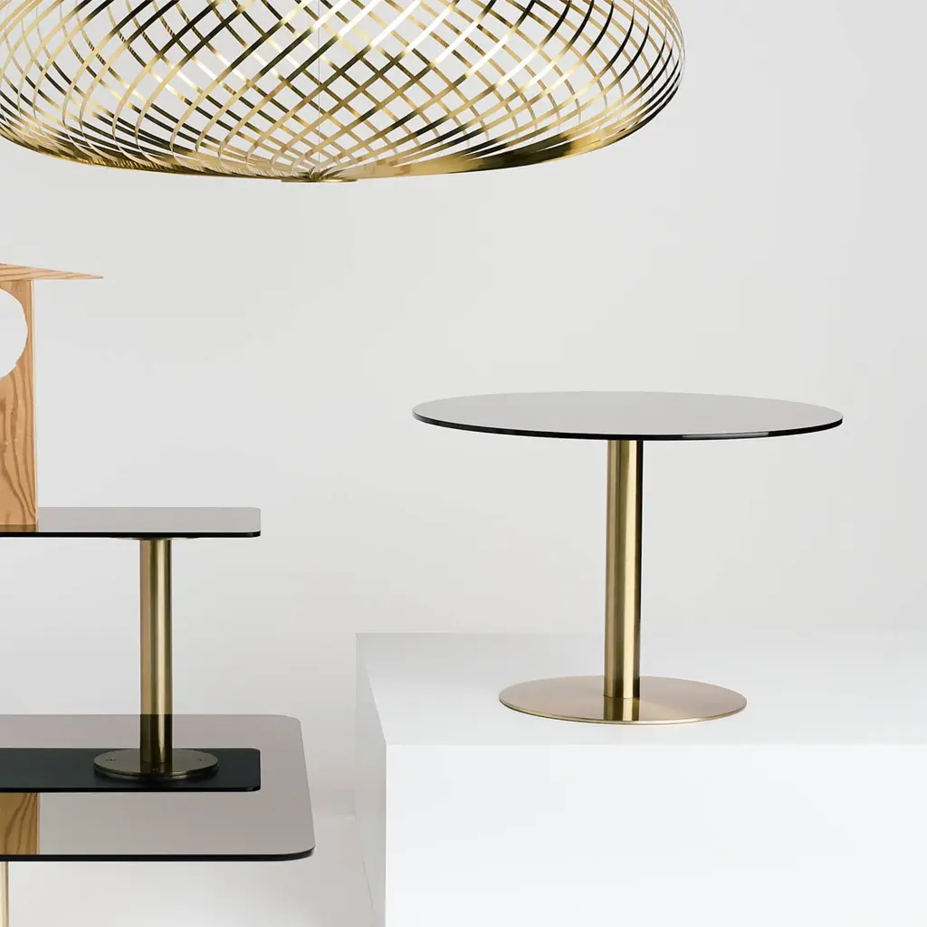 Translating a fondness for disco glam to the home front, designer Tom Dixon's Flash range of tables brings a lively gleam in any setting. As a cocktail or side table, the round model combines a metallic mirror surface in dark bronze with an antique-brass spool base. Dramatic as a singular addition or pump up the volume by clustering with the other multilevel tables in the series.