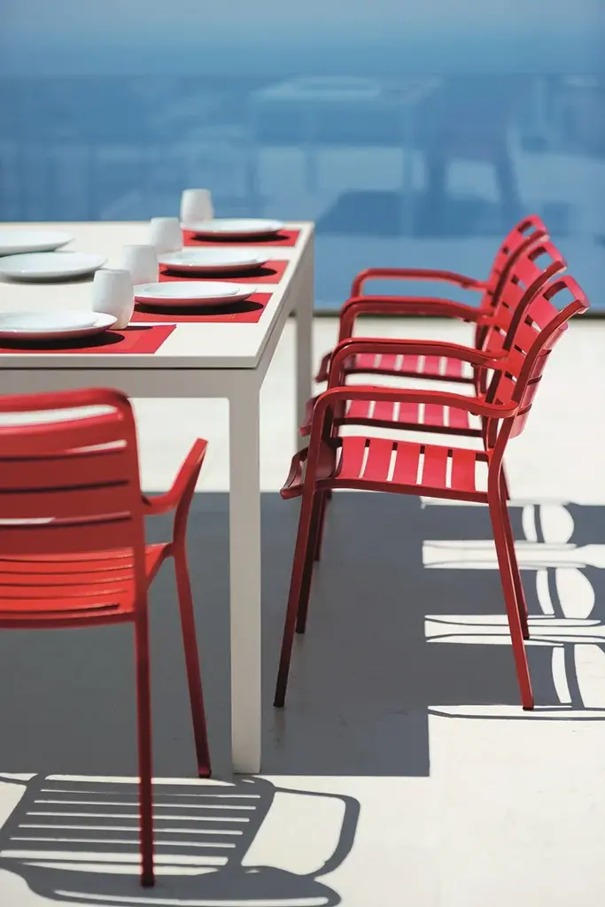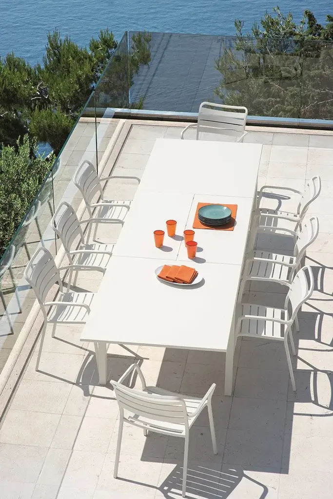 The most recent new entries in the Ethimo outdoor furnishing collection include the extendable Flat table. This stands out due to its truly huge size - up to 360 cm in length - combined with its very versatile suitability in terms of surroundings and layout. Its essential design is in fact perfect for use with various kinds of chairs and accessories, in either traditional or contemporary settings. Made from metal treated with processes that guarantee its durability, it is fitted with an extending mechanism in stainless steel. Flat comes in a wide range of colours, with epoxy coating specific for outdoors, using paints that respect the natural environment and user health.
