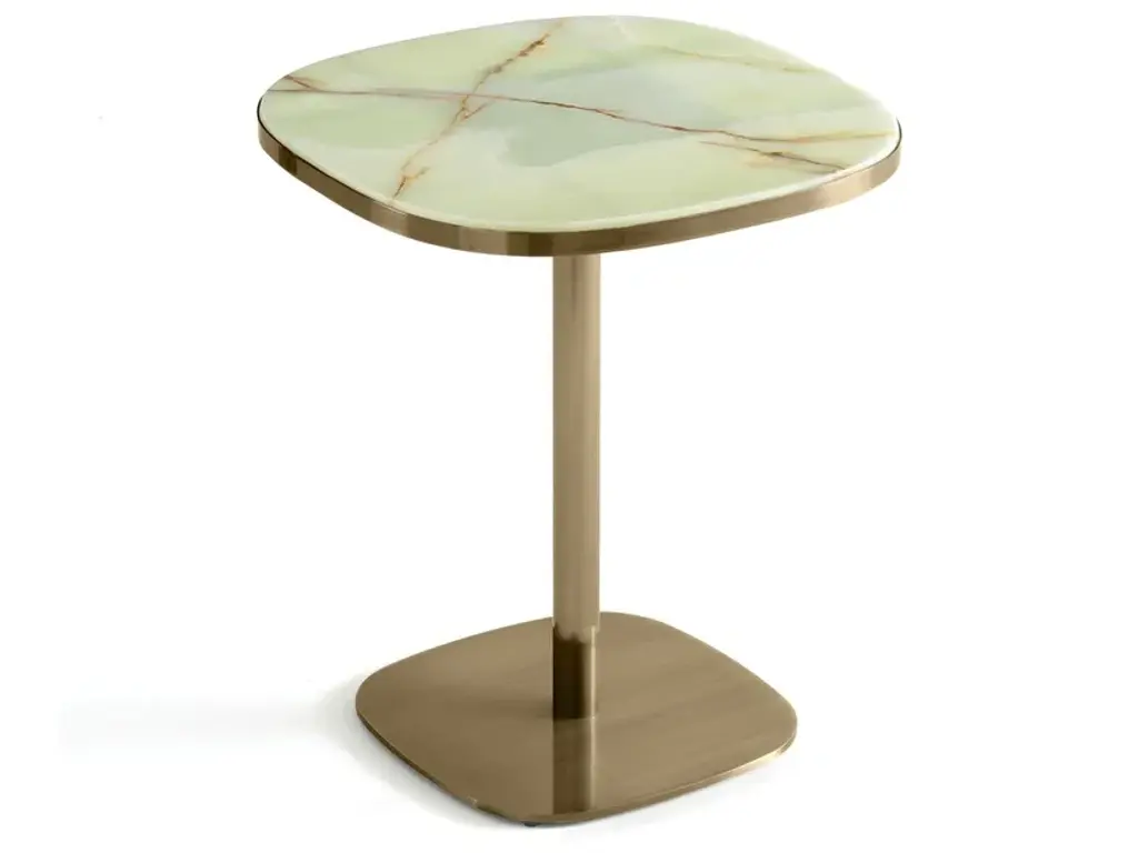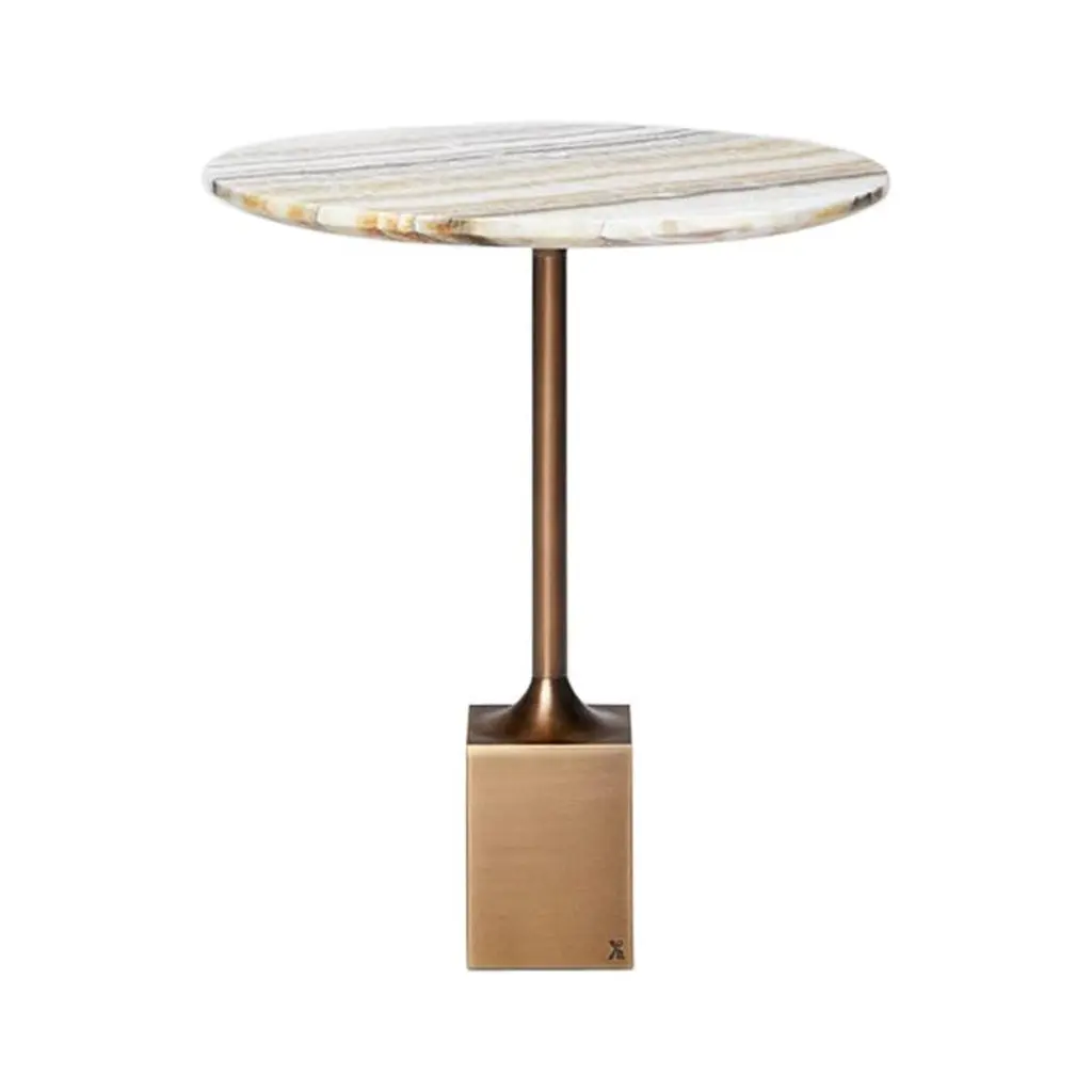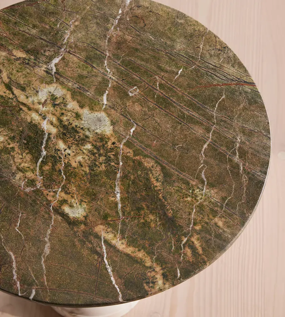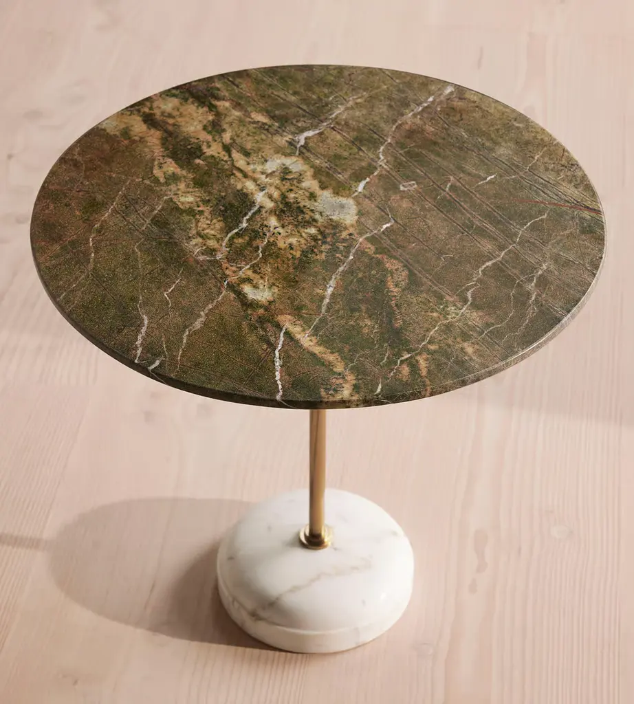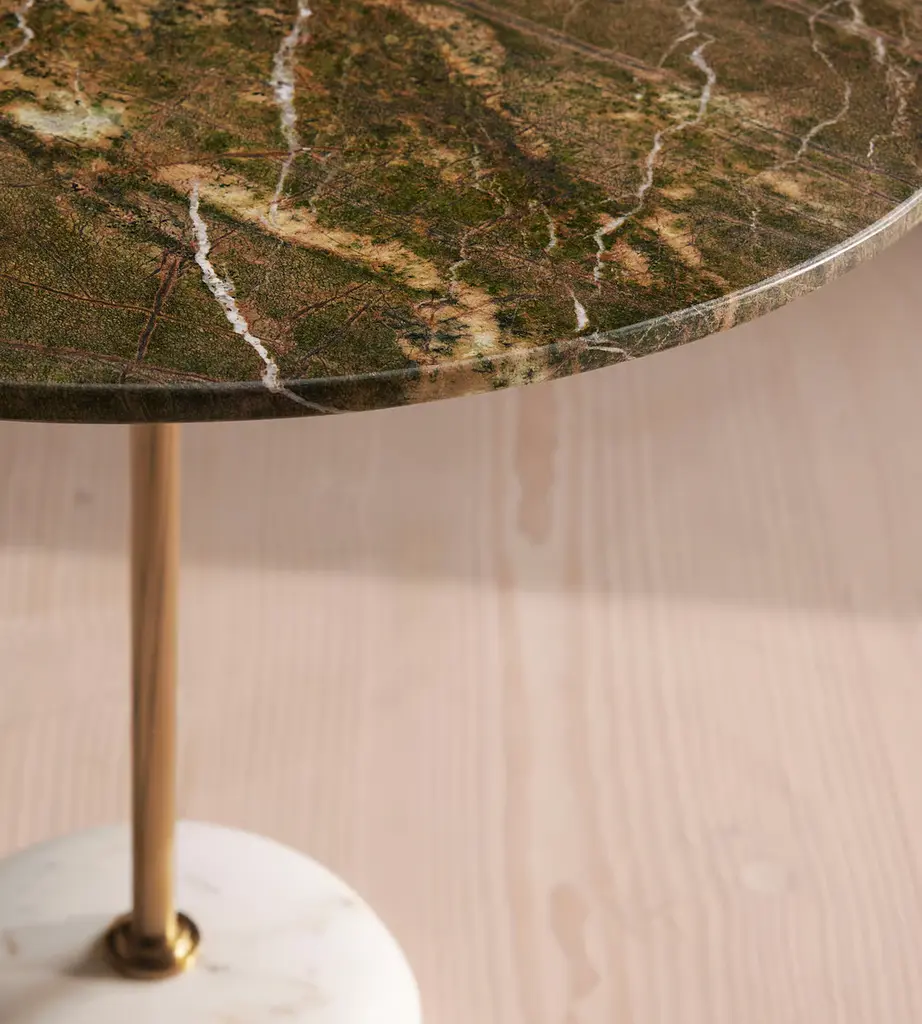 A solid Verde Bosque marble top and Banswara white marble base with unique veining means no two pieces are the same. Inspired by 180 House, the statement design of our Fleet side table showcases a contemporary mix of materials; from the combination of marbles sourced from India, to the central stem in antique brass.