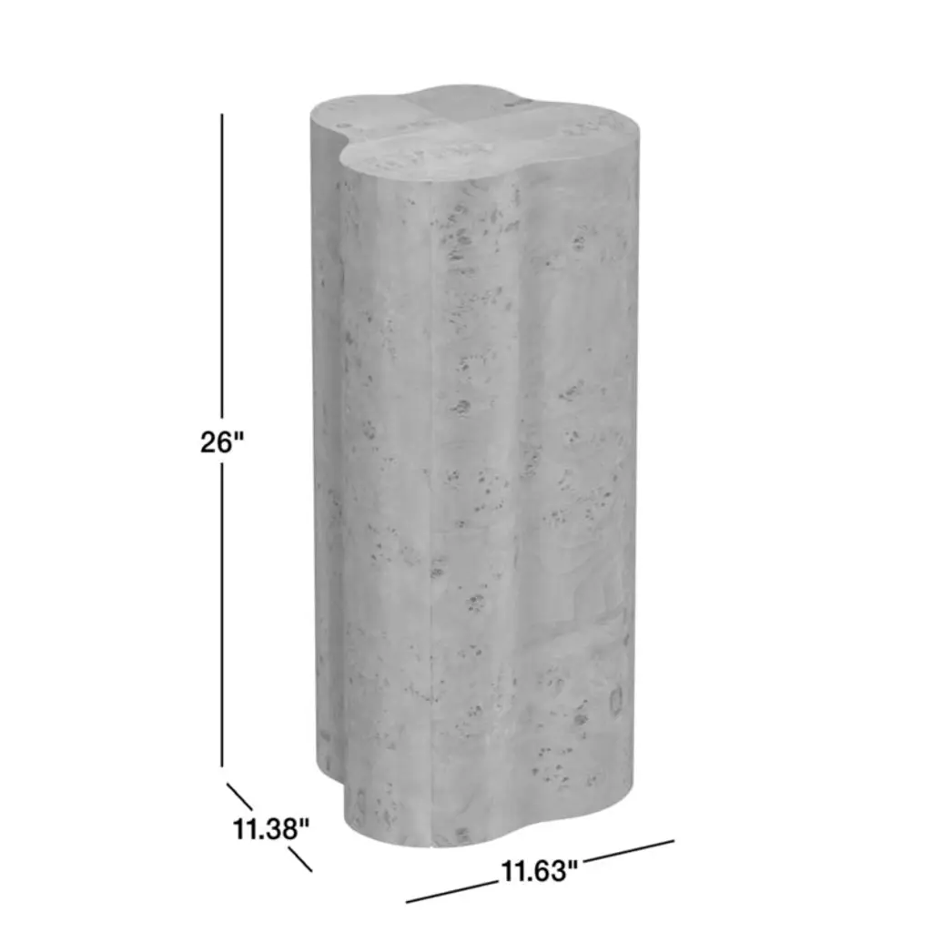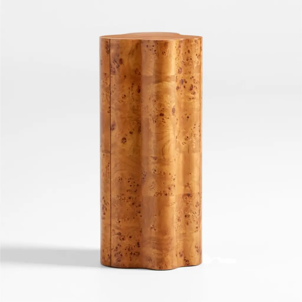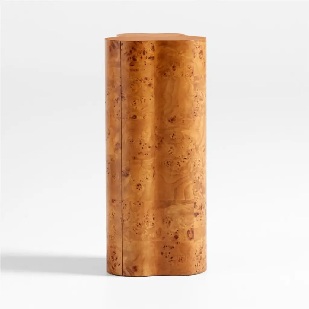 Organic curves rendered in wood burl veneer lend warmth and vitality to our modern and monolithic end table. The wood's naturally occurring pattern of swirling wood grain shows off beautifully on the accent table's undulating curves. Tall and columnar, the table rises to just the right height to hold a drink alongside a chair or sofa. A true conversation-starter, the Fleur burl wood table is a Crate & Barrel exclusive.
