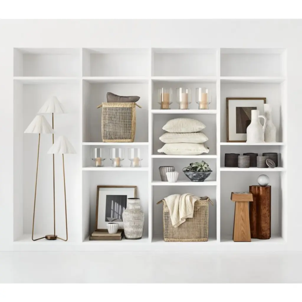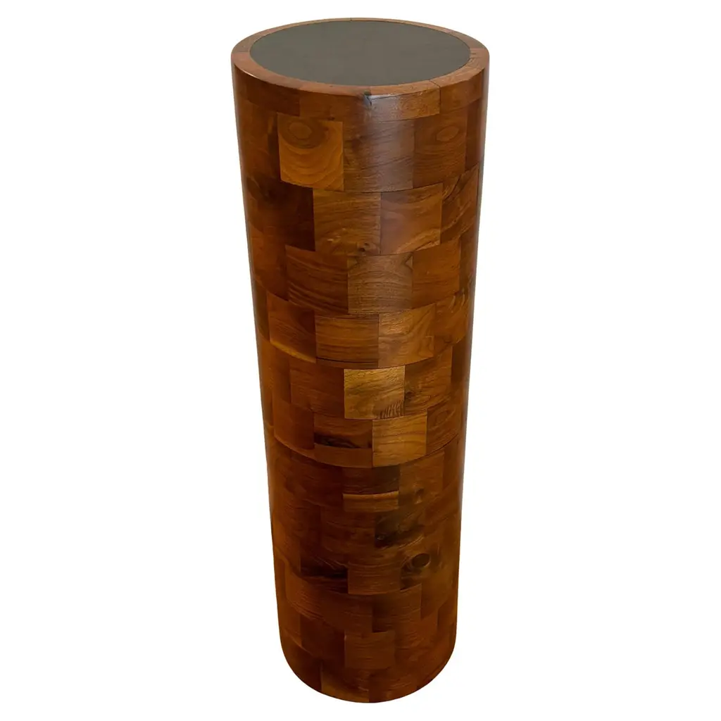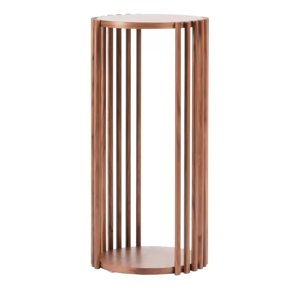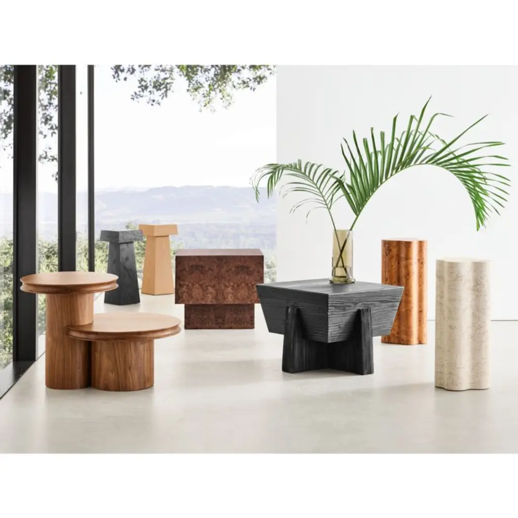 Organic curves rendered in wood burl veneer lend warmth and vitality to our modern and monolithic end table. The wood's naturally occurring pattern of swirling wood grain shows off beautifully on the accent table's undulating curves. Tall and columnar, the table rises to just the right height to hold a drink alongside a chair or sofa. A true conversation-starter, the Fleur burl wood table is a Crate & Barrel exclusive.