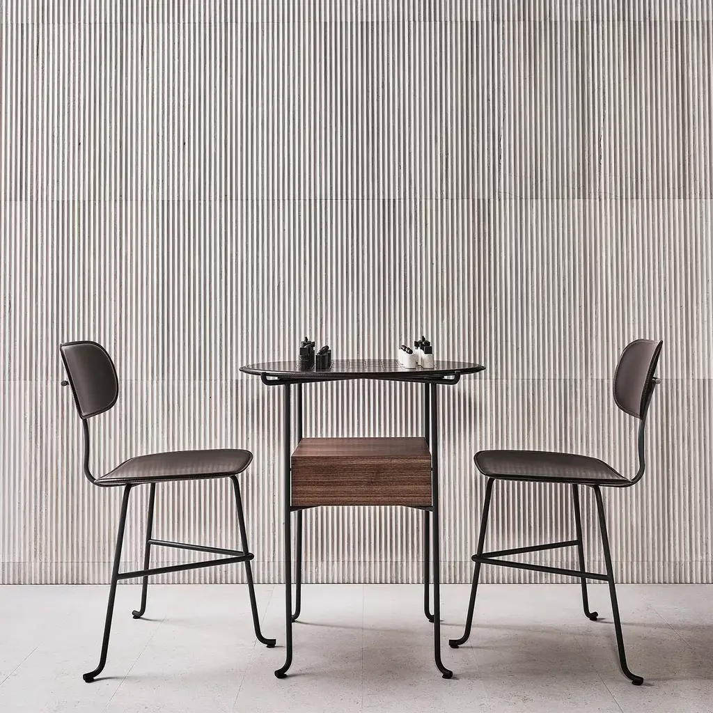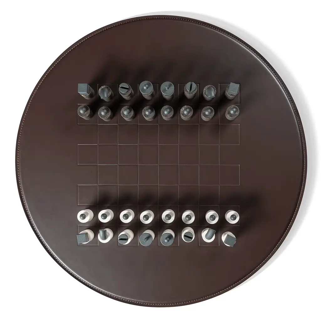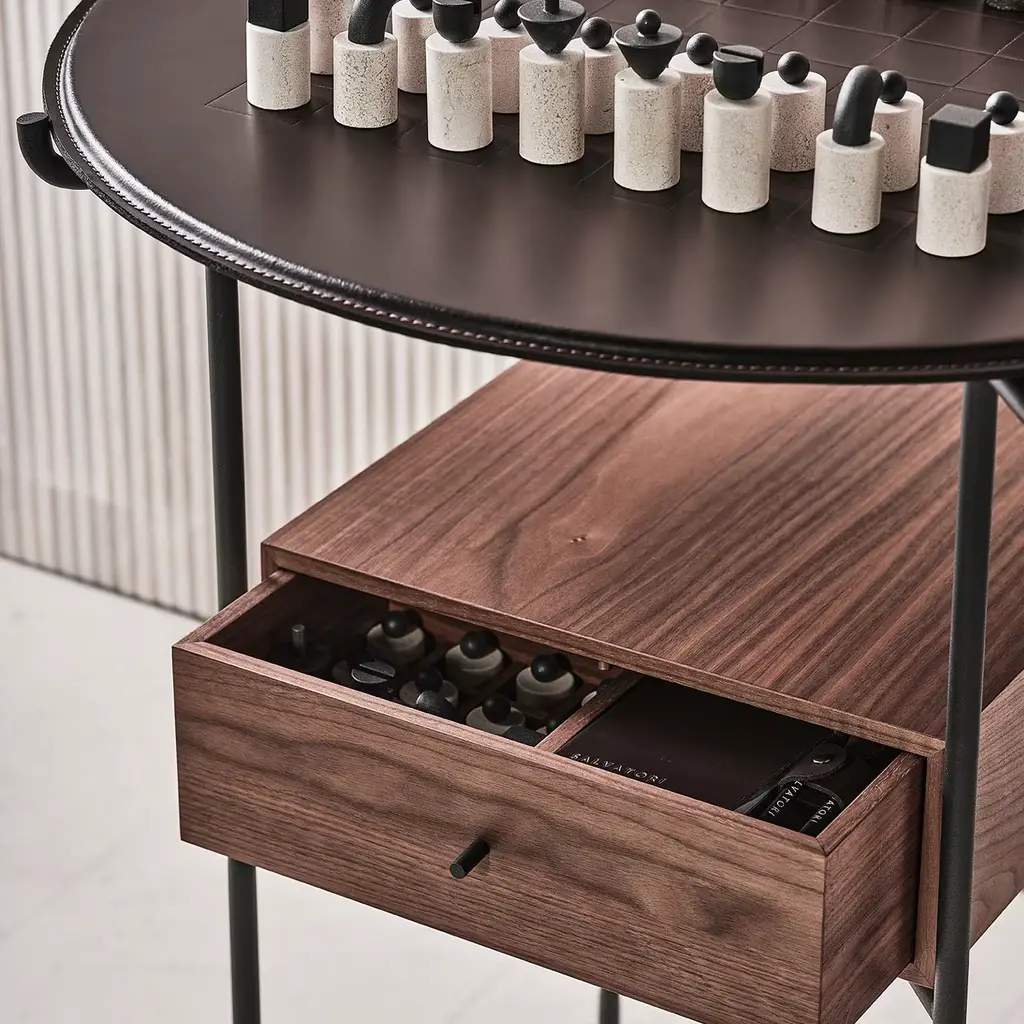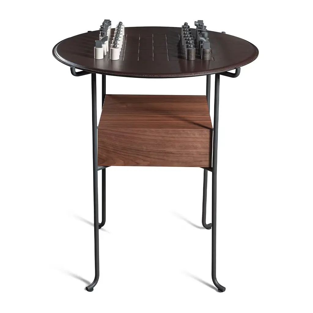 A one-of-a-kind creation that is a pure expression of refined craftsmanship, this round table by Luca Nichetto features a leather top that elegantly flips to reveal a chessboard in natural stone, blending functionality with sophistication. The walnut drawer, nestled between the sleek Grey Graphite legs, holds marble chess pieces and a notepad for an elevated gaming experience. This table introduces an air of timeless elegance and playful charm to any refined space.