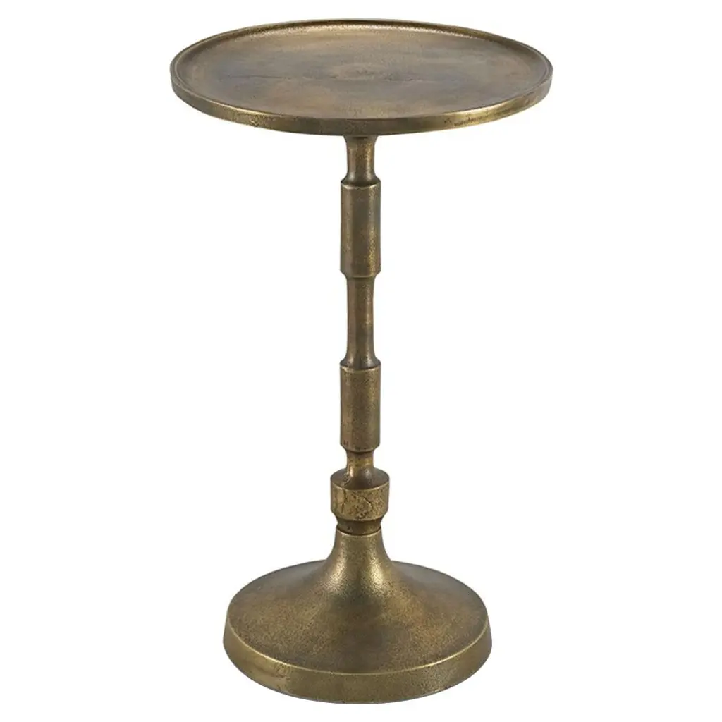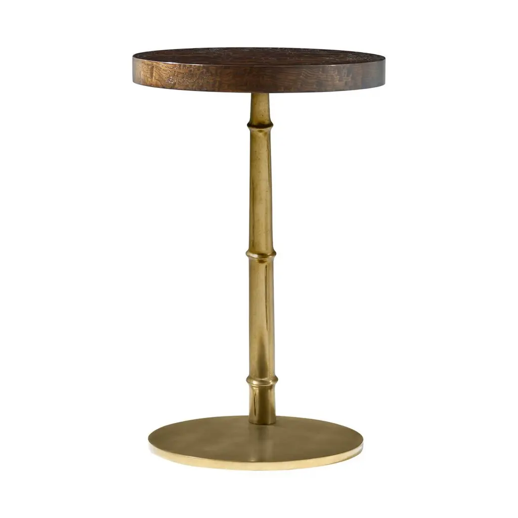 With a Tamo Ash burl veneer round top above a slender, sculptural leaning faux bois frame on a flat disc base.Dimensions: 14" W x 14" D x 21.75" HShown in Pyramid Brown with Satin Brass Finish