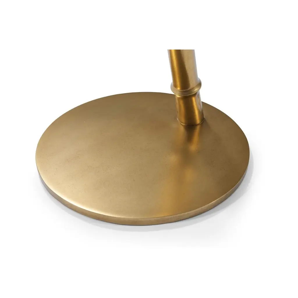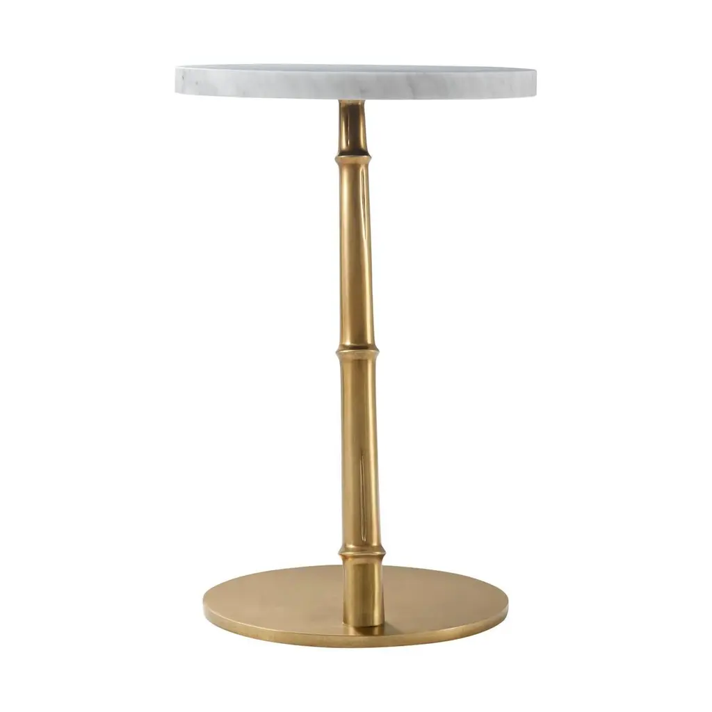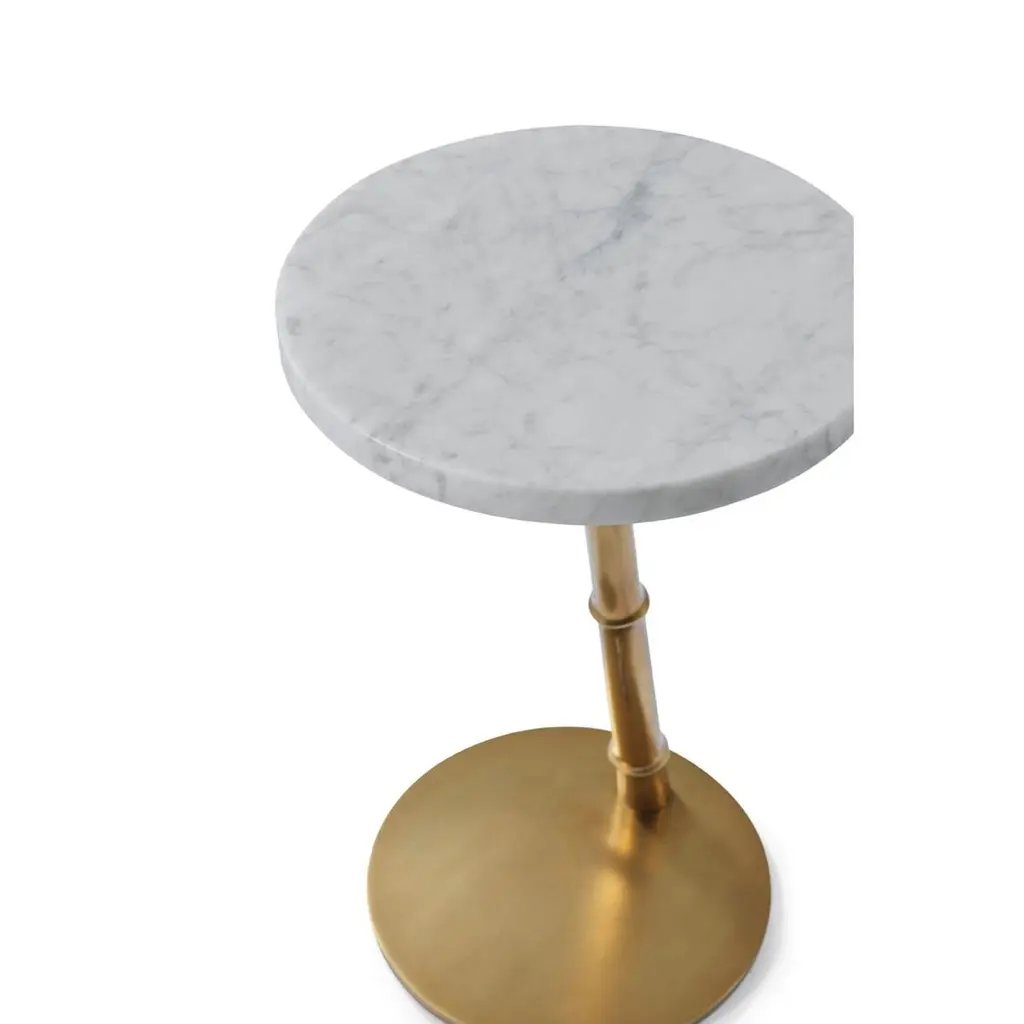 With a honed white Bianco Carrara marble round top above a slender, sculptural leaning faux bois frame on a flat disc base.Dimensions: 14" W x 14" D x 21.75"Shown in a station brass finishMarble has natural variations and its figure may vary from piece to piece