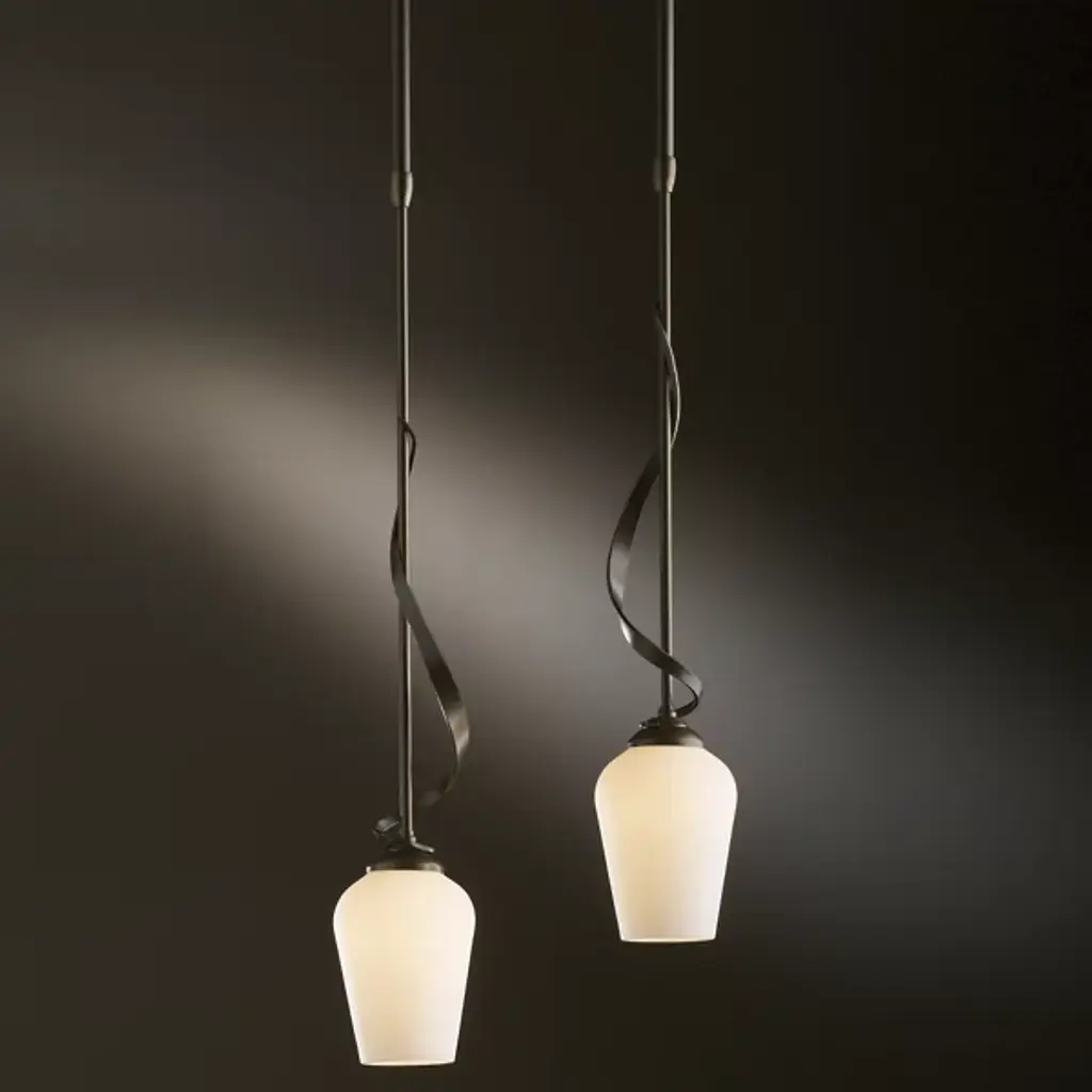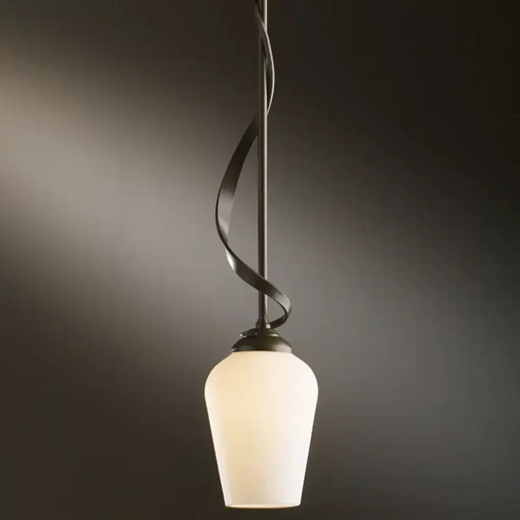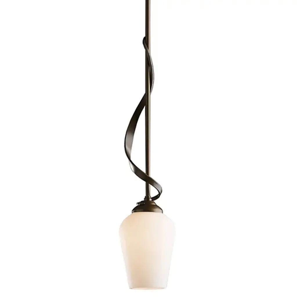 Featuring a soft whisper of the feminine, the Hubbardton Forge Flora Adjustable Mini Pendant has a rounded, hand-forged wrought iron accent that gently winds its way up the fixture's stem. This natural look is a lovely accent to the soft contemporary kitchen or bar area, complementing other organic pieces such as marble countertops, wood cabinets and more.