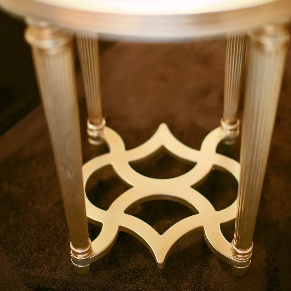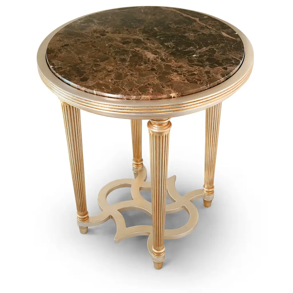 This elegant side table fits perfectly in a small entryway or other tight space. Its sophisticated design is the perfect complement to a vintage or classic décor. Its champagne-colored base is also available in gorgeous silver leaf, while its marble top can be substituted with a brass-mirrored option. Made in Italy by a family-run company with over 50 years' experience.