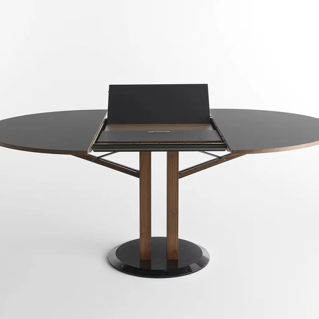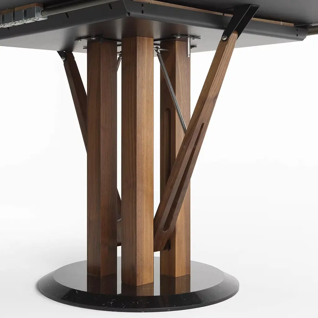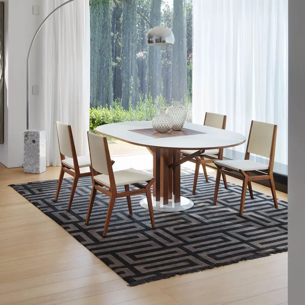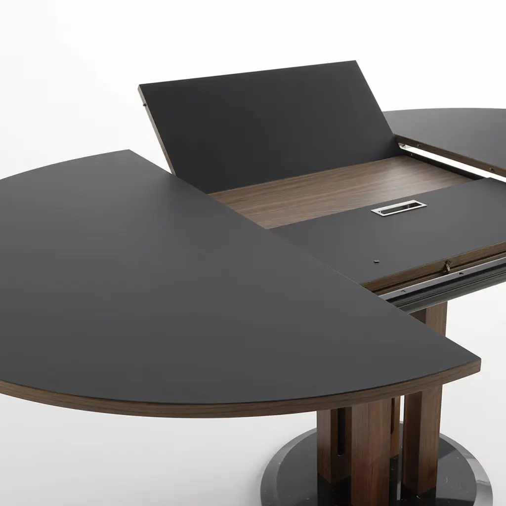 This superb and extremely modern table is a functional piece of design that can extend to a maximum total measure of 178 x 120 x H 75 cm. It features a top and extensions made of Fenix NTM®, a new material whose surface features a low-reflective quality and a soft-touch effect. Legs, extension leaf, and edges are crafted of solid Canaletto walnut, adding a plush and refined accent to this striking piece. Because of its surface features, this table is suitable for various design applications, including residential and commercial interiors.