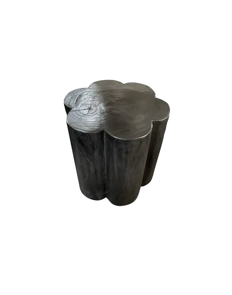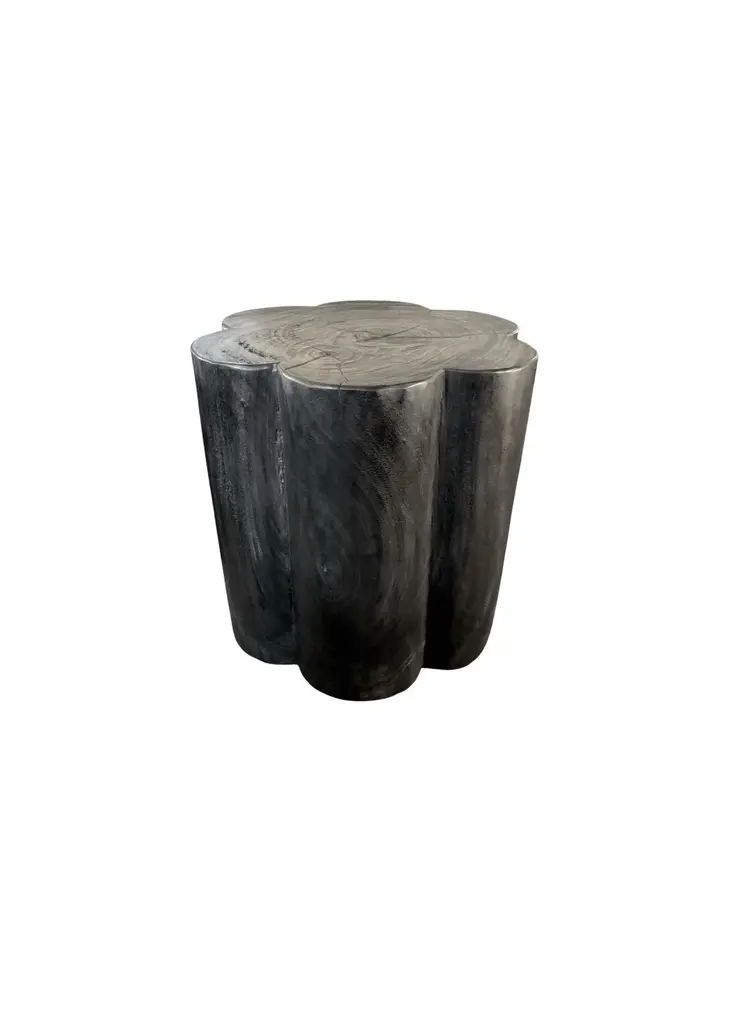 A wonderfully sculptural flower shaped side table. Its rich black pigment was achieved through burning the wood three times. Its neutral pigment and subtle wood texture makes it perfect for any space. A uniquely sculptural and versatile piece certain to invoke conversation. This table was crafted from a solid block of mango wood and has a smooth texture.