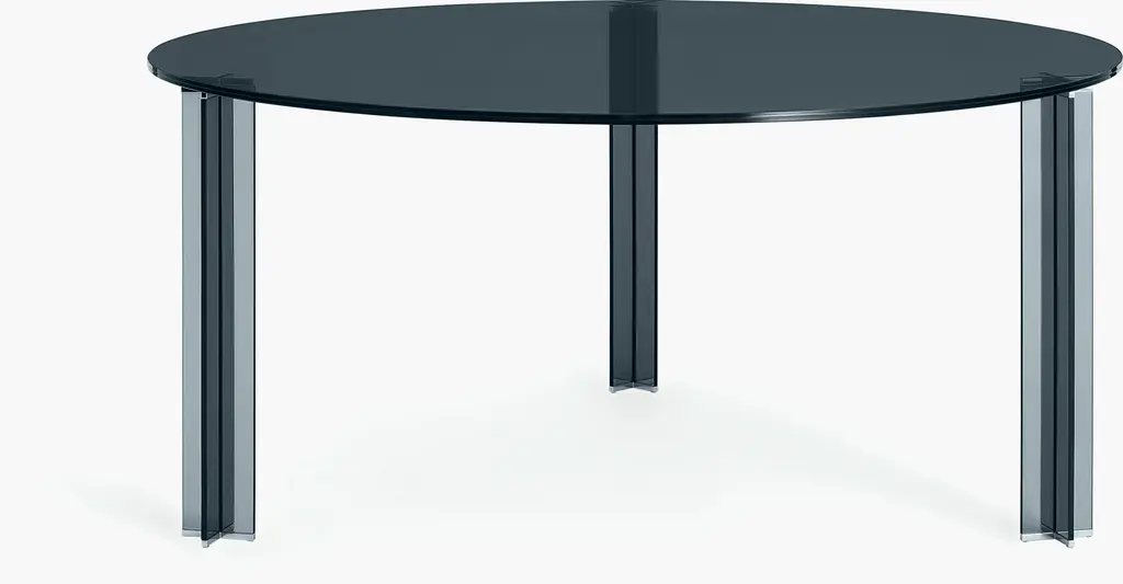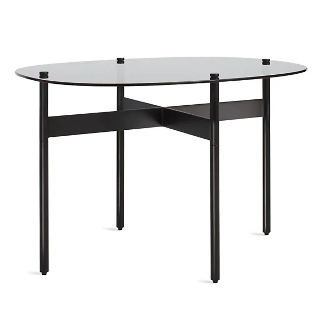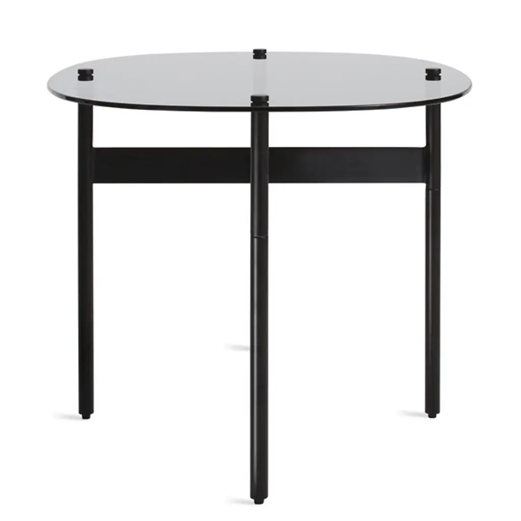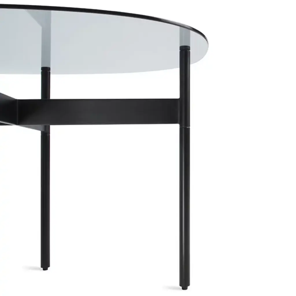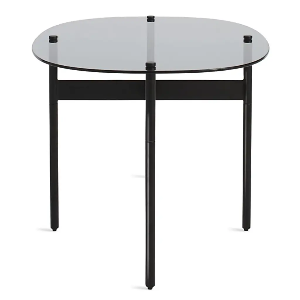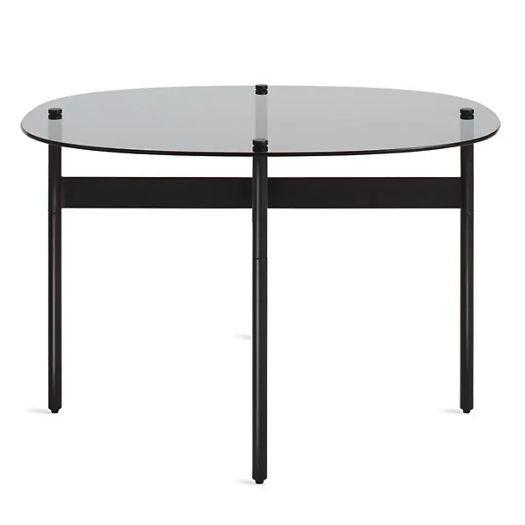 The Flume Side Table from Blu Dot uses the same through-glass mounting technique as the coffee table but scales it down for beside-seating placement. The compact proportions make it ideal for positioning next to chairs or at the end of sofas where you need surface space without bulk. Steel legs pierce the tempered glass top to create structural connections that feel more integrated than typical glass-to-metal joins. The powder-coated steel base provides contrast against the transparency above while maintaining stability through the leveling feet.