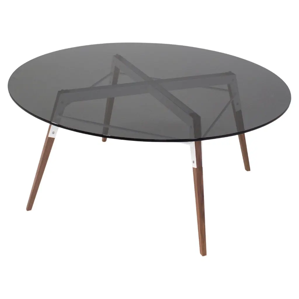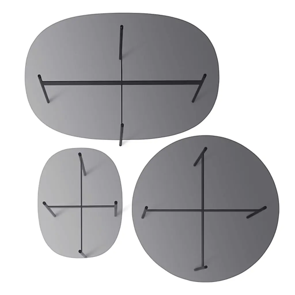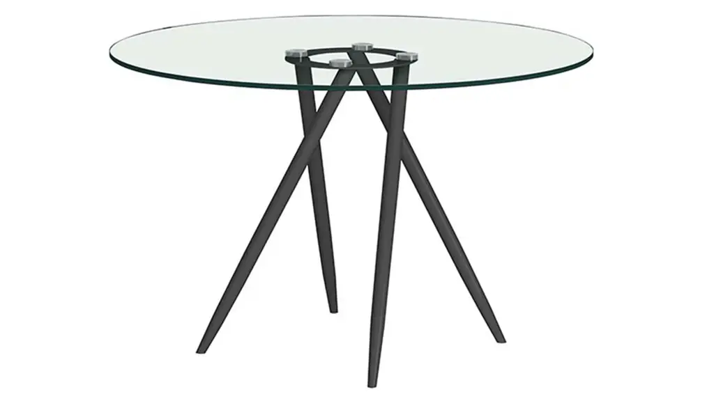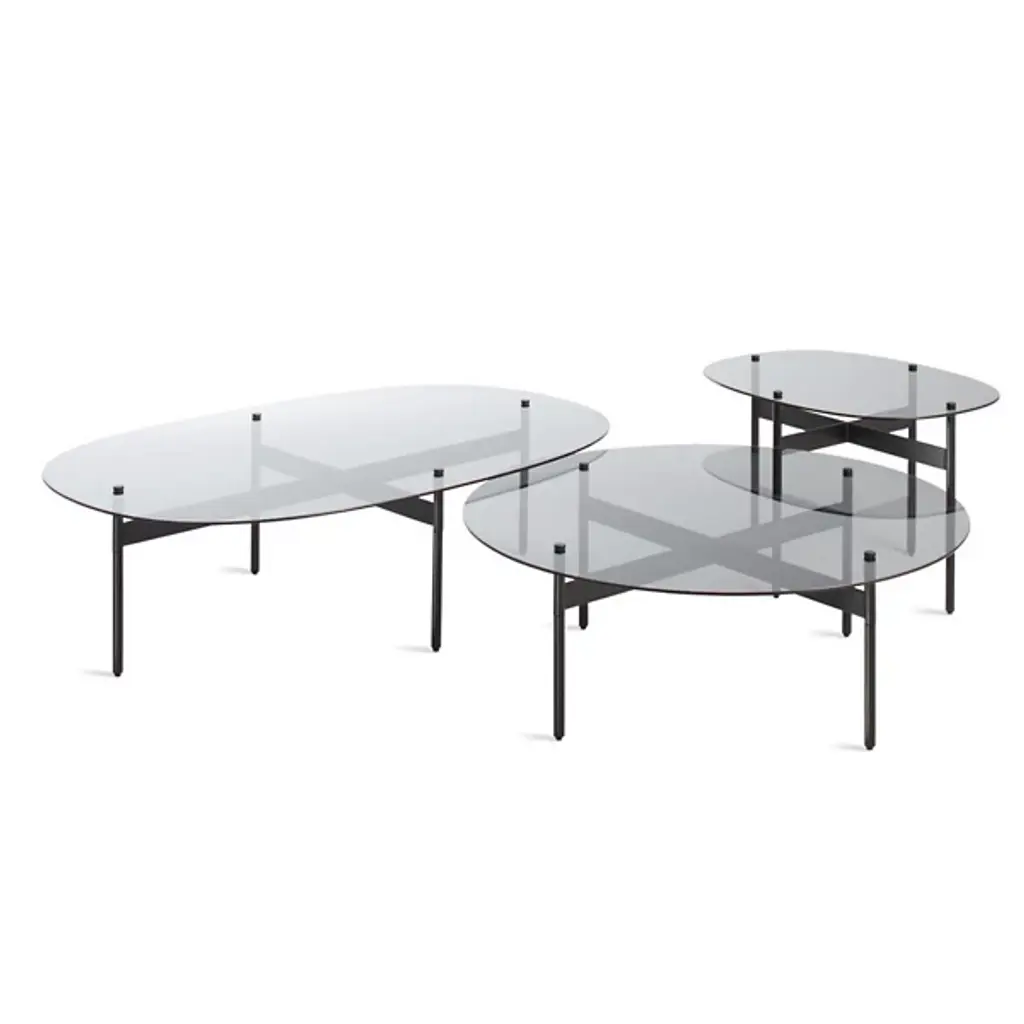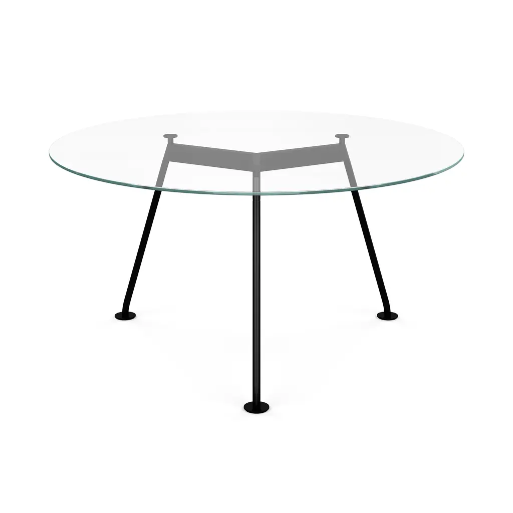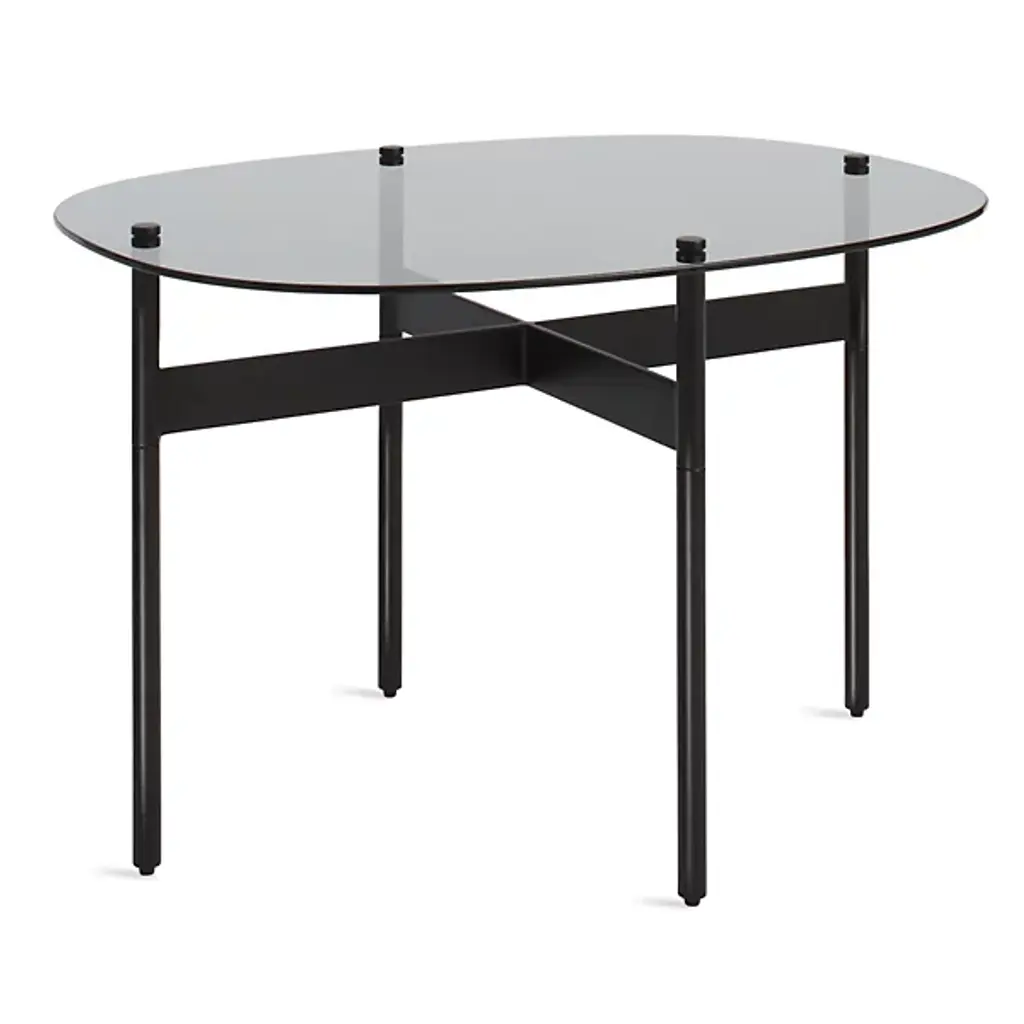 The Flume Side Table from Blu Dot uses the same through-glass mounting technique as the coffee table but scales it down for beside-seating placement. The compact proportions make it ideal for positioning next to chairs or at the end of sofas where you need surface space without bulk. Steel legs pierce the tempered glass top to create structural connections that feel more integrated than typical glass-to-metal joins. The powder-coated steel base provides contrast against the transparency above while maintaining stability through the leveling feet.
