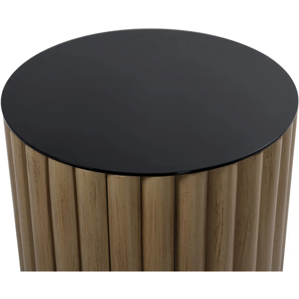 Fluted Barrel - Natural Side Table - Black Glass Table Top
