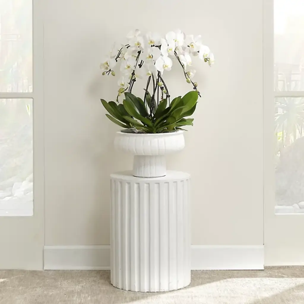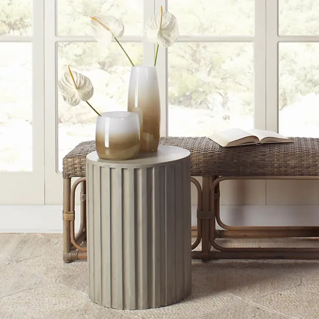 The Fluted Column Side Table from Jamie Young Co. draws inspiration from classical Roman architecture, with vertical grooves running along its cylindrical form. This handcrafted cement side table features a hollow center reducing weight while maintaining structural integrity. The textured surface creates natural shadow play as light moves across the channels throughout the day. Made for indoor use, the table's antiqued finish develops character over time, making each piece unique.