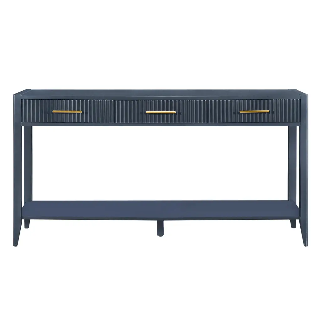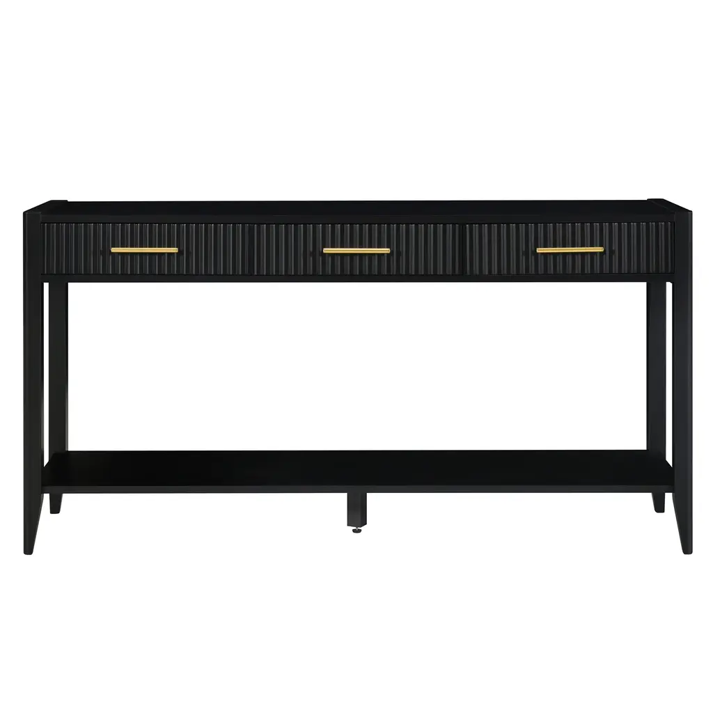 Triple Drawer Utility: This console table is Designed with three spacious drawers which offers practical storage for daily essentials. Its organized layout keeps your entryway tidy while complementing the space with clean lines and modern charm. Spacious Surface: This entryway table With a generous 60-inch length offers plenty of space for storage and decorative items. The larger size makes it perfect for wide entryways, providing both practicality and stylish presence. Smooth Lacquer Finish: The sofa table Crafted with a full lacquer finish, it offers a sleek, glossy surface that’s both elegant and easy to clean. Its smooth texture and subtle shine elevate any entryway with a modern, refined touch. Elegant Wavy Design: The storage cabinet has 3 drawers with elegant wave-like patterns in the front panel,that add texture and visual movement. This unique design brings a sense of rhythm and modern flair to entryways, blending functionality with sculptural artistry. Shine in Detail: Featuring three carefully placed metal handles, this console table blends functionality with subtle sophistication. The metallic accents provide a modern contrast against the wood surface, adding both visual interest and everyday convenience. Added Center Support: Built with an extra center support leg, this sideboard cabinet offers enhanced stability and durability. The thoughtful design ensures the table remains sturdy over time, even when storing heavier items or placed on uneven flooring. Extra Storage Shelf: Featuring an open shelf, this console table side table provides additional storage space for shoes, bags, or decorative items. Its practical design helps keep entryways organized and clutter-free with easy access to essentials.