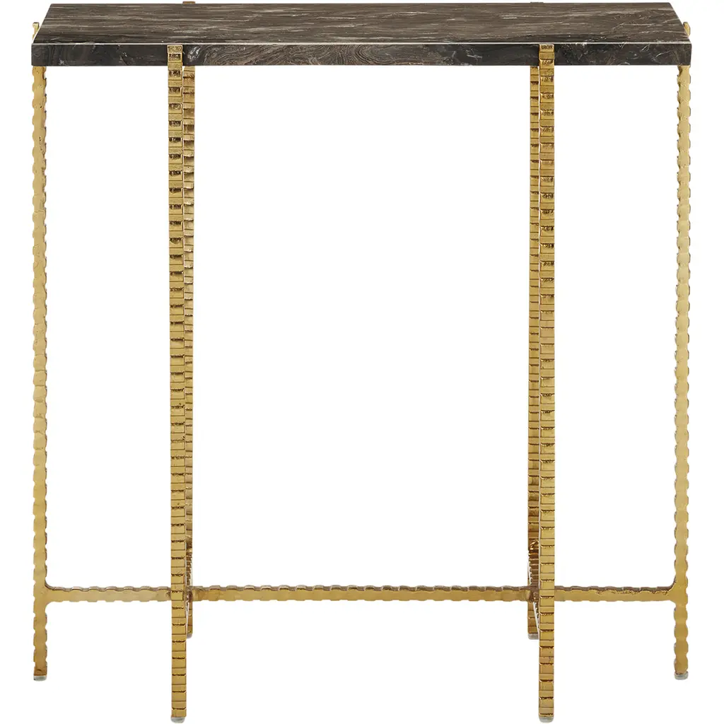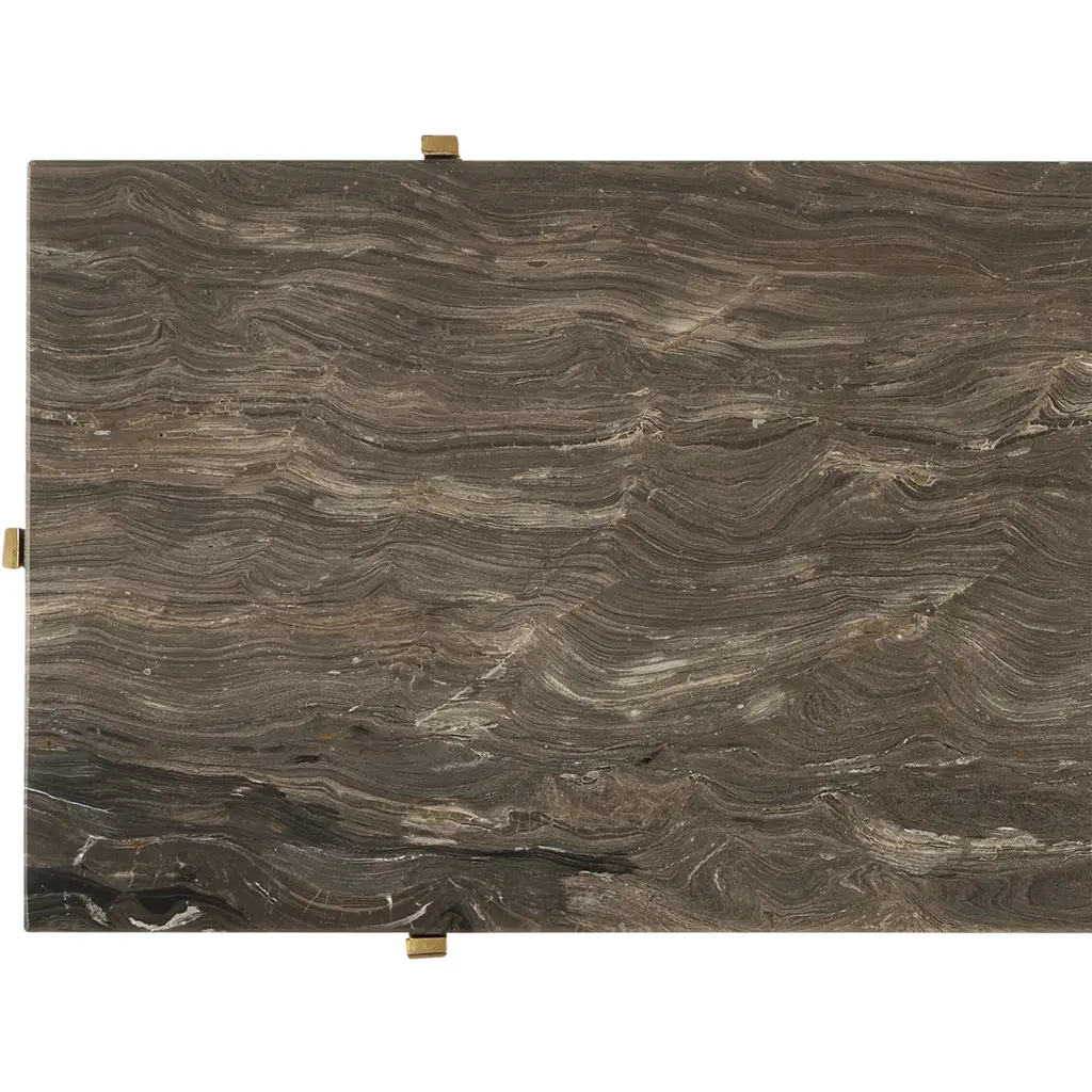 Gold iron and cappuccino-colored stone come together to create the Flying Gold Marble Side Table. The X-shaped stretchers and top support are as toothy as the legs to bring this gold accent table an industrial vibe, but it is also a shoe-in for a contemporary aesthetic. Design details of note are the way the feet swell and the clever way the legs culminate to embrace the brown marble top.