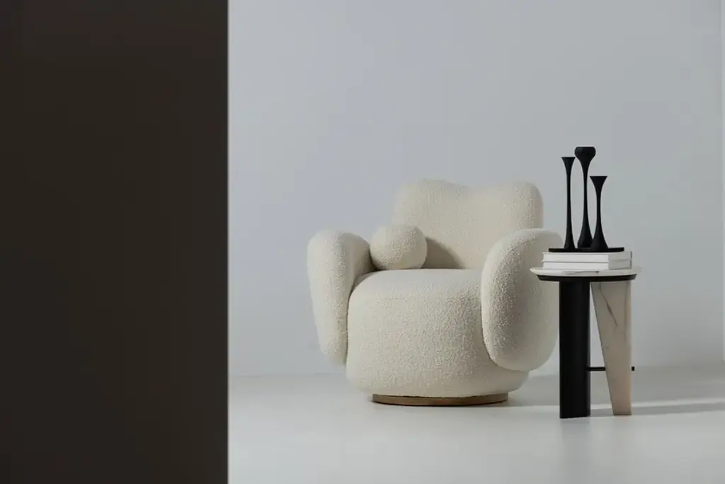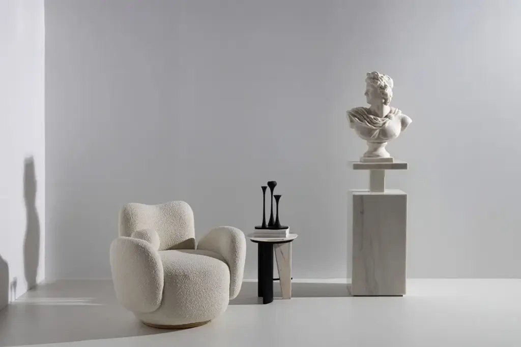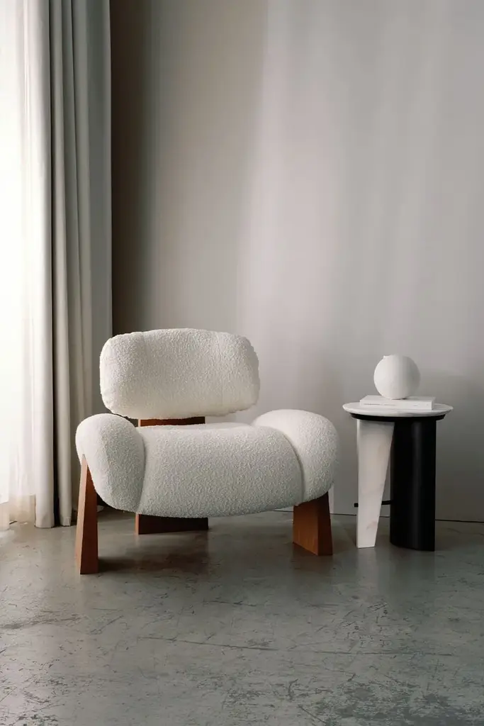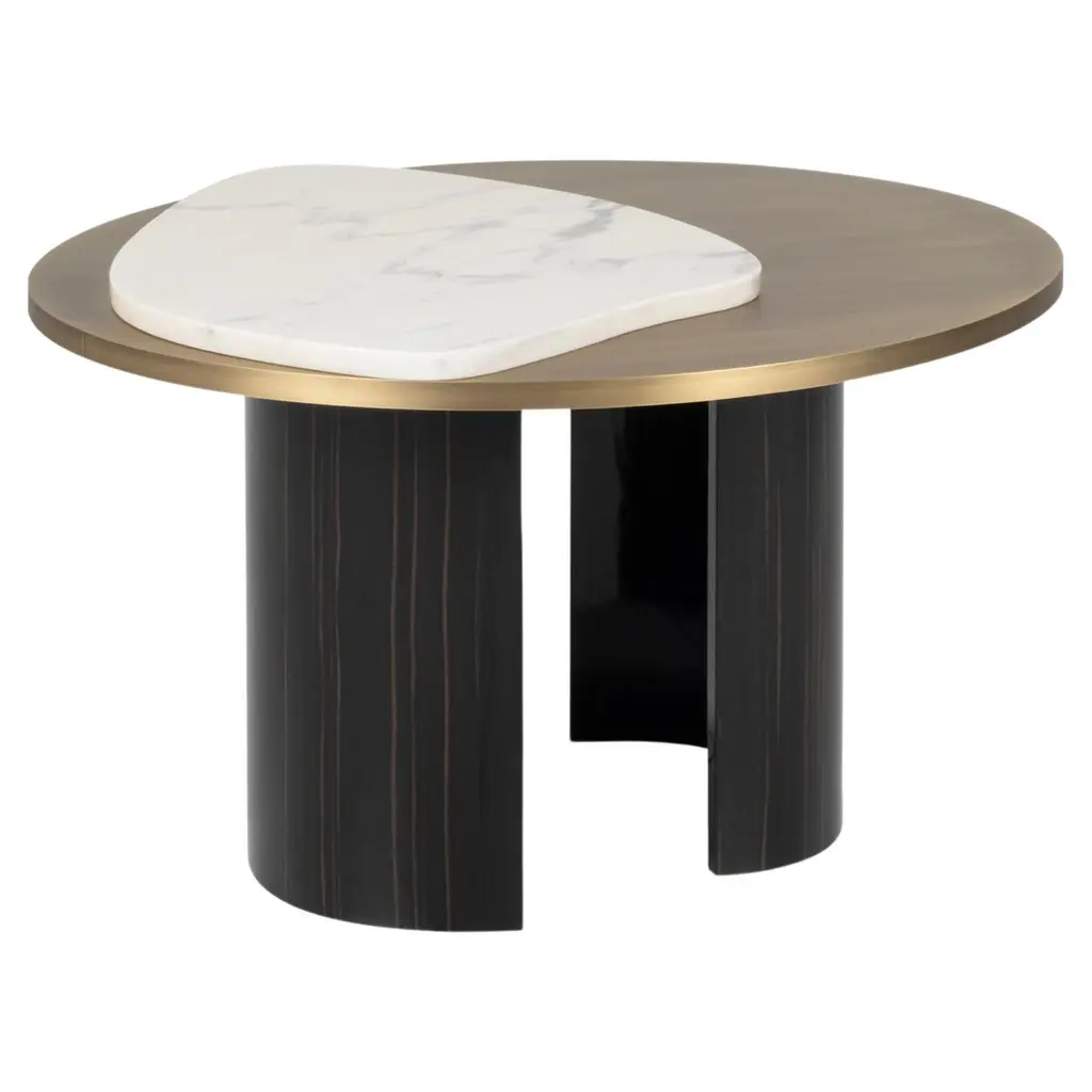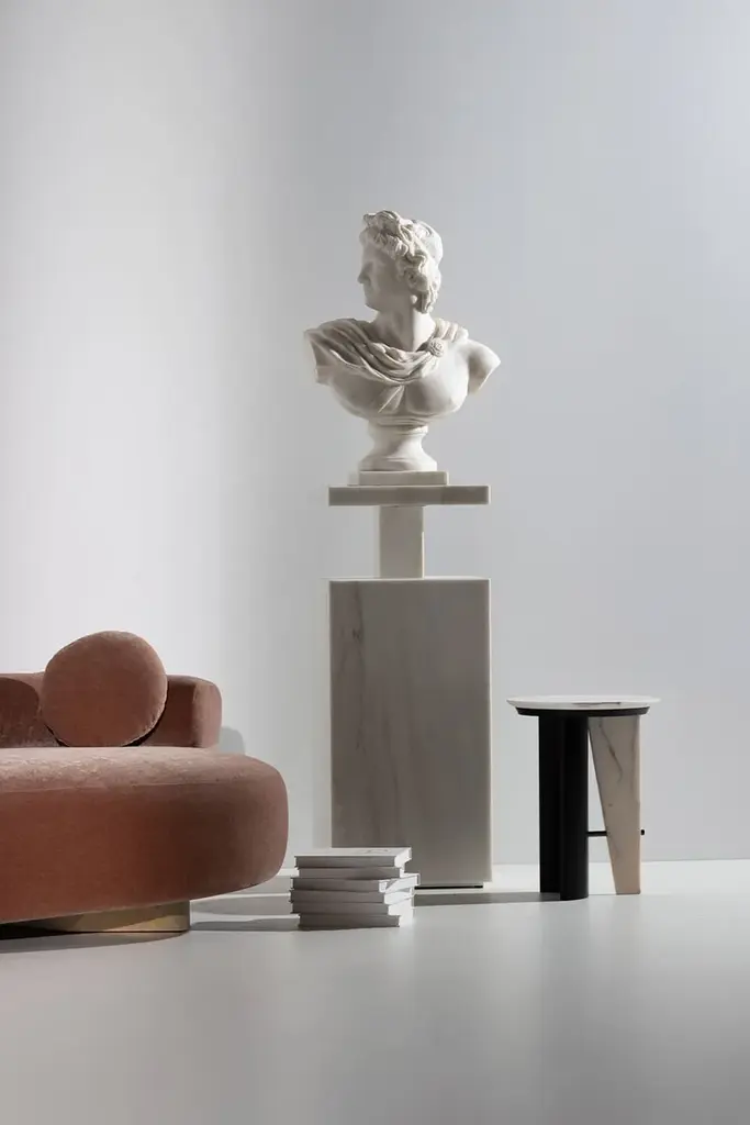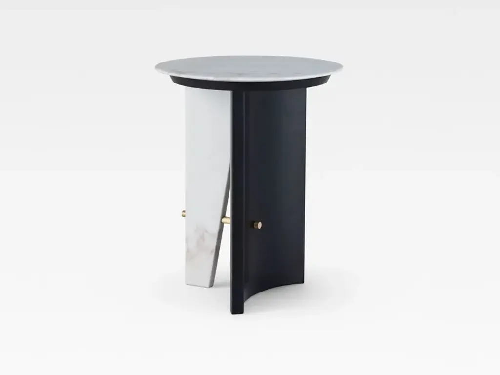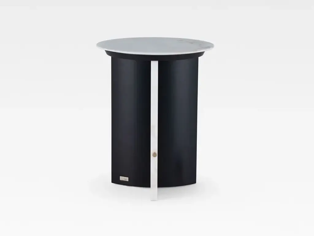 Foice is a side table. Foice mixes the old with the new. The Neolithic age with a contemporary touch. The contrast between the Calacatta Bianco marble and the satin black wooden leg is impressive at first glance. The metal fittings in dark oxidised brass emphasise the subtle grain of the marble.Materials & FinishesFI007 Black lacquer; satin finishST027 Calacatta Bianco marble; matt finishME026 Dark oxidised brass; high-gloss finish