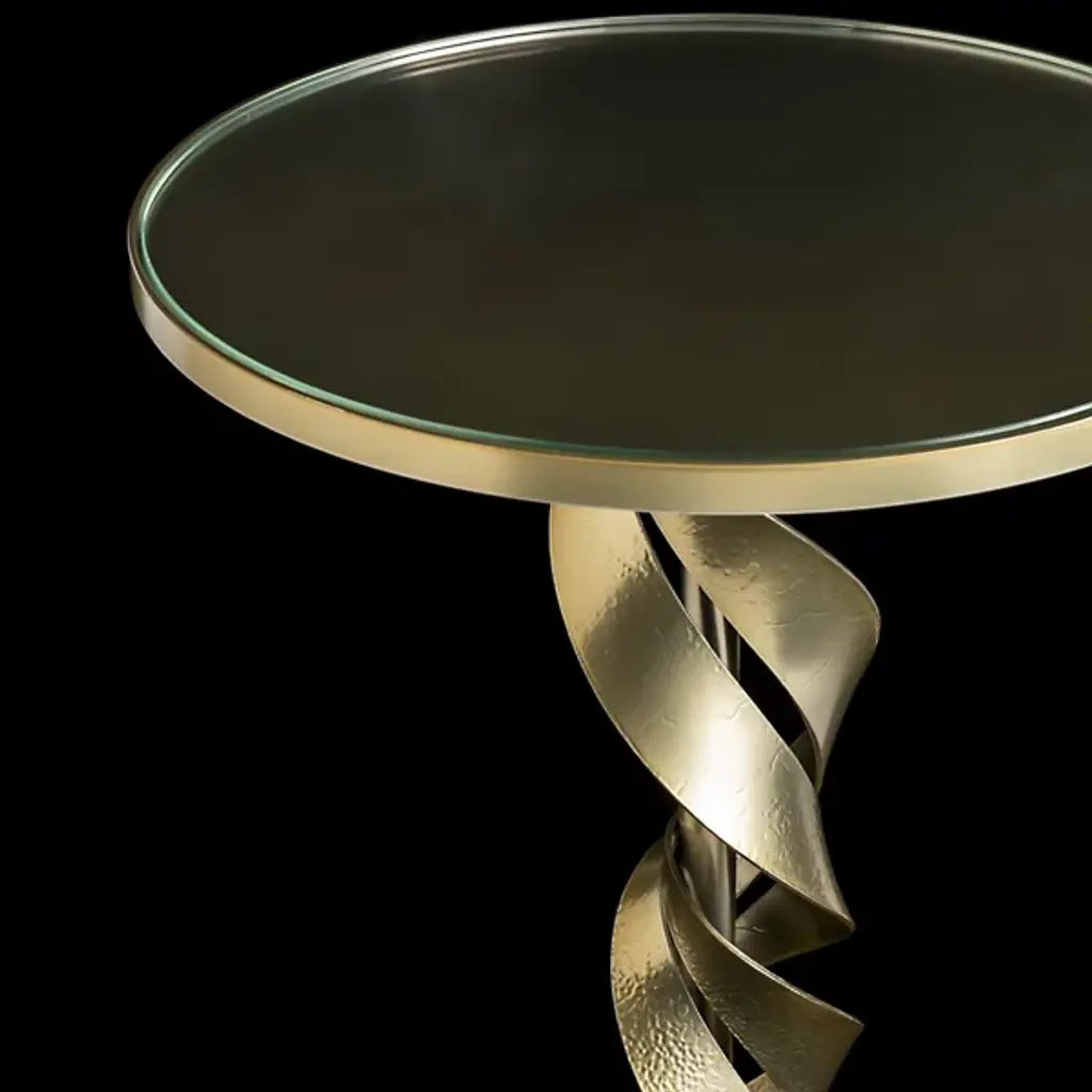 Exquisitely twisted furniture design. The Folio Glass Top Accent Table by Hubbardton Forge showcases expert craftsmanship in its elegant ribbons of hand-forged steel. These accents curve their way down and around the entire pedestal base, giving the side table a sense of movement and grace ideal in a modern living room or bedroom. Set within a ring of steel, the round tempered glass base allows the details of the base to be viewable from above as well as the sides.