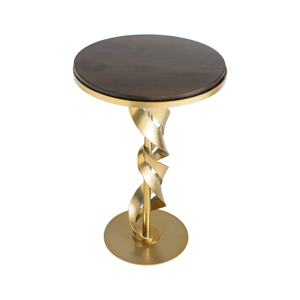 A natural dancing form that flows and curves describes the Folio Wood Top Accent Table by Hubbardton Forge to perfection. The table design is further accentuated by a solid Vermont maple wood top that adds a natural organic twist to the modern metal-based form. Shown in modern brass finish with espresso maple wood top accent