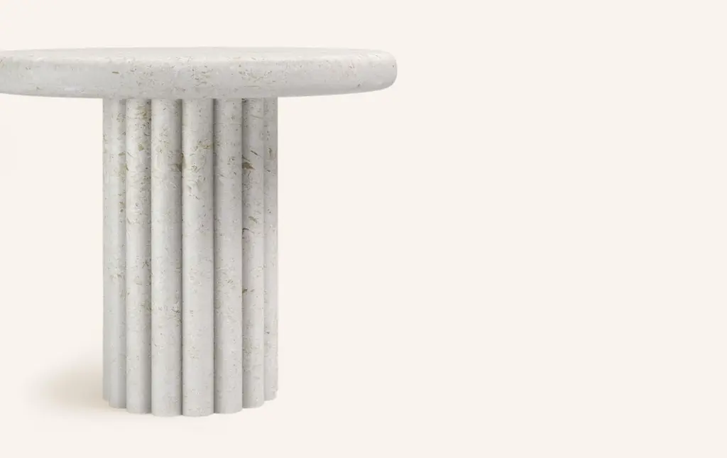 OUR MOST COVETED COLLECTION AND MODERN TWIST ON AN ANCIENT ROMAN CLASSIC. RECENTLY REFRESHED WITH A MORE PLAYFUL AND ROBUST PROFILE.DIMENSIONS:24”L x 24”W x 20”H: - 2.25" THICK TABLE TOP- 10"Ø FLUTED BASE WITH 2" FLUTES- 6.25"Ø CUTOUT IN TABLE TOP WITH 6"Ø INTERLOCK ON BASECONSTRUCTION:TABLE TOP: - 3/4”x 3 SLABS WITH FULL BULLNOSE- HOLE IN TABLE TOP INTERLOCKS WITH BASE OF TABLEBASE:- HOLLOW CONSTRUCTION USING 3/4” STONE SLAB- FELT LINING TO BOTTOM OF BASE FOR FLOOR PROTECTION- STONE FINISH TO TOP OF BASEWEIGHT:24”L x 24”W x 20”H: - GROSS WEIGHT INCLUDING WOOD CRATE 331LBS