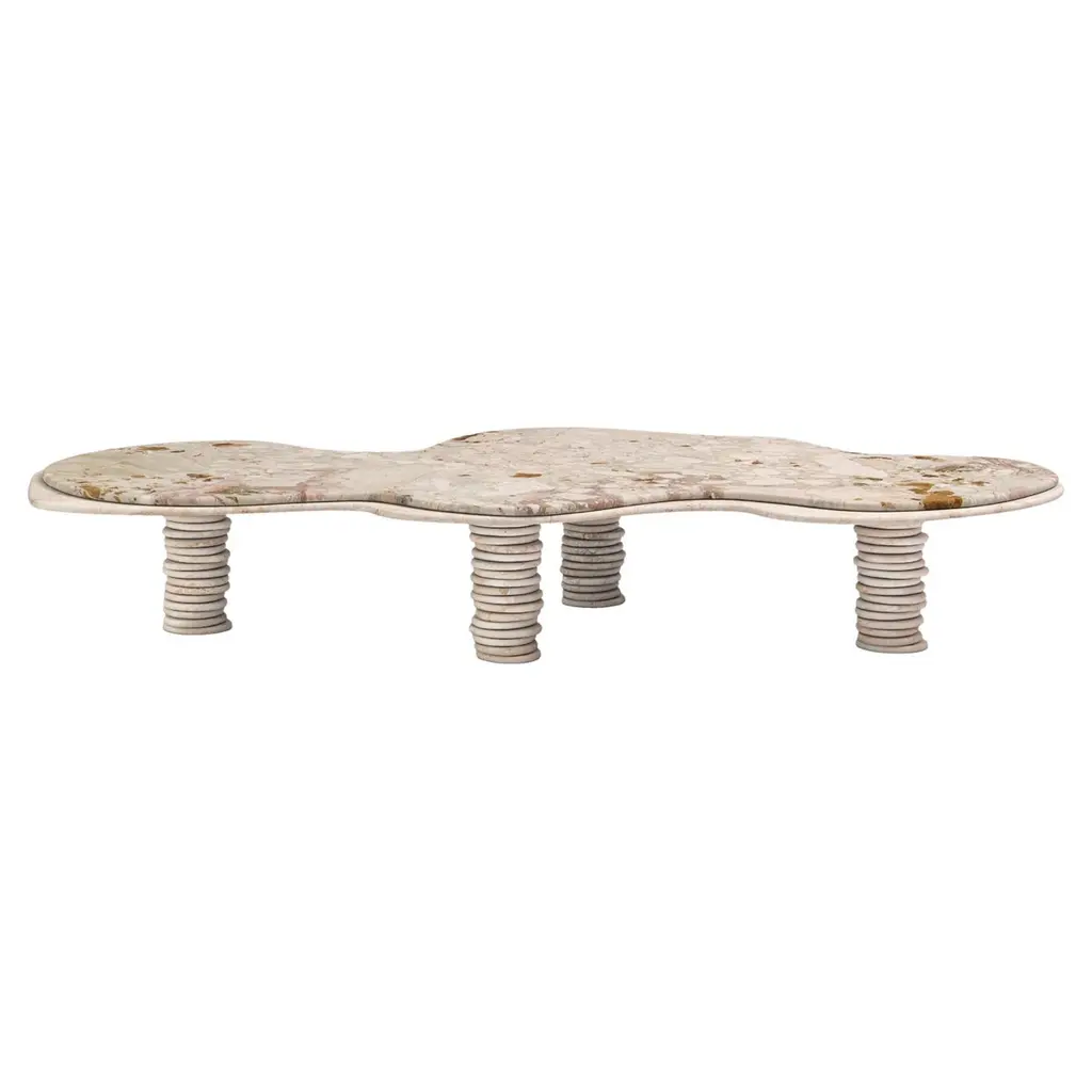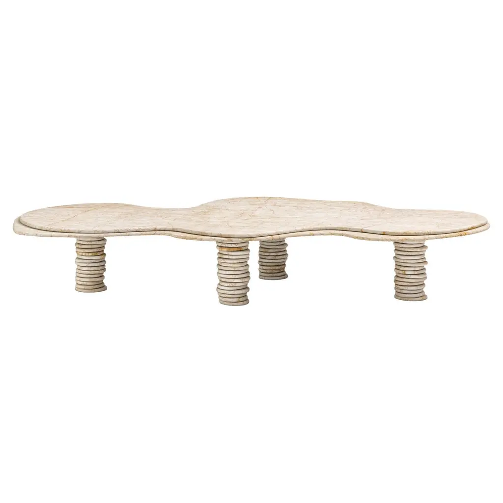 'ONDA', ITALIAN FOR 'WAVE', HAS INSPIRED A FREEFORM ORGANIC BODY, HEROING A COMPLEX AND TEXTURED COLLECTION. COMPRISING SIDE TABLES FOR LAYERING, COFFEE TABLES AND DINING TABLES.DIMENSIONS:72”L x 21”W x 29-3/4”H: - 1.5" THICK TABLE TOP- 2 x 6"Ø 3/4" FREEFORM ROUND STAGGERED STACKEDSLAB LEGS- 1.5”Ø CUTOUT IN TABLE TOP WITH 1.25”Ø INTERLOCK ON BASECONSTRUCTION:TABLE TOP: - 3/4”x 2 LAMINATED SLABS WITH FULL BULLNOSE- HOLE IN TABLE TOP INTERLOCKS WITH BASE OF TABLEBASE:- SOLID CONSTRUCTION USING 3/4” STONE SLAB(S) STACKED- FELT LINING TO BOTTOM OF BASE FOR FLOOR PROTECTION- STONE FINISH TO TOP OF BASEWEIGHT:72”L x 21”W x 29-3/4”H: - GROSS WEIGHT INCLUDING WOOD CRATE 526LBS