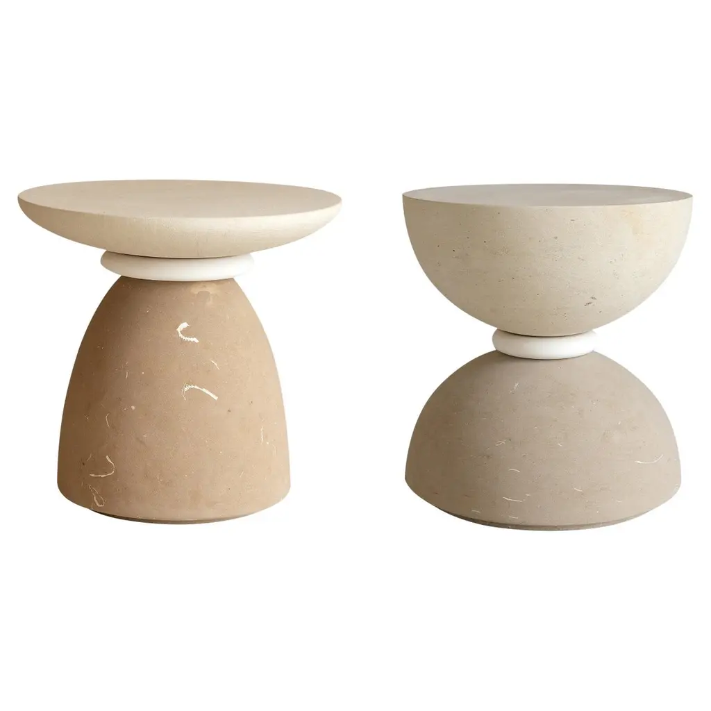 A SLICE OF A ’SPHERE’ OR 'SFERA' IN ITALIAN BALANCES A FLAT SURFACE ATOP AND ROBUST MONOLITH FORM. WITH A BASE SOFTENED BY A CURVED PROFILE, SFERA IS SOFT AND EARTHY IN ITS AVAILABLE STONE SELECTIONS.DIMENSIONS: (SIDE TABLES SOLD INDIVIDUALLY):14”L x 14”W x 26”H: - 4.5” THICK SOLID TABLE TOP- 7”Ø SOLID BASECONSTRUCTION:- SOLID THICK TABLE TOP WITH DEMI-BULLNOSE EDGE- CARVED FROM A SINGLE SOLID BLOCK OF STONE- FELT LINING TO BOTTOM OF BASE FOR FLOOR PROTECTIONWEIGHT:14”L x 14”W x 26”H: - GROSS WEIGHT INCLUDING WOOD CRATE 208LBS