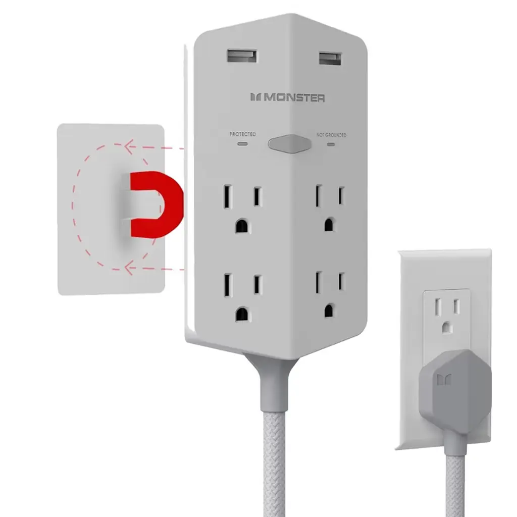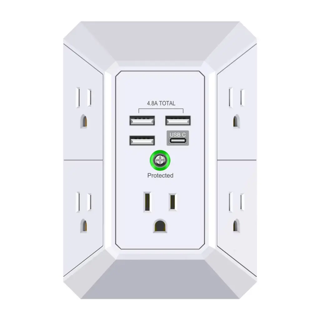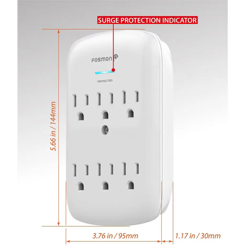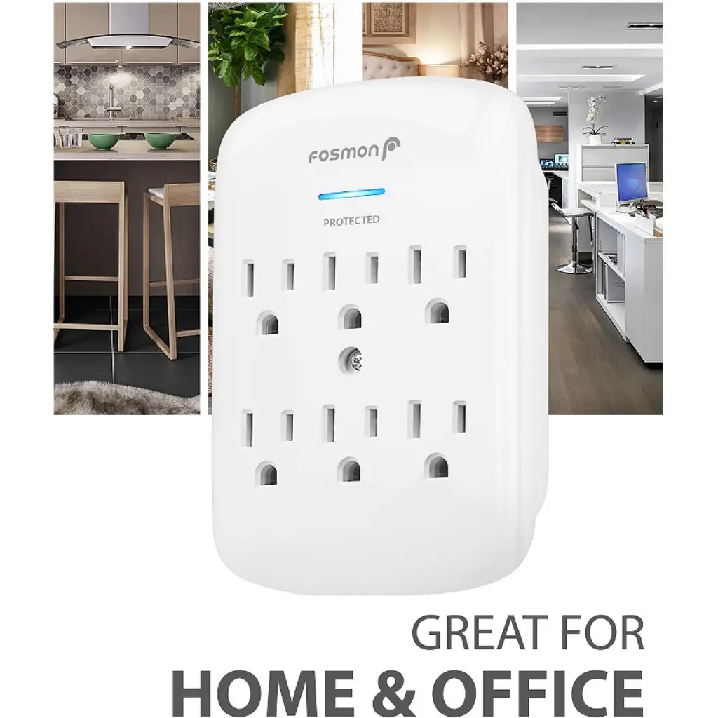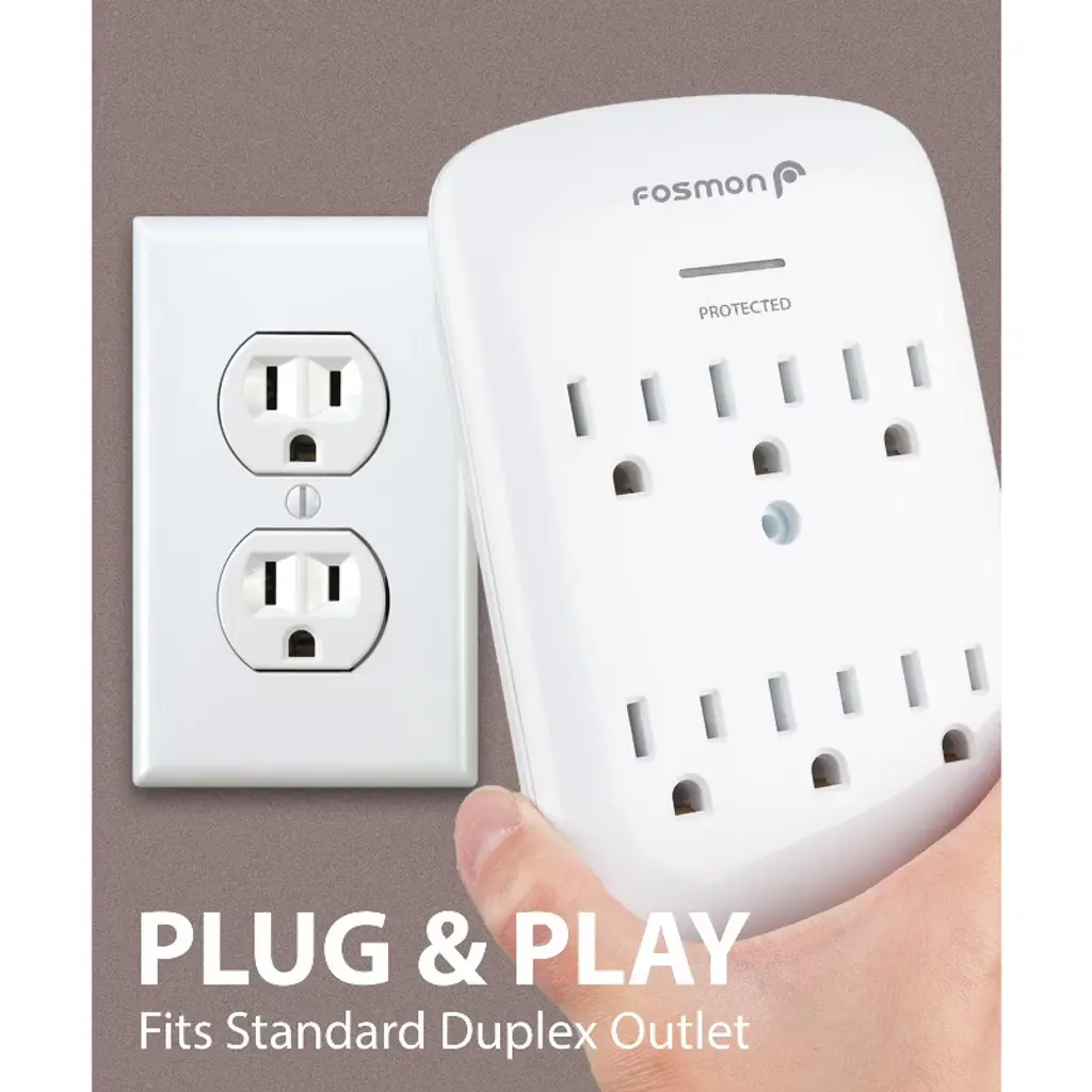 Expands Wall Outlets Fosmon's 6 outlet surge protector triples the number of available outlets compared to standard wall outlets and protects electronics from power surges. Simple Solution The Fosmon 6 outlet surge protector is ideal for home or office use. This surge protector is capable of powering up to 6 electronic devices with 6 AC power outlets. A simple solution to keep electronic devices powered on. Reliable Surge Protection Provides 1200 joules of surge suppression to prevent voltage spikes from damaging your electronics. The Protected LED indicates that surge protection is available. Certified Safety The wall tap power adapter is ETL listed and conforms to UL1449 standards. The 3-prong grounded outlets provide an extra layer of safety. Please Note: This item is for indoor use only. Do not install in damp areas or outdoors. Specifications 6 125VAC Surge Protected OutletsElectrical Rating: 15A, 125VAC, 60Hz, 1875 WattsETL Listed and Conforms to UL1449 standardsSurge Protection LED Indicator1200 JoulesIndoor Use Only Package Includes 2x Fosmon 6 Outlet Surge Protector2x Mounting Screw Model: 1 Pack: C-10688; 2 Pack: C-10831FIUS