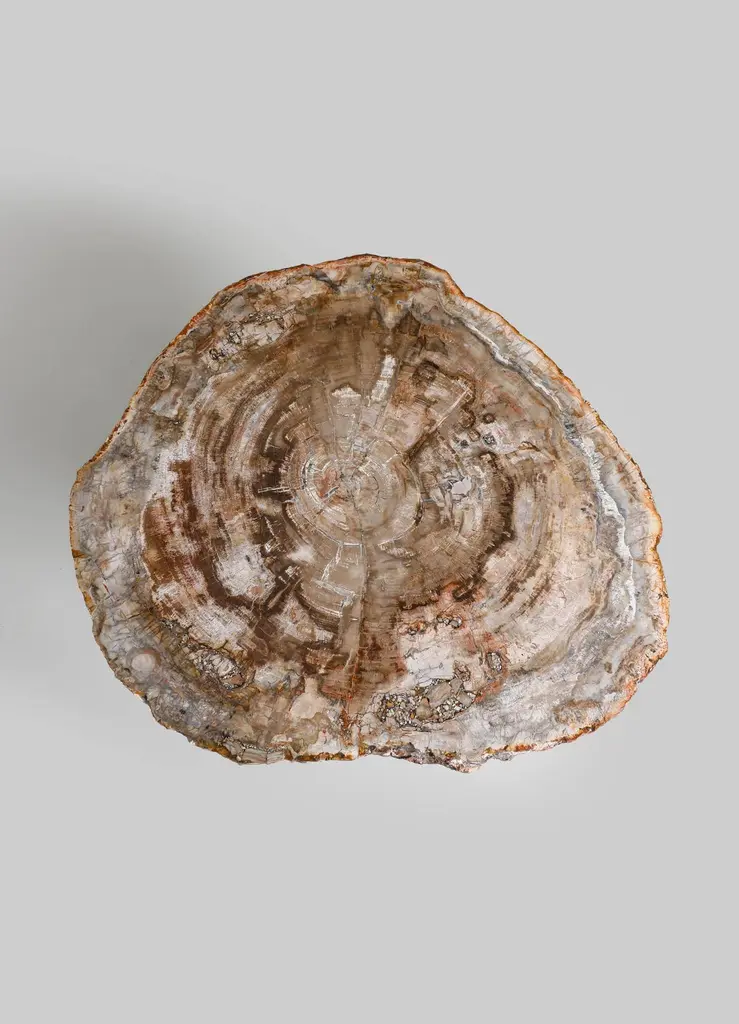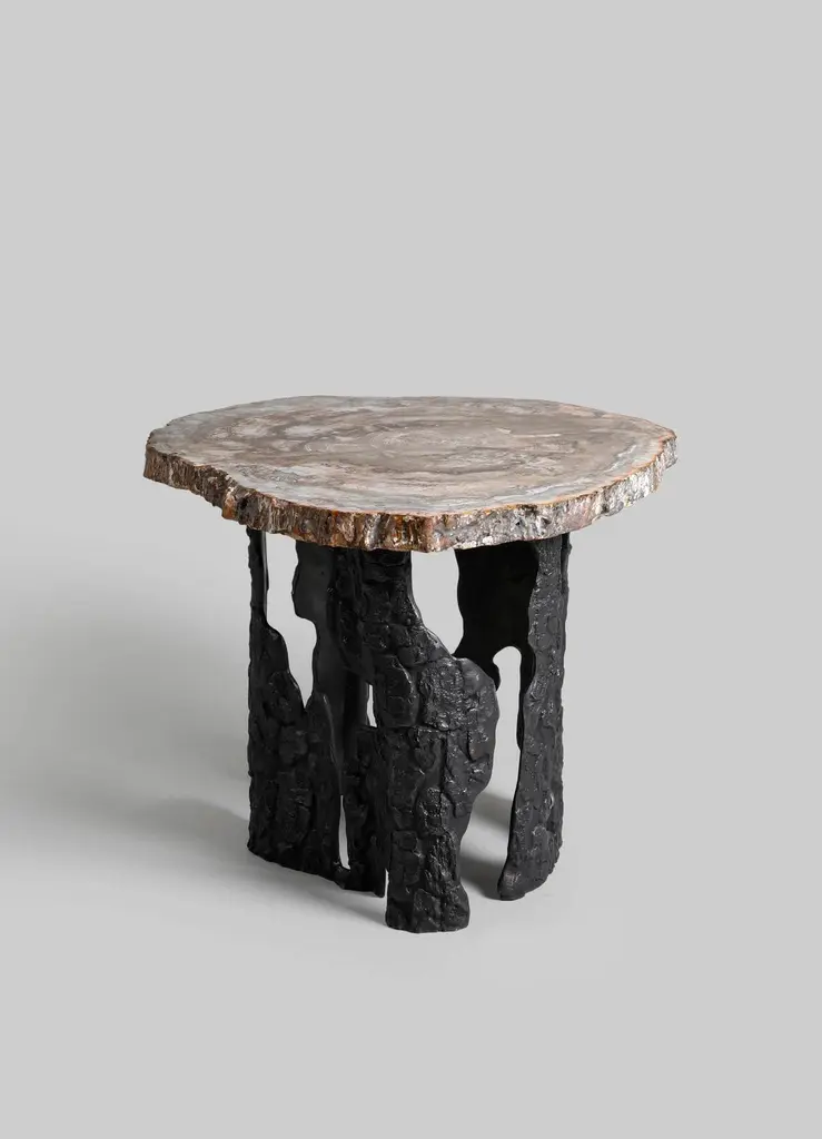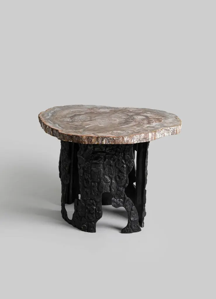 Fossil Side Table In Petrified Wood Overlay Top & Brass, Viya By Vikram GoyalThe slow, natural processes of the earth often yield the most remarkable designs. Petrified wood forms over thousands of years, as water and minerals gradually seep into the crevices and voids of wood, fossilising it in the absence of oxygen. This natural process creates a rich, layered surface of metallic tones, so marvellous it requires no further human intervention.Pairing this petrified wood tabletop is a cast brass base, its surface design inspired by the textiles of India. Together, they emerge as a celebration of both nature and human artistry.Side Table in brass with petrified wood & stone overlay top. Handmade in India.Product DetailsMaterial: BrassOverlay Top: Petrified Wood & StoneSize: 24"L x 22"W x 18"H 61 L x 55.9 W x 45.7 H cmWeight: 28.5 kg 62.7 lbsNumber of Pieces: 1 Side TableSKU: VST1601This product has been handcrafted by local artisans. As such, slight variations are a testament to the unique character of a piece made by hand.