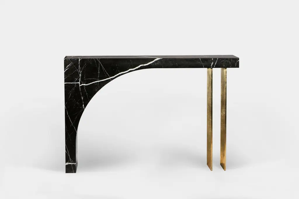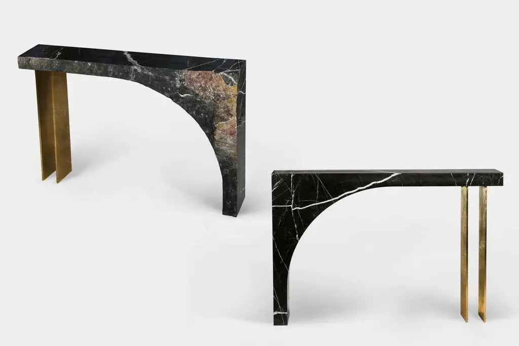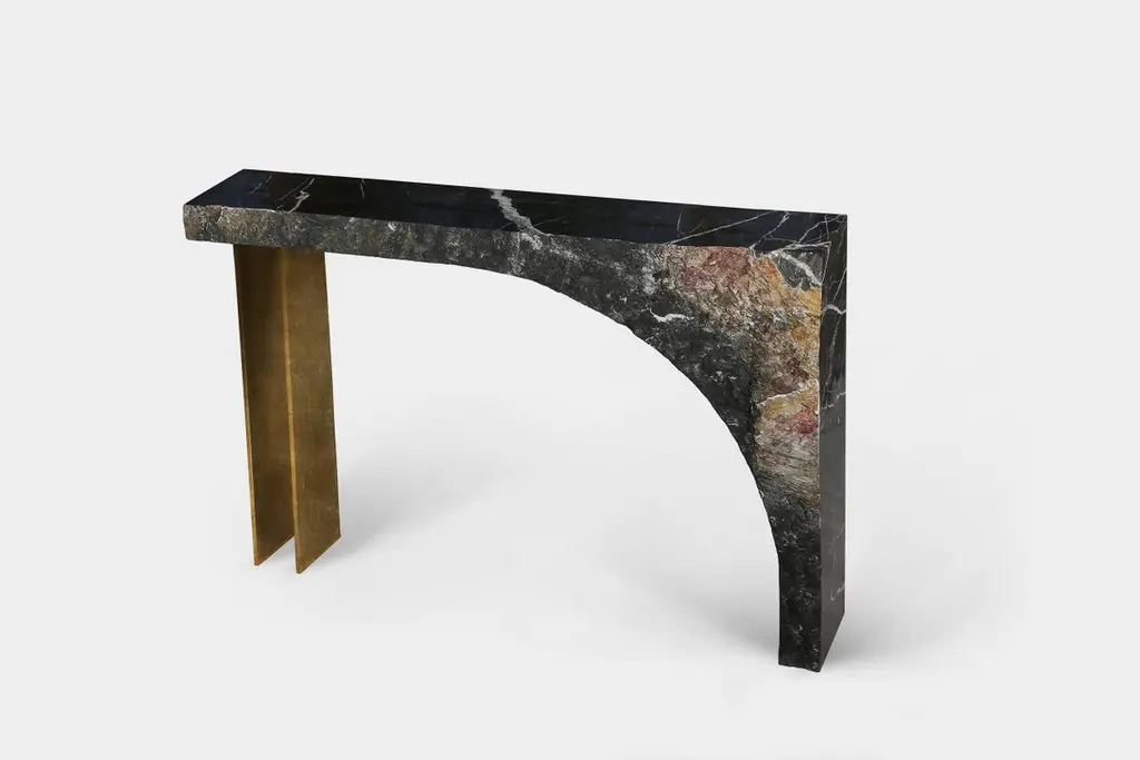 Found II console table No.2 by A SpaceDimensions: D100 xW 25 xH 84cmMaterials: Marble, steel, gold leaf.Spontaneity, environmental awareness and the primeval nature of the materials are central themes explored in this collection, which focuses on the power of the medium to dictate the final form these functional works of art take. It consists of 10 one-of-a-kind objects that are cut from a single piece of 10"-thick stone. Perfectly polished marble surface on one side is juxtaposed with the natural rough surface on the opposite side of each object, reminiscent of the mountains that the stone came from. A S P A C E is a New York-based design & art studio, co-founded by Anna Aristova and Roza Gazarian in 2016. Their collaborative pieces are an attempt to bring in the timeless beauty of nature to contemporary lifestyle, whether it’s functional furniture or a decorative object. The essence of each of their creations is a sense of a vast open space, where ideas, thoughts or feelings spontaneously arise, evolve through experimentation and ultimately manifest as a functional art piece. Each object is a one-of-a-kind creation that beckons to look beyond mere form and material, and to connect to the primordial nature of the elements. Their work is a constant balance of opposites -- improvisation and thoughtful planning, intuition and knowledge, organic and geometric, timelessness and impermanence.