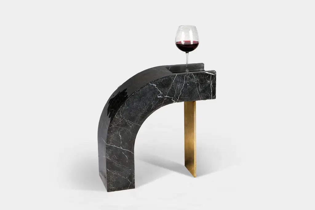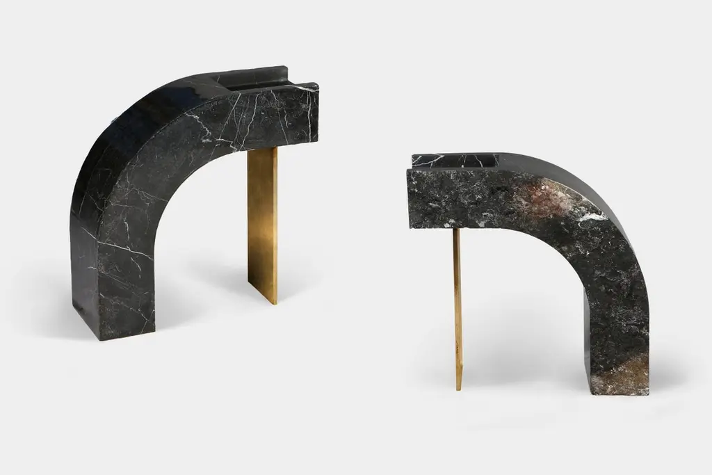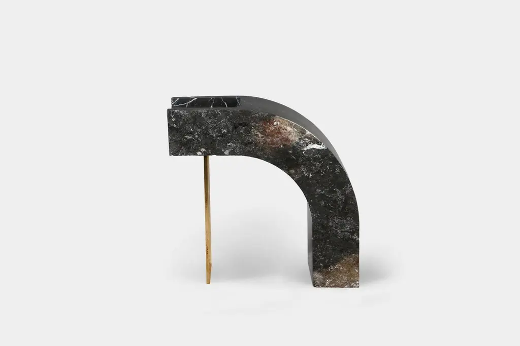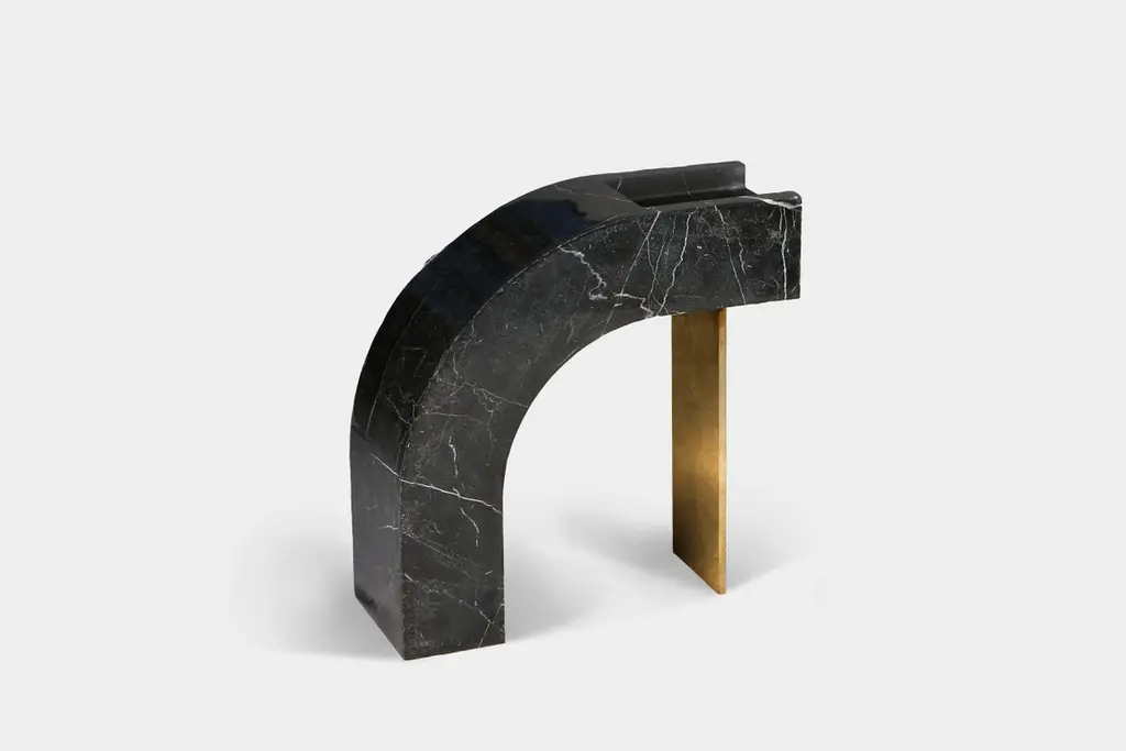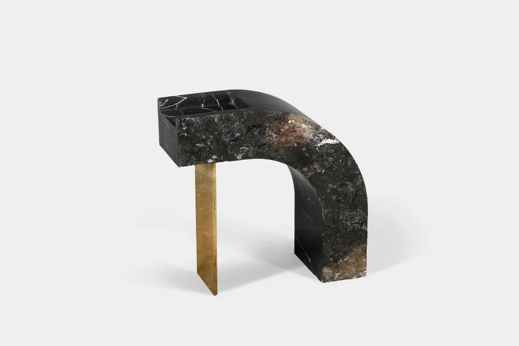 Found II side table No.6 by A SpaceDimensions: D 48 x W 25 x H 51cmMaterials: Marble, steel, gold leaf.Spontaneity, environmental awareness and the primeval nature of the materials are central themes explored in this collection, which focuses on the power of the medium to dictate the final form these functional works of art take. It consists of 10 one-of-a-kind objects that are cut from a single piece of 10"-thick stone. Perfectly polished marble surface on one side is juxtaposed with the natural rough surface on the opposite side of each object, reminiscent of the mountains that the stone came from. A S P A C E is a New York-based design & art studio, co-founded by Anna Aristova and Roza Gazarian in 2016. Their collaborative pieces are an attempt to bring in the timeless beauty of nature to contemporary lifestyle, whether it’s functional furniture or a decorative object. The essence of each of their creations is a sense of a vast open space, where ideas, thoughts or feelings spontaneously arise, evolve through experimentation and ultimately manifest as a functional art piece. Each object is a one-of-a-kind creation that beckons to look beyond mere form and material, and to connect to the primordial nature of the elements. Their work is a constant balance of opposites -- improvisation and thoughtful planning, intuition and knowledge, organic and geometric, timelessness and impermanence.