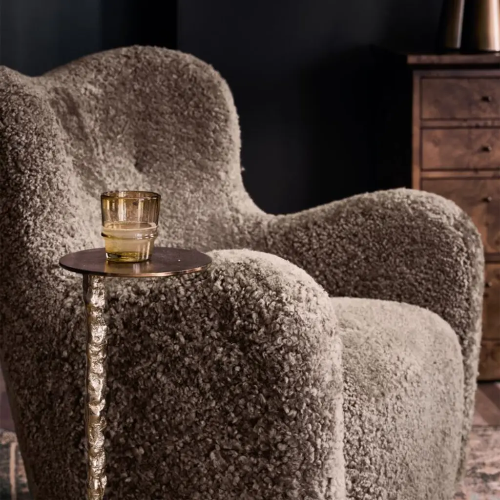 Our Foundry drink table defies expectations as it excites the imagination. Hand-sculpted to resemble molten metal, the table appears frozen in mid-flow as it drips a textured offset pole that pools at the bottom. A polished bronze-plated finish animates the fluid effect with light-reflecting luster and a golden glow. Made of lightweight aluminum with sandcast texture, the table is counterweighted at the base for added stability.
