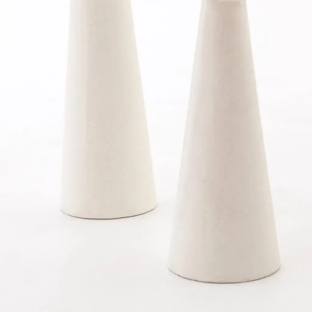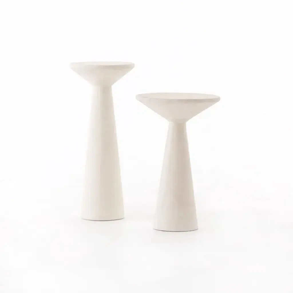 Concrete accent tables stagger in height for a wide variety of options. Makes for an impactful pedestal for display or handy extra surface beside a sofa. Parchment white in color for a clean, industrial-spun vibe. Tall table measures 8.5"D x 20"H. Shorter table measures 10.5"D x 16.5"H. Assembly Required? No