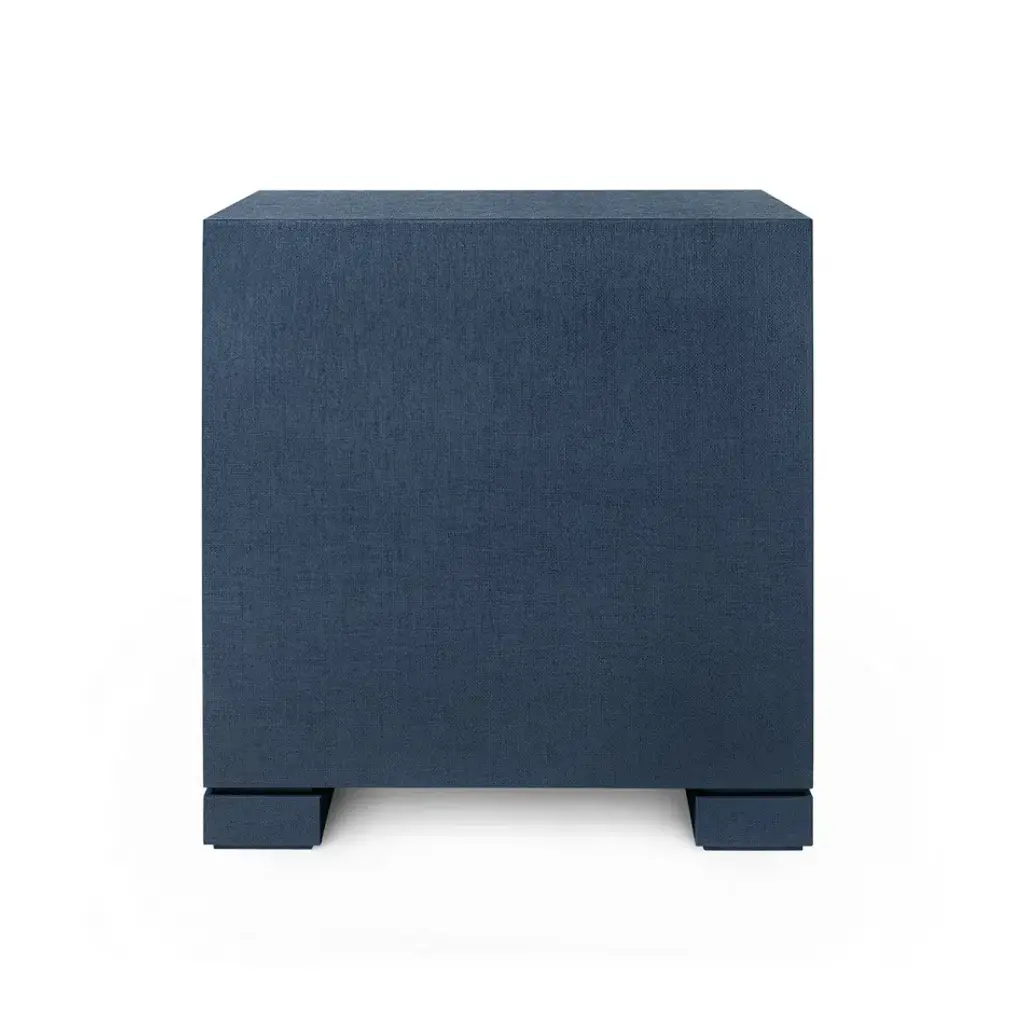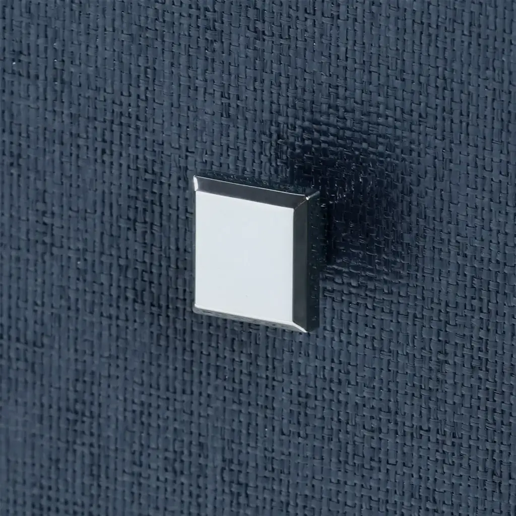The Frances Collection includes perfectly tailored pieces which make the most of the luxurious finishes Villa & House is known for. Expertly swathed in lacquered grasscloth, the Frances 2-Drawer Side Table provides a unique contrast between its tactile materials and structured form. Clean lines make their way from its base to its surface, with a thinner drawer floating beneath its top and a thicker one below. Each boasting rich stained wood interiors and chrome finished accents, the drawers are separated by an inset space, doubling its surface area for storage and display. In sophisticated navy blue, the Frances makes a sleek addition in a modern study, bedroom, or living room.