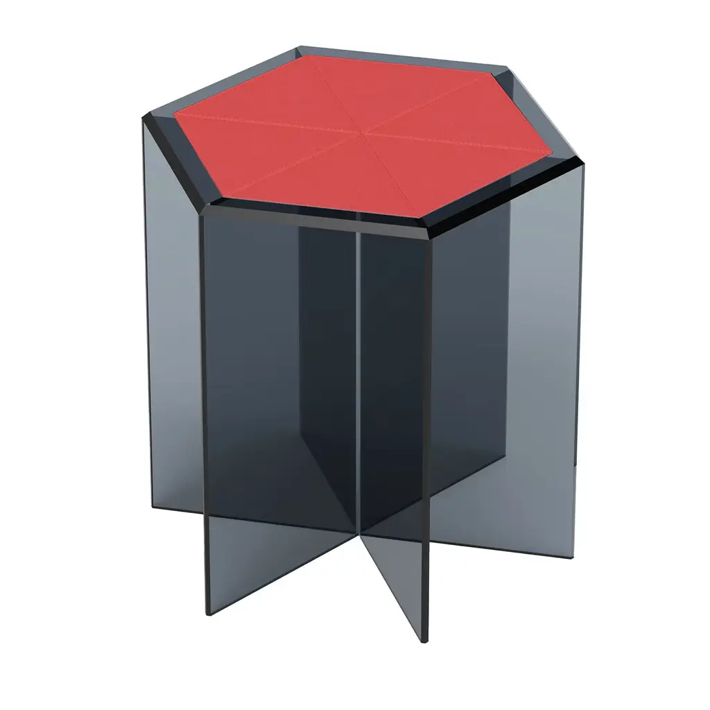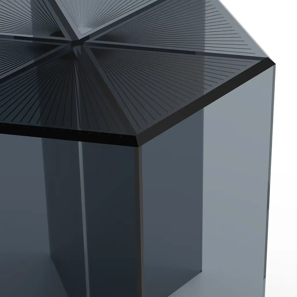 A striking smoky gray hexagonal crystal table by Marc Krusin, featuring a sandblasted Radius pattern. Available in bronze or extra-clear glass, it offers four distinct patterns: Diamond, Triangle, Arrow, and Radius, allowing for a tailored aesthetic. The unique hexagonal shape and intricate detailing make it a standout piece for modern interiors. Please ask the Concierge for other info.