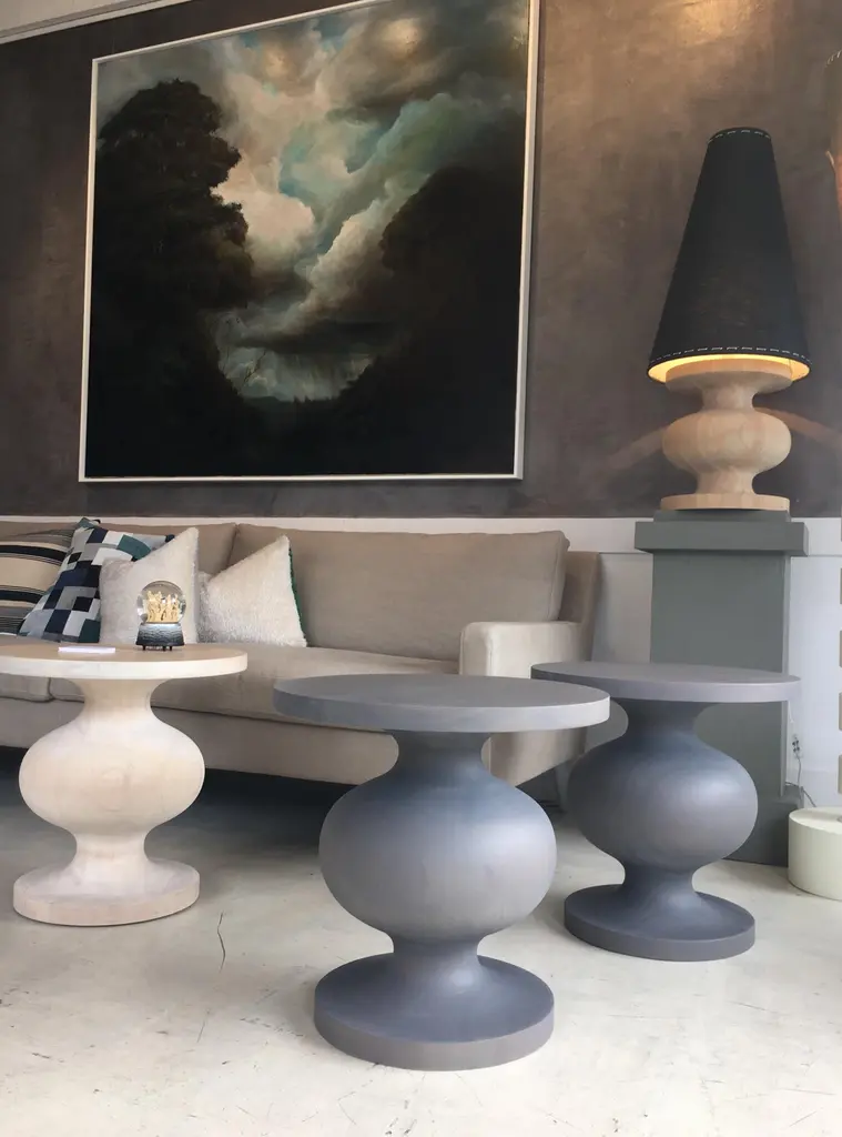 Frank Side Table is original sculptural, organic modern. Frank Side Table is a refined example of 21st century artisanal design. Its signature sensuous shape and perfect proportions are inspired by Jean Arp’s minimal 20th century sculptures. Frank Side Table harmonizes equally well in modern and classical settings adding a fresh geometry to the negative space of any room. Frank Side Table is made in Australia one piece at time on a single lathe, hand built, hand-finished and signed on the underside with our logo. Frank Side Tables are made of solid, selected and sustainable, hardwoods, available in rock maple, with our sheer matte, hand applied Scandinavian Natural (shown) which reveals its artful construction, opaque Matte Bone White lacquer; or in hand-oiled sustainable native rosewood which is a rich warm mid brown with beautiful figure to the wood, or with our Noir finish which is ebonised. Also shown is our custom sheer Matte Ash finish. We're happy to develop any custom colour in sheer, opaque matte or buffed finishes.