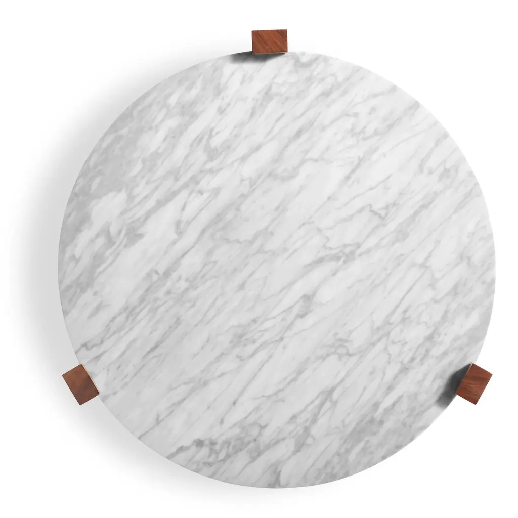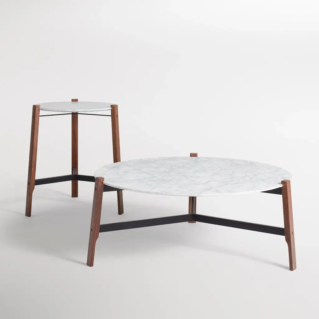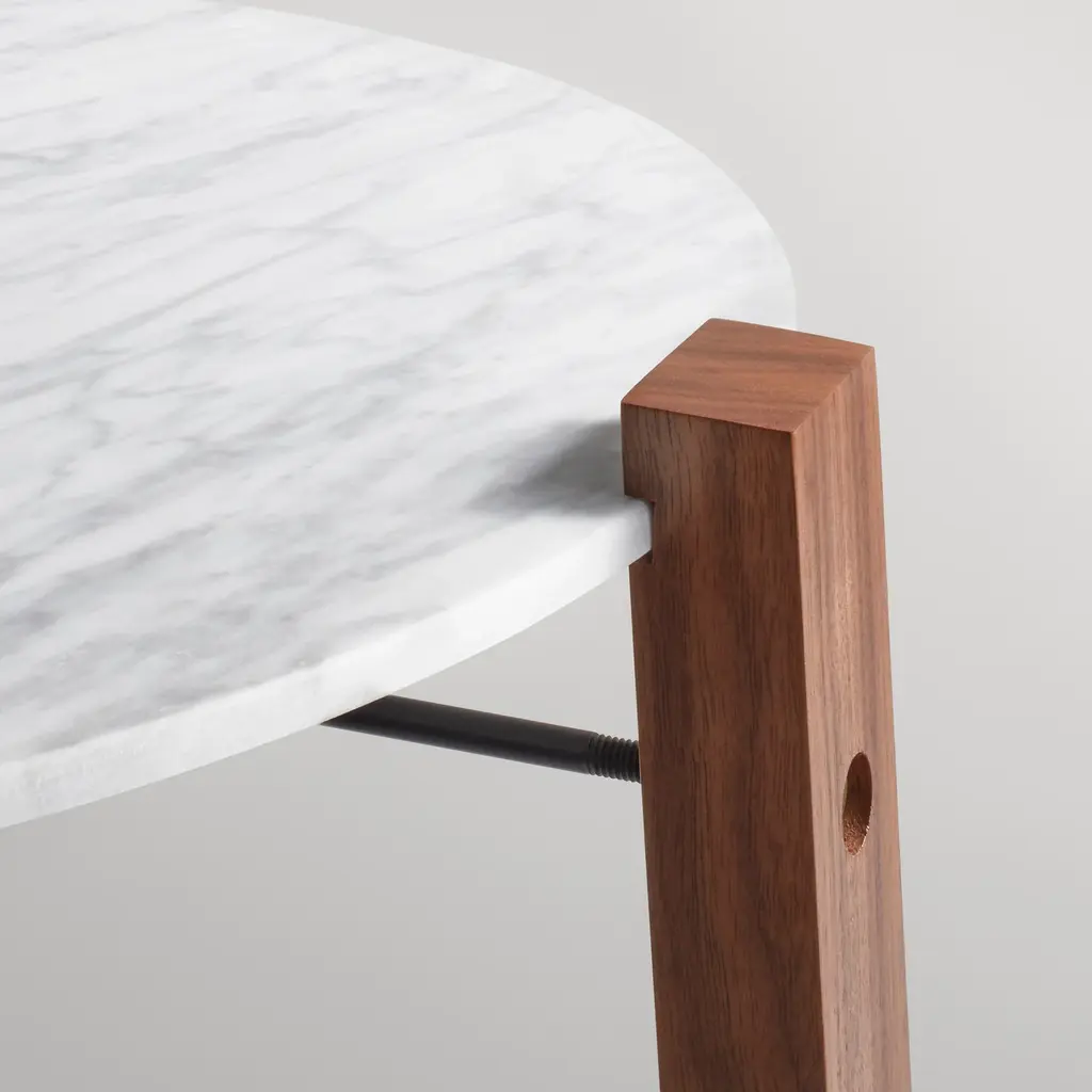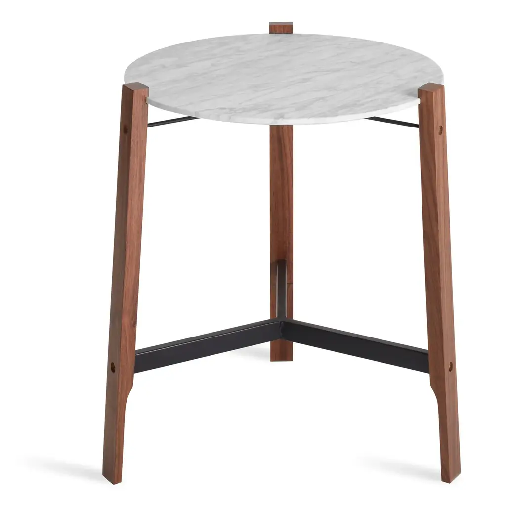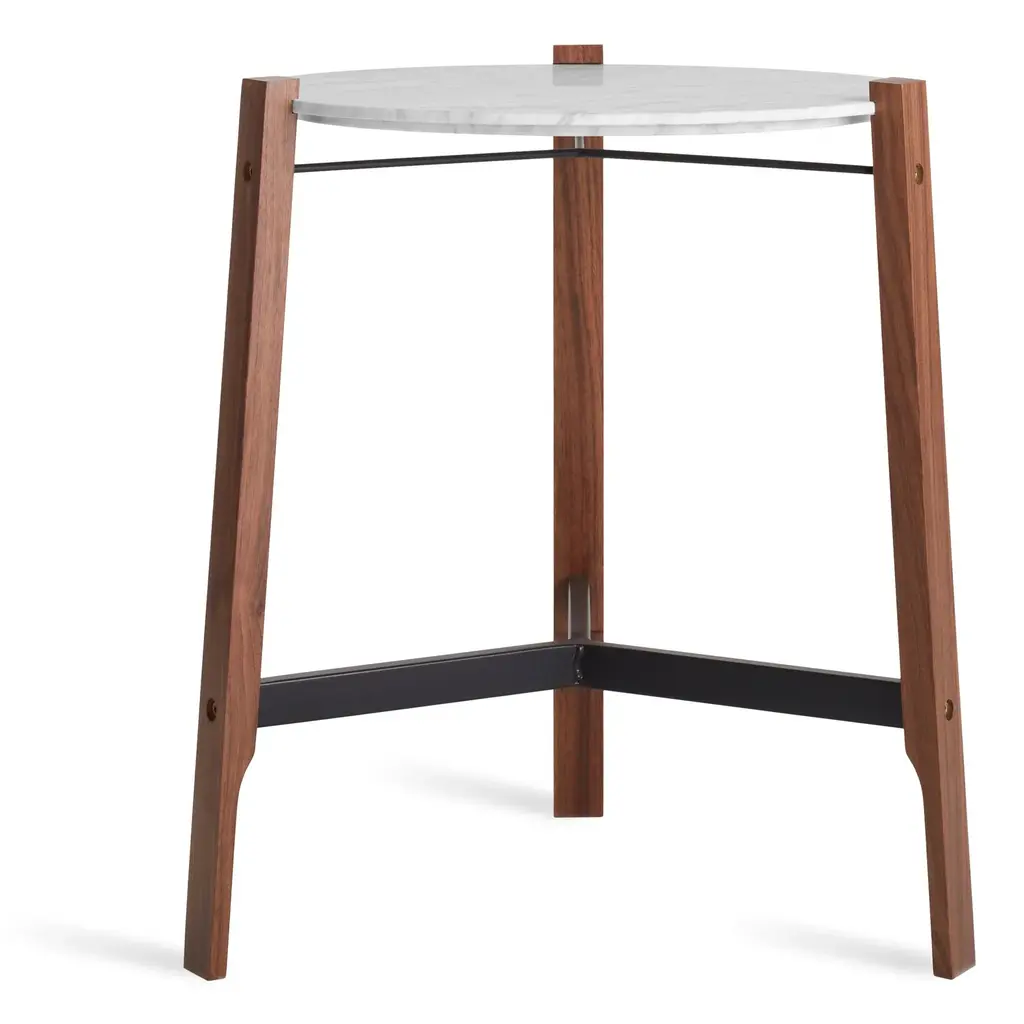 Sophistication unfettered. Solid walnut legs capture a marble top, while brass details and a black steel frame bring a dash of drama. Coffee table also available.