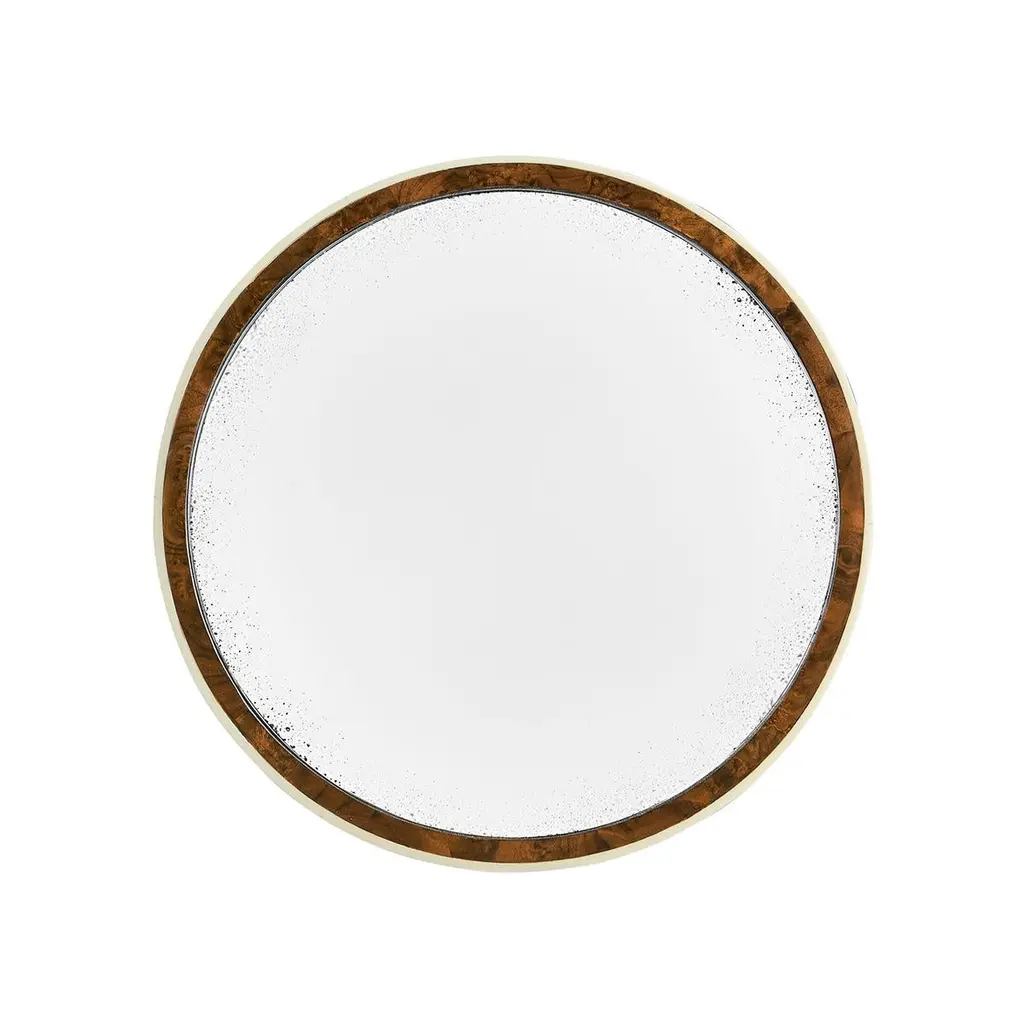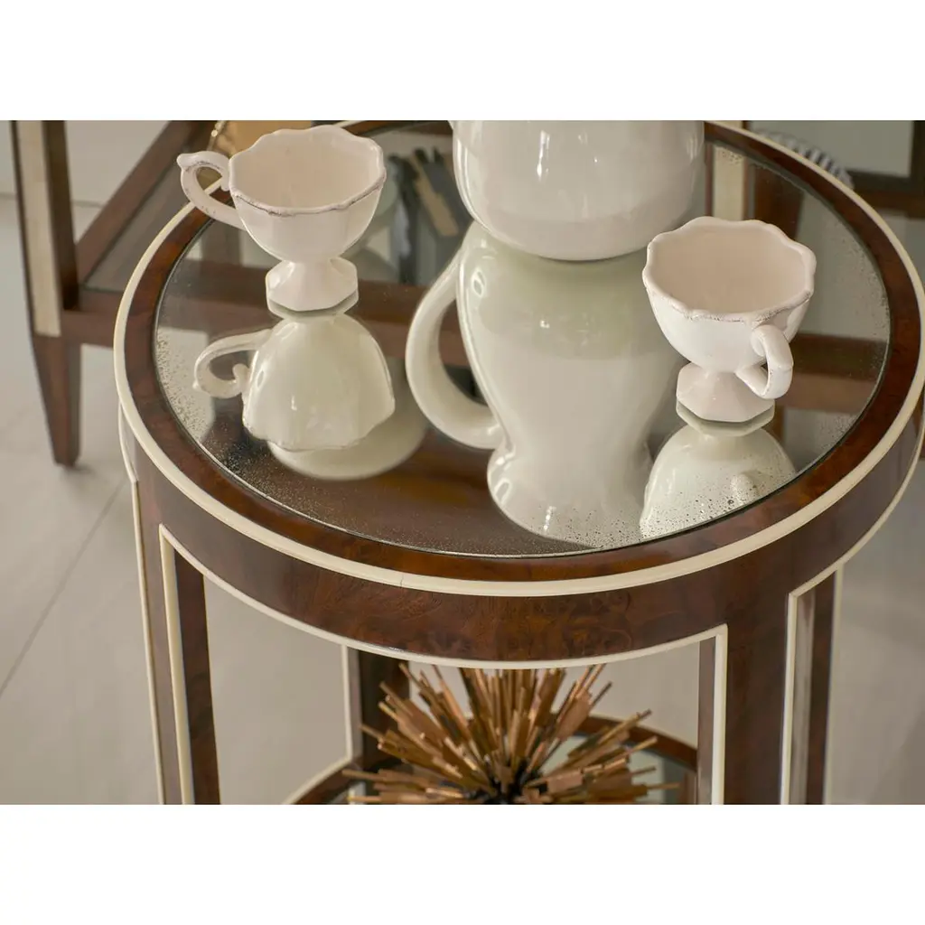The medium brown mahogany finish highlights the wood's grain, creating a piece that resonates with classic sophistication.The antiqued mirrored top and shelf infuse a sense of vintage glamour and feature faux bone inlay, adding a touch of elegance and contrast to the table. The line is repeated down the delicate legs to the tapered feet, adding a beautiful contrast to this classic silhouette.Dimensions: 16" W x 16" D x 26" H