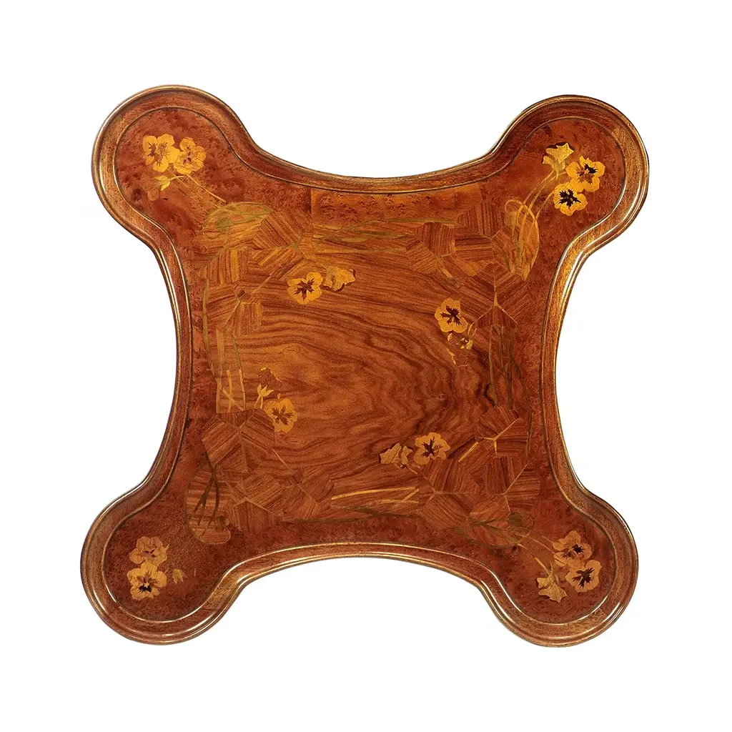 Borrowing willowy lines and generous curves from natural elements, this shaped side table is a cabinetmaking gem reproducing an authentic French Art Nouveau piece by Louis Majorelle. Openwork floral garlands are minutely hand-carved to adorn the sides, their decorative appeal exponentially emphasized by the inlays combining exotic timbers and accenting the top.