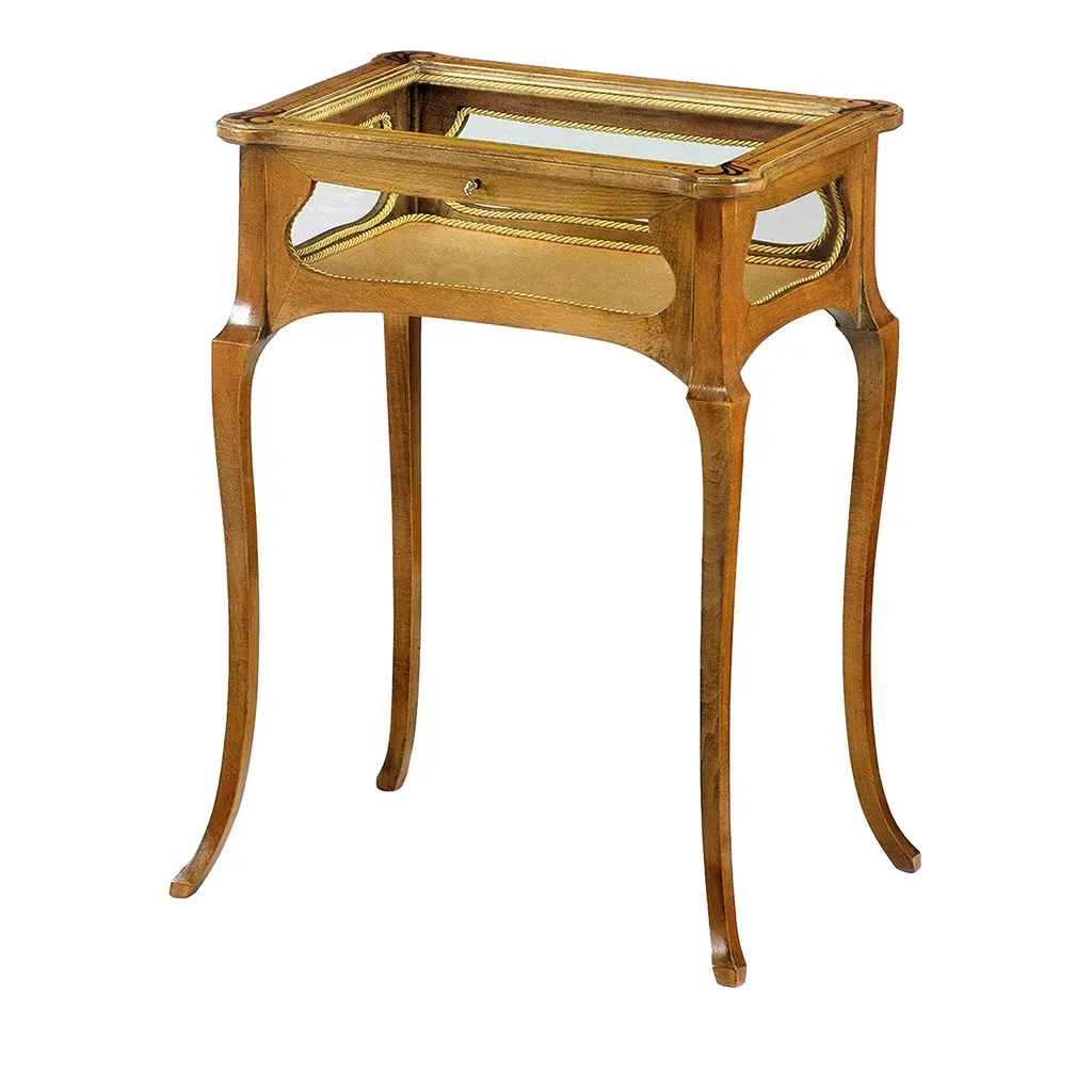 A selection of prized woods are featured in the superb inlays adorning this side table's shaped shelf and top. A minute reproduction of a French Art Nouveau design by Emile Gallè dating back to 1880-1915, it delivers grace and elegance with its cabriole legs enlivened by hand-carved details that harmoniously coexist with veins naturally drawn by nature.