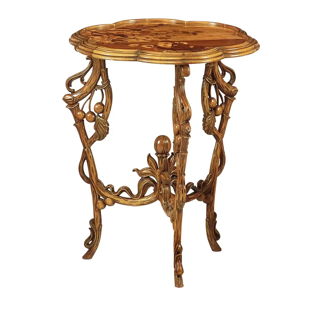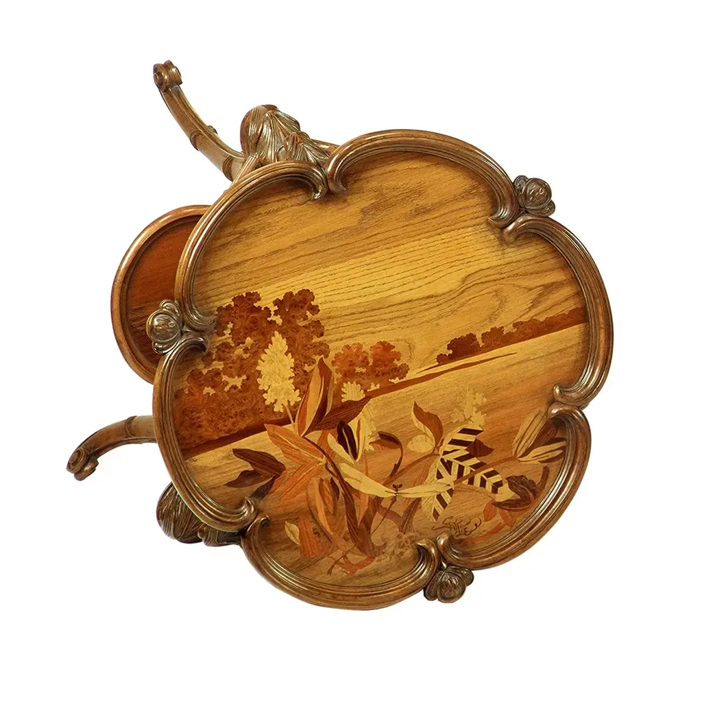 Actualization of a walk by the lake, this side table is originally designed by decorator Emile Gallè and impeccably reproduced down to the smallest detail. The three dragonfly-shaped legs - painstakingly carved by hand and fitted to a clover-like shelf - steal the scene from a distance, while a closer look allows one to appreciate the landscape inlaid into the top using exotic wood types.
