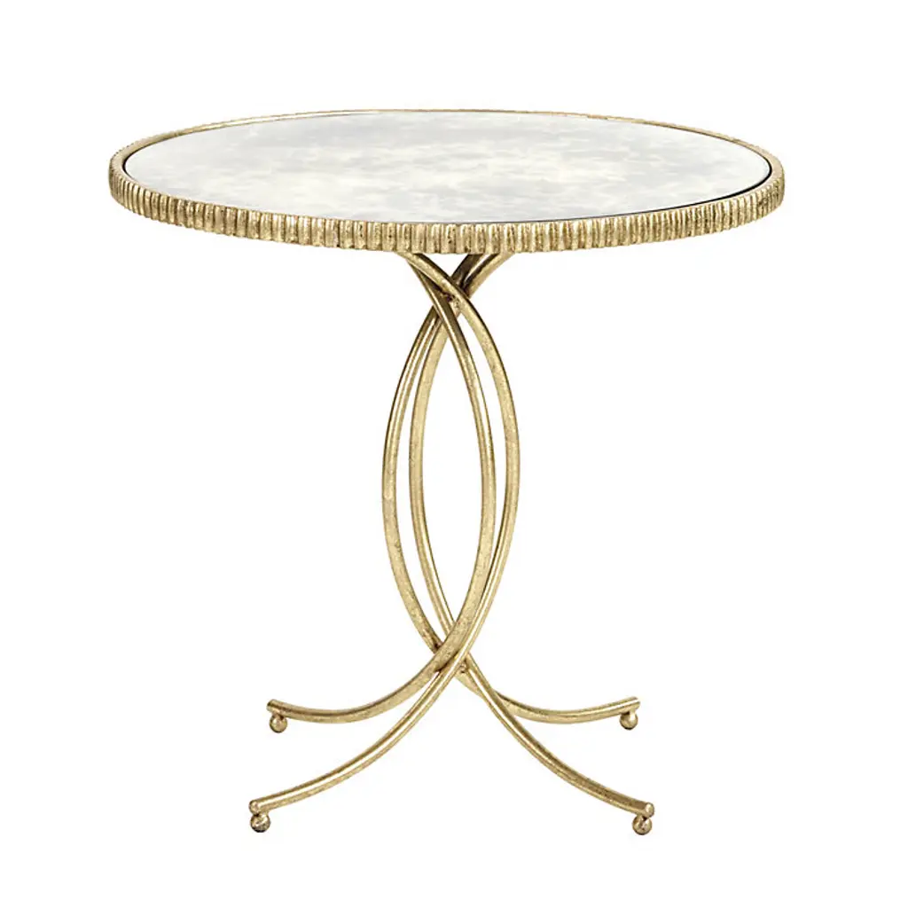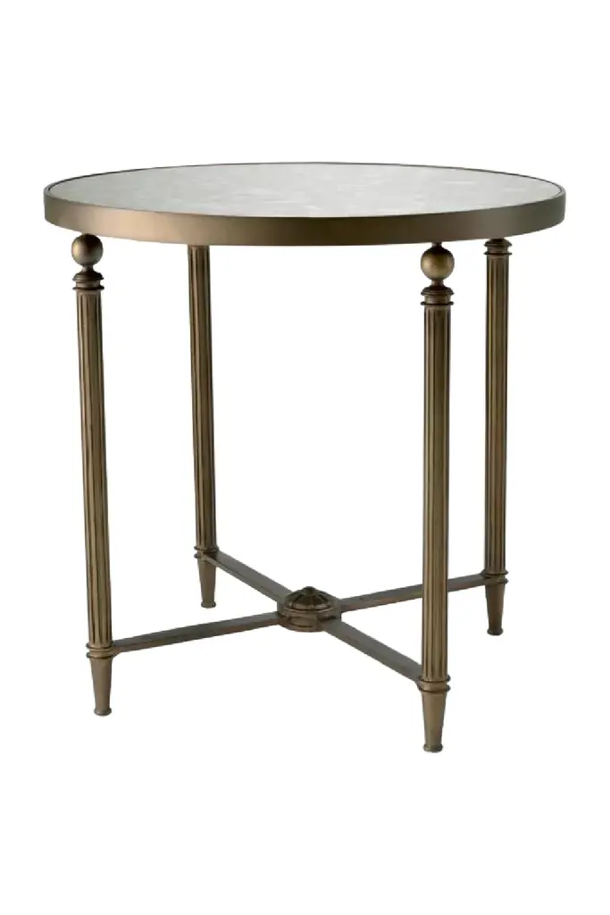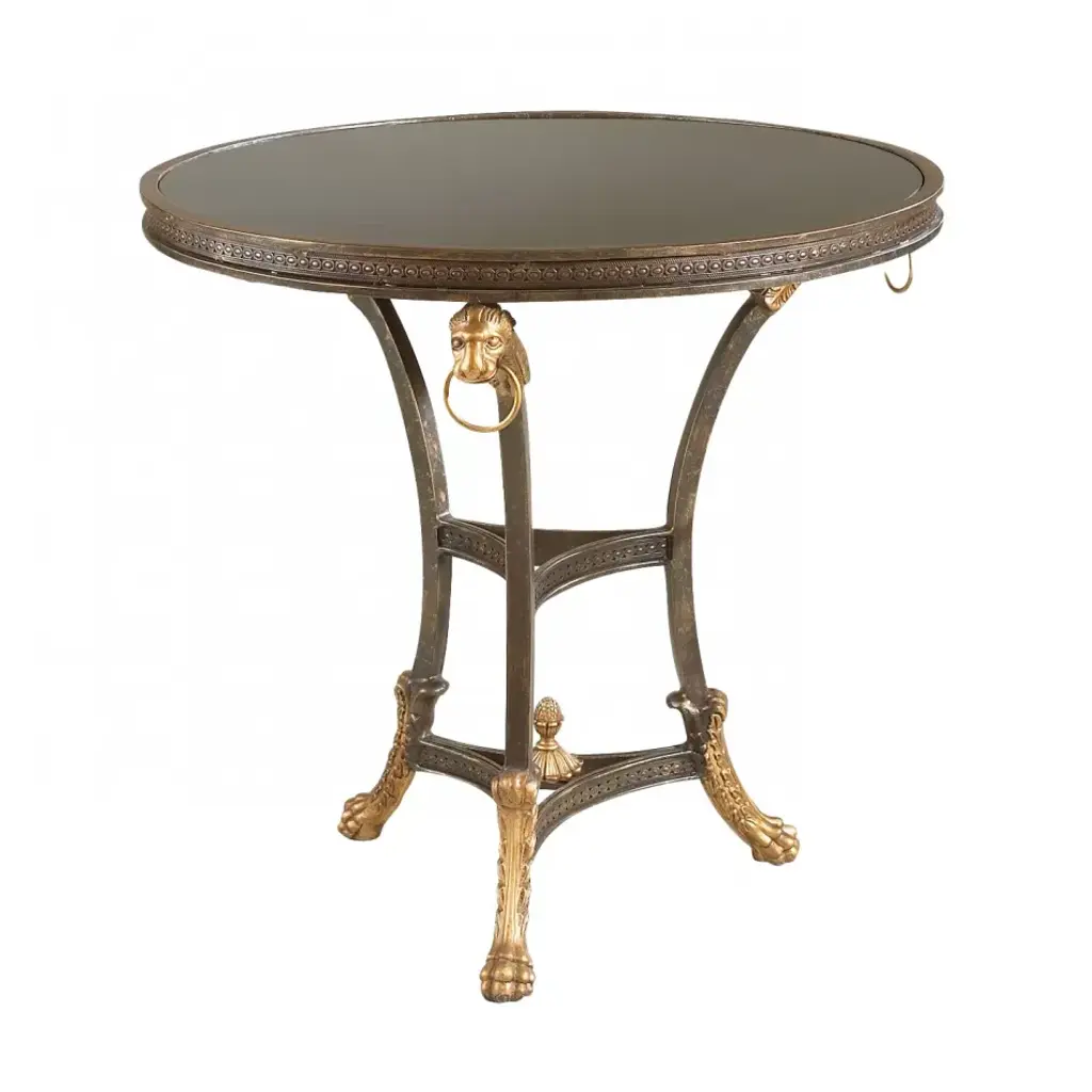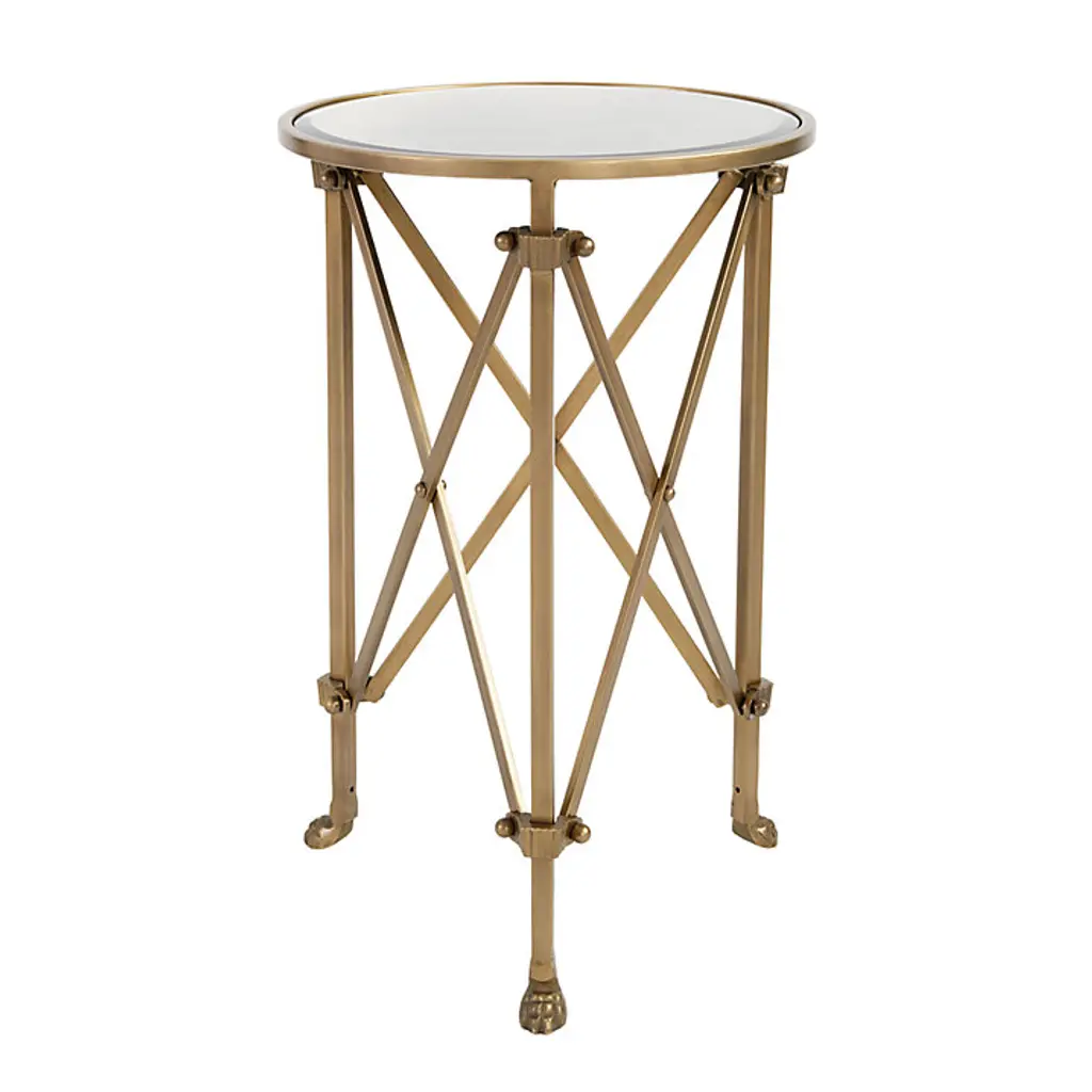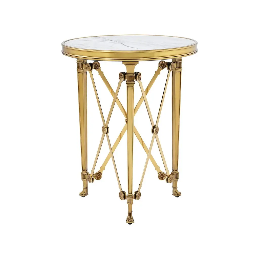Early 19th-century French design anchored by a quartz top with a refined moulded surround, this table balances classical elegance with luxurious materials. Its bold brass frame features cast tapering legs adorned with stylized paw feet—a hallmark of Empire aesthetics—offering a commanding presence with fine attention to sculptural detail.The X-frame stretcher adds structural harmony and is embellished with roundel medallions, reflecting neoclassical symmetry and decorative purpose. This table is an impeccable choice for interiors that seek a regal focal point while maintaining timeless sophistication. Dimensions: 18" W x 18" D x 22" H