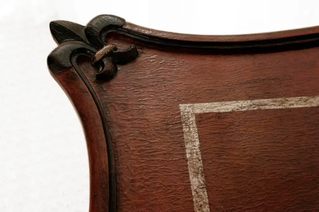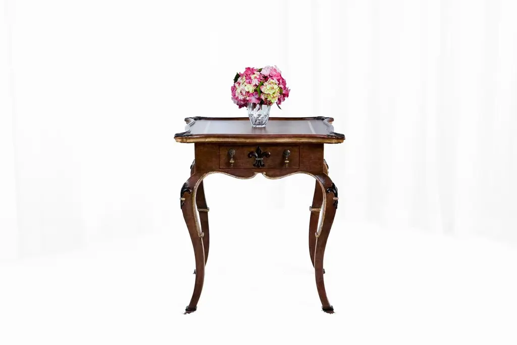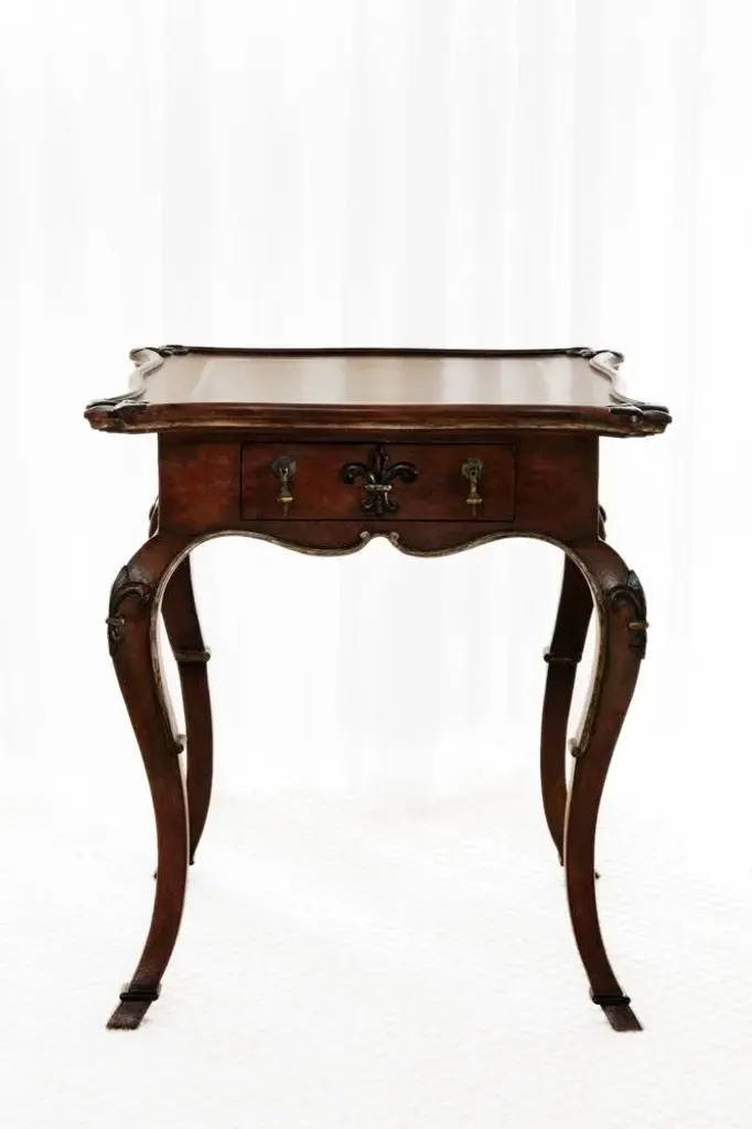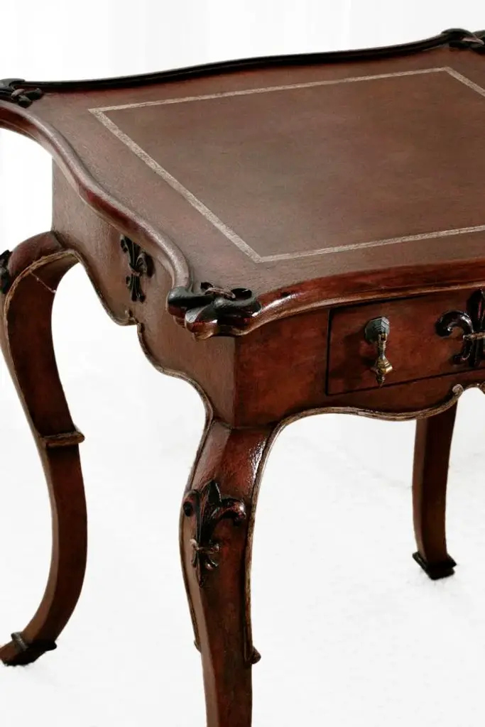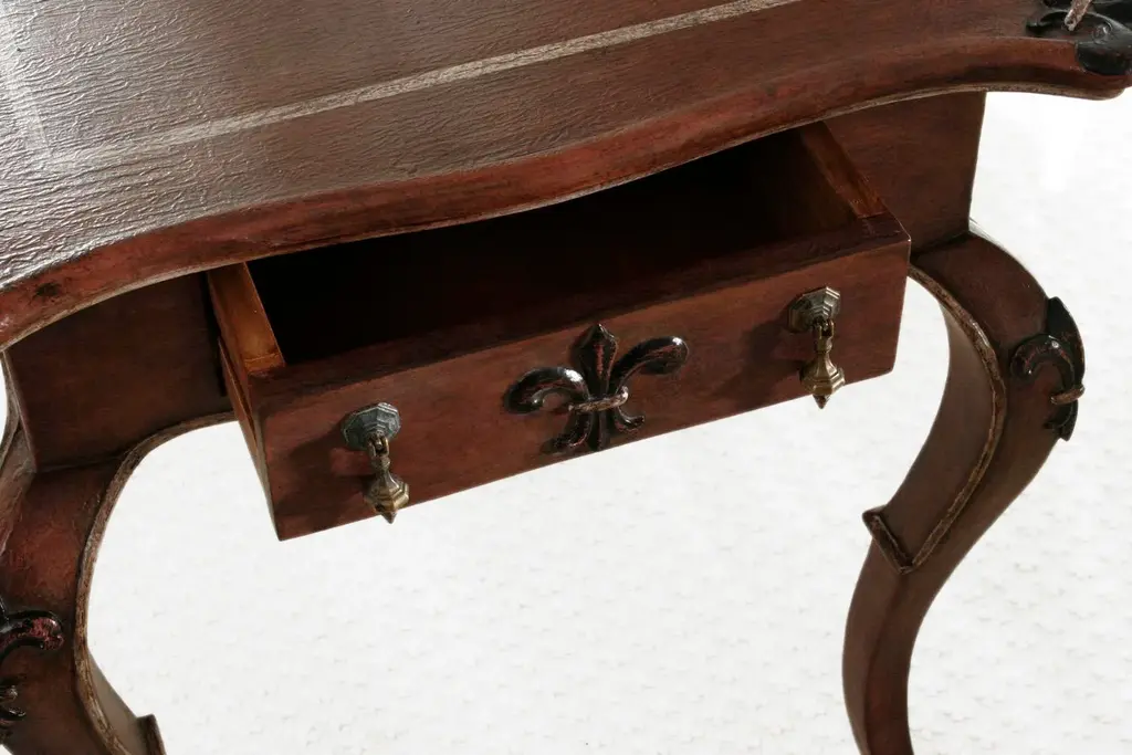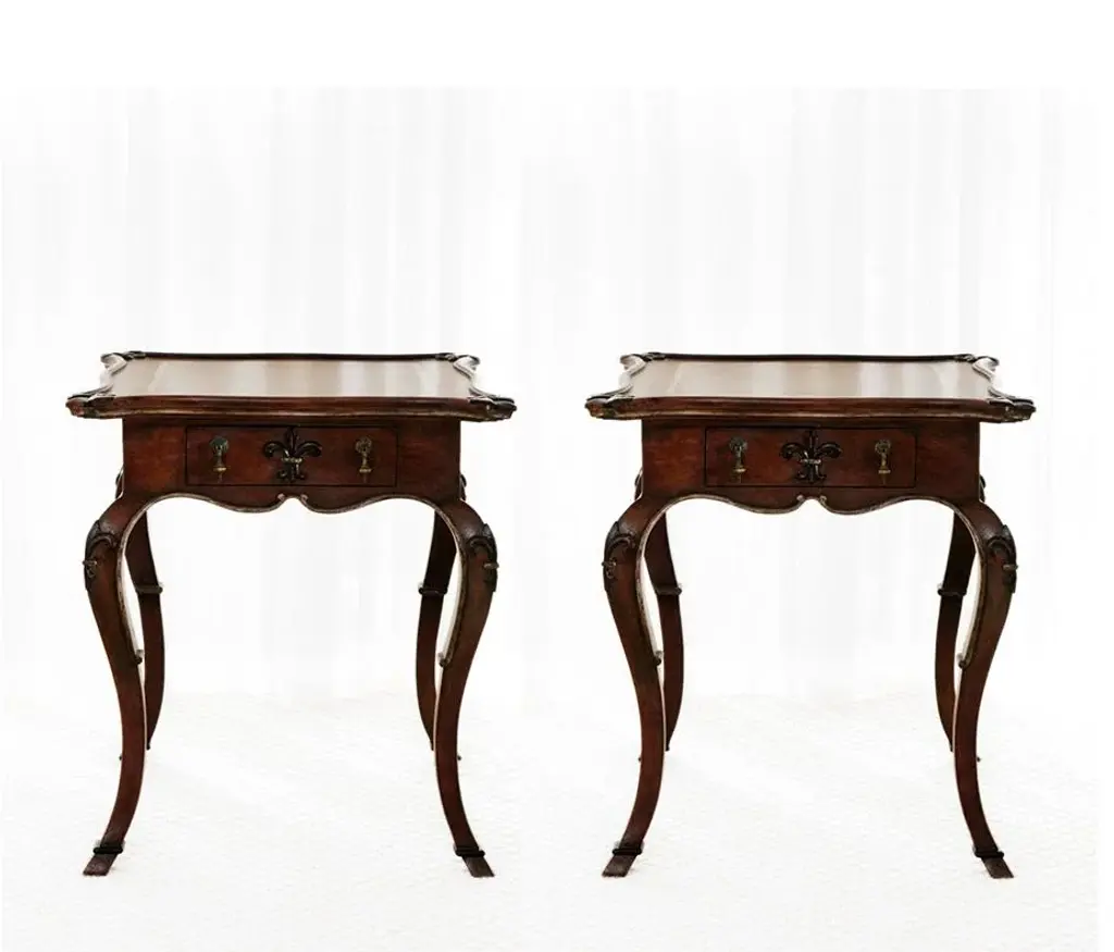 Created by Judson Rothschild for The Rothschild Collection - "Fleur-De-Lys" 2006 © Manufactured in American Hard Maple, with a patinated and polished burgundy-infused finish with ebonized and rubbed carved detail, with a serpentine-shaped square top with moulded edge, the outset corners carved with a fleur-de-lys, above a solid apron with a drawer to the front centering a fleur-de-lys flanked by cast-bronze drop pulls, over a waved apron, on hipped cabriole legs carved each with a further fleur-de-lys, ending in stylized hoof feet. This piece of "Art" may be utilized as a Side Table, Night Stand, or Accent Table. The Fleur-De-Lys symbol stands for royalty, power, honor, grandeur, faith, and unity. A stylized Lily/European Iris - There are many Fleur-De-Lys' to appreciate on this lovely table. Perfect as a side table, or as a nightstand where space is an issue.
