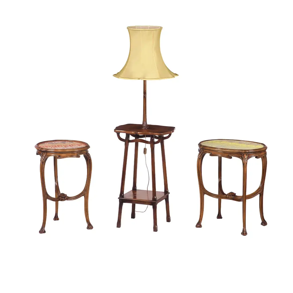 Distinguished by sleek rounded lines, this precious side table is a flawless reproduction of an original French Liberty design from the 1880-1915 period. Fashioned of hand-carved wood, it is completed with a prestigious fabric top covered with a crystal layer. Please contact the Concierge for further details and care instructions.