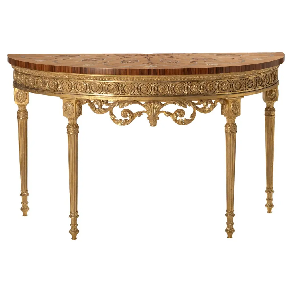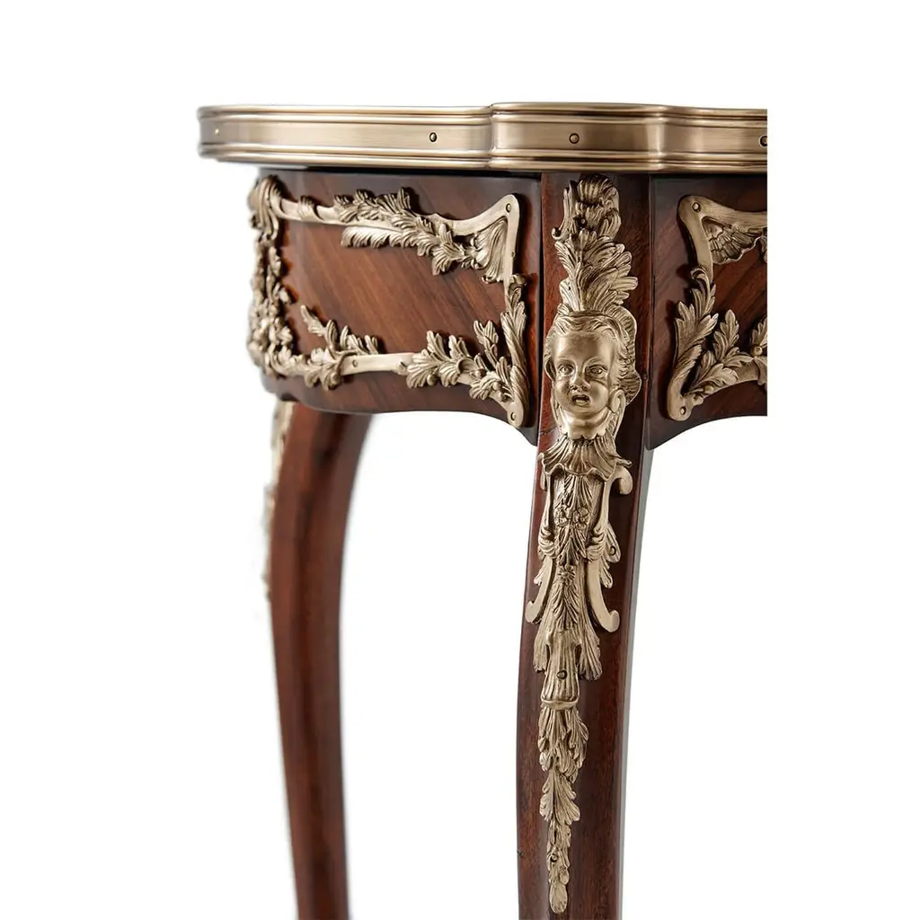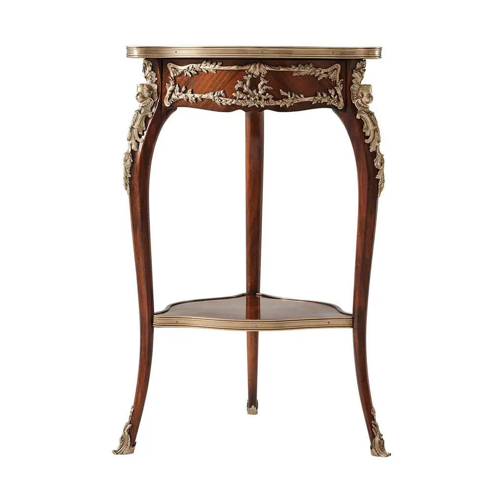 A French Louis XV style mahogany and ormolu mounted occasional table, the brass bound shaped three-sided table top above a rosewood veneered frieze enclosed by foliate mounts, on three cabriole legs with caryatid mounts terminating in sabots, united by a shaped under tier. The original Louis XV, circa 1770.Dimensions: 17.75" W x 18" D x 29" H.