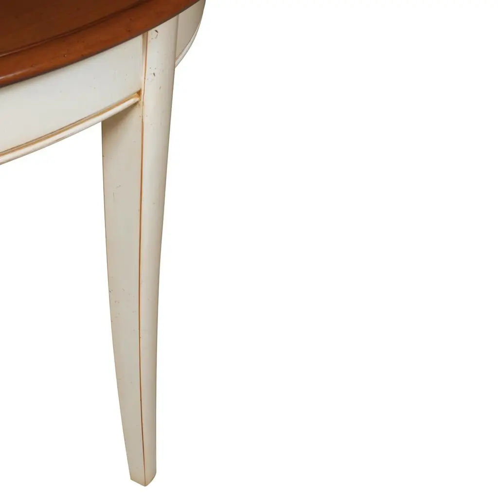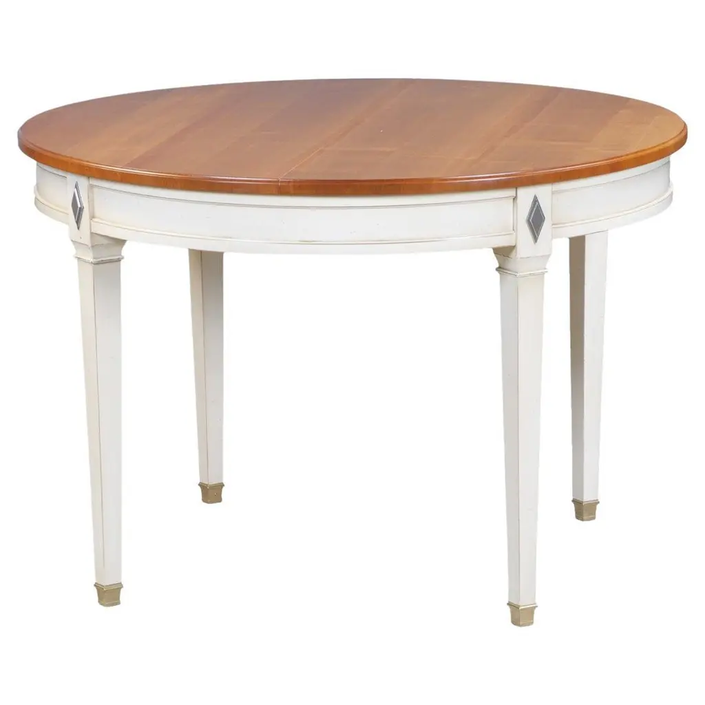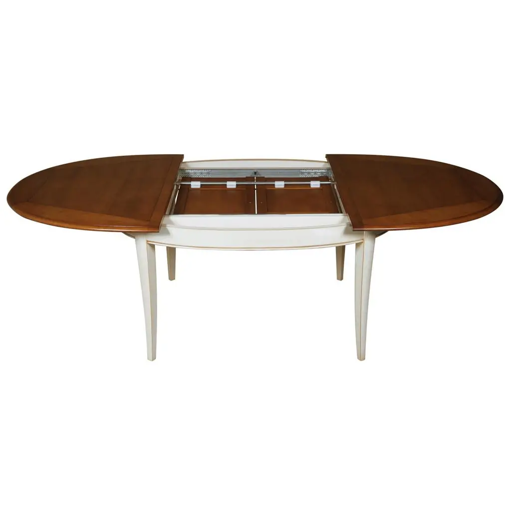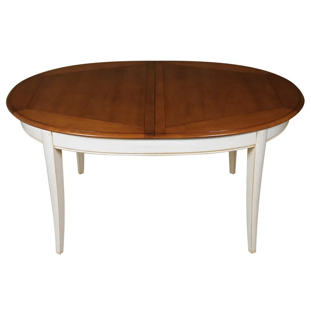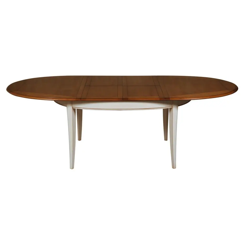 This 2 leaves extensible oval table is typical of French classical furniture pieces and belongs to our TRADITION collection which takes up the timeless classics of the charm of the French countryside.The pilasters, the grooves and the saber legs for the tables are characteristic of this collection. The woodwork remains traditional with tenons and mortises.2 integrated leaves of 40 cm / 15.7" each are folded under the table top.The table opens in the middle. To release and unfold the leaves, first unlock the brake under the top, then pull out one side of the top. The other side of the top will open synchroneously without any effort. This table accomodates 6 guests without the leaves and 8/10 guests with 2 leaves.The height under the skirt is 64 cm / 25.2". The finish we propose here is a classical cherry stain for the top and the 2 extensions with a white cream lacquer for the base and skirt.You can choose another finish, we do bespoke.GONTIERis a cabinetmaker's furniture brand established since 1920 in Mayenne, France.It now belongs to the company MON PETIT MEUBLE FRANÇAIS.The manufacture of each piece of furniture remains artisanal, 100% French and of very high quality.The solid wood comes from sustainably managed and PEFC-certified French forests.We offer a 5 year warranty on every piece of furniture.As proof of their authenticity and uniqueness, our furniture is burnt with a "G" hallmark.