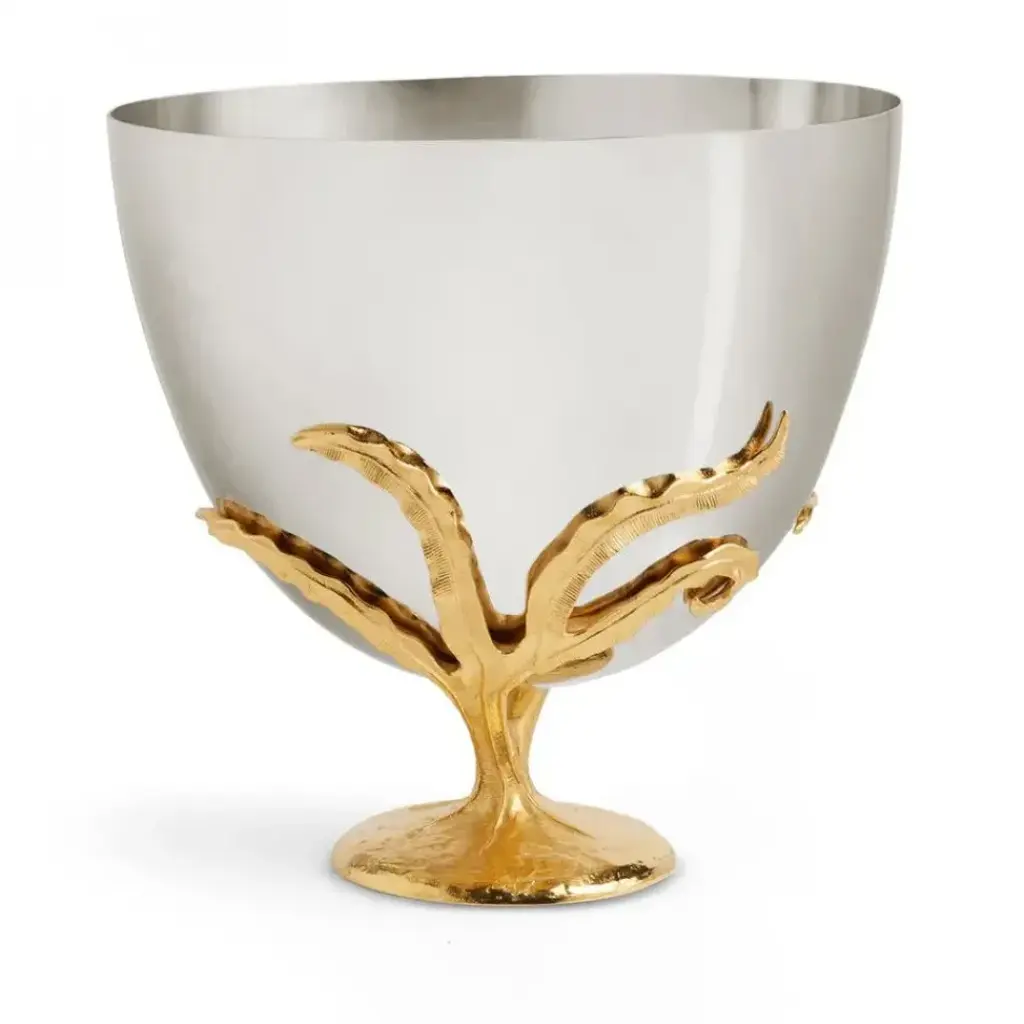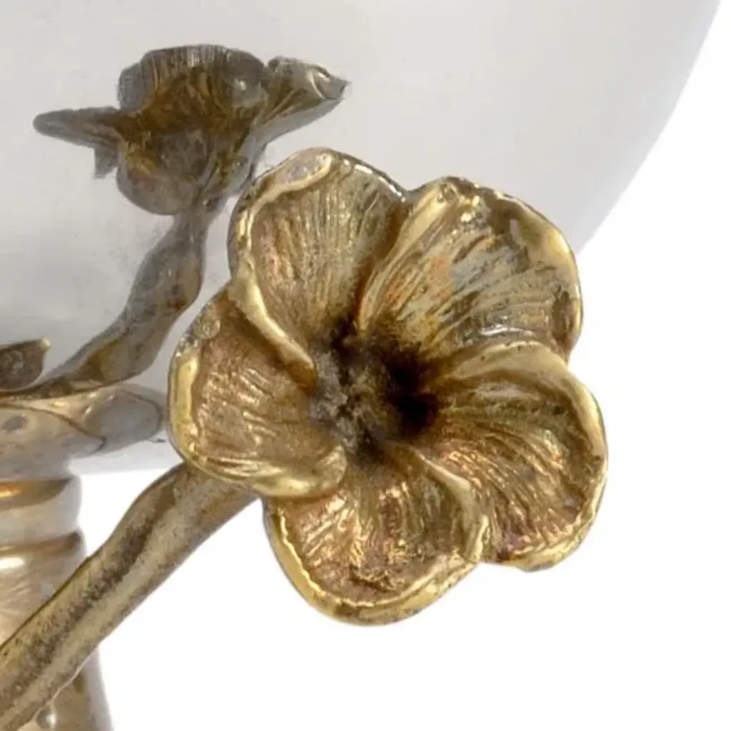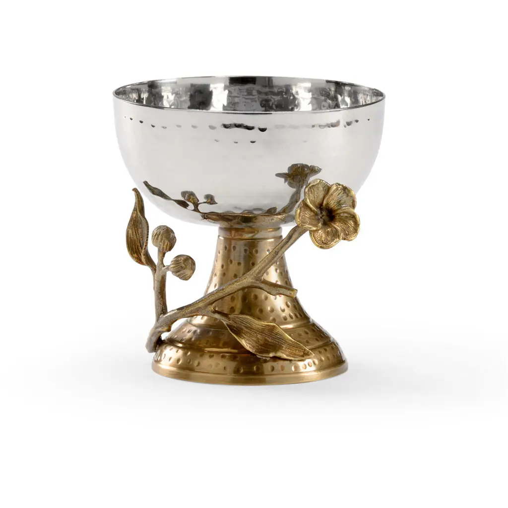 Beautiful hammered stainless steel bowl with an antique brass pedestal and sculpted orchid. The exquisite details make this accent bowl ideal as a stand alone or as a candy dish on a console in the entryway or accent table in the living area. For decoration only.